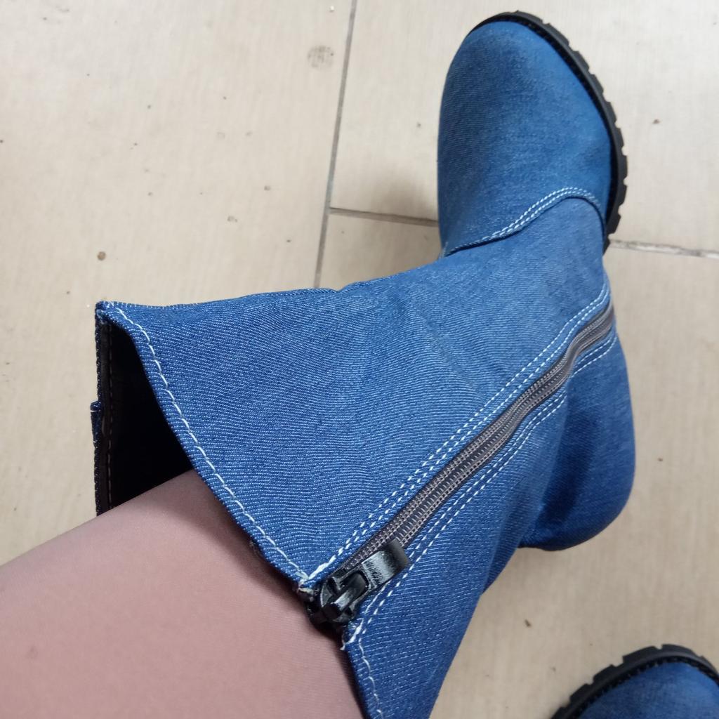 Women's Denim Boots Side Zipper Cowboy Boots Ladies Chunky High Heel Mid Calf Boots Female Casual Autumn Winter Boots Zapatos De Mujer