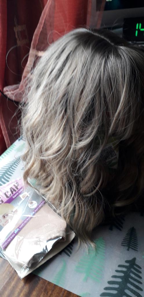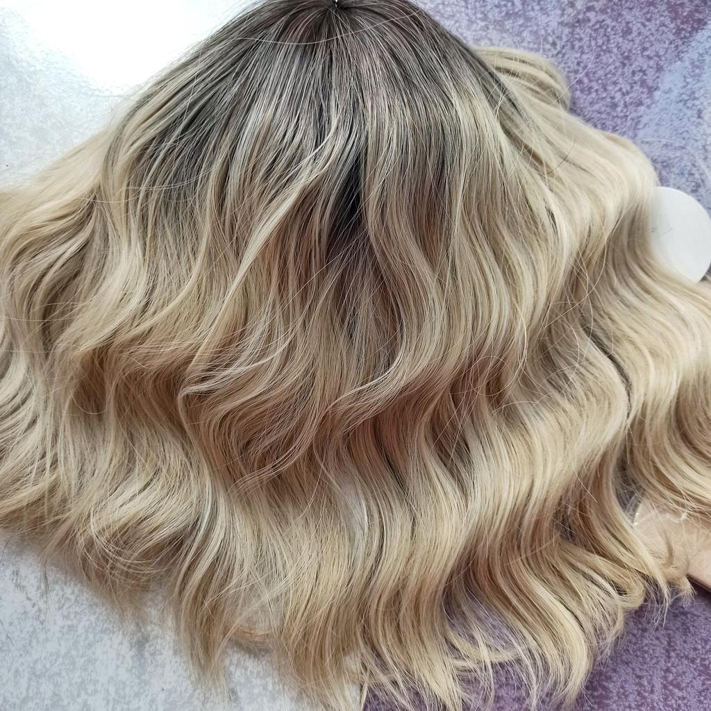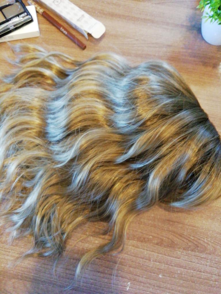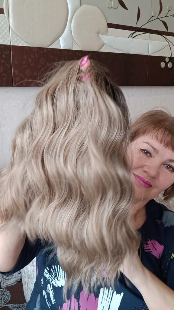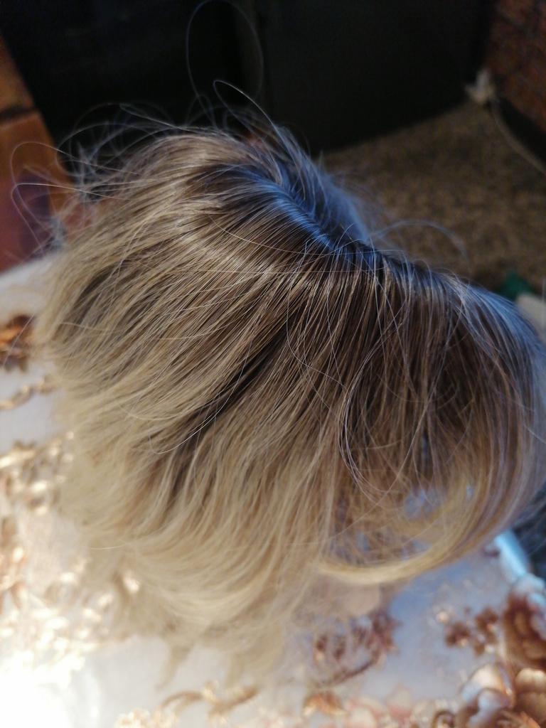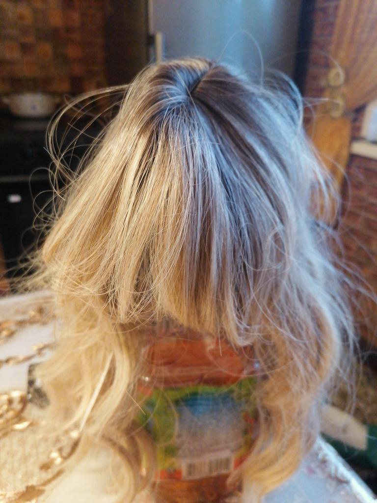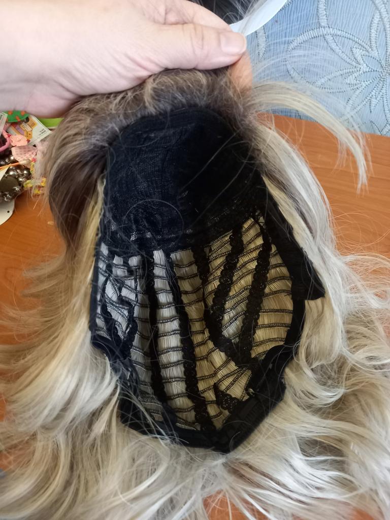 I received the parcel, the wig is pleasant to the touch, the hair looks like natural hair, good quality. The downside is that the hair falls out a lot. The top is jet black, I expected it to be lighter, the main color is a very beautiful blond. In general, the wig is not bad for experiments just right.)