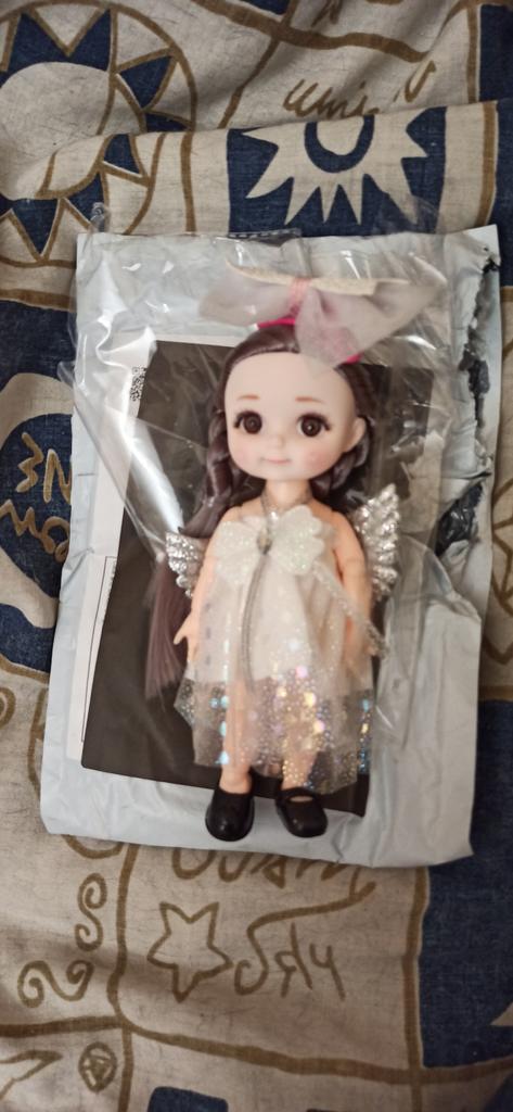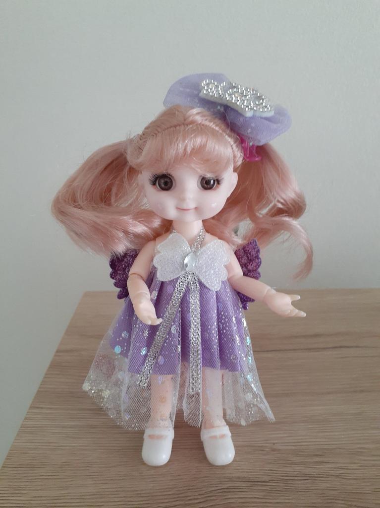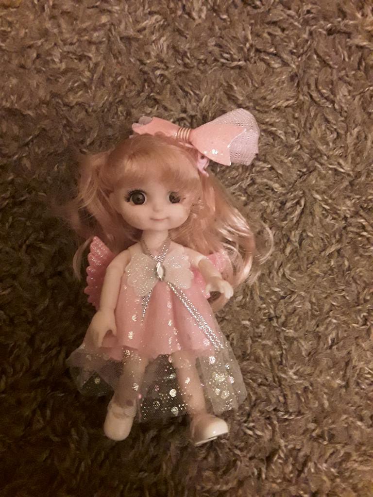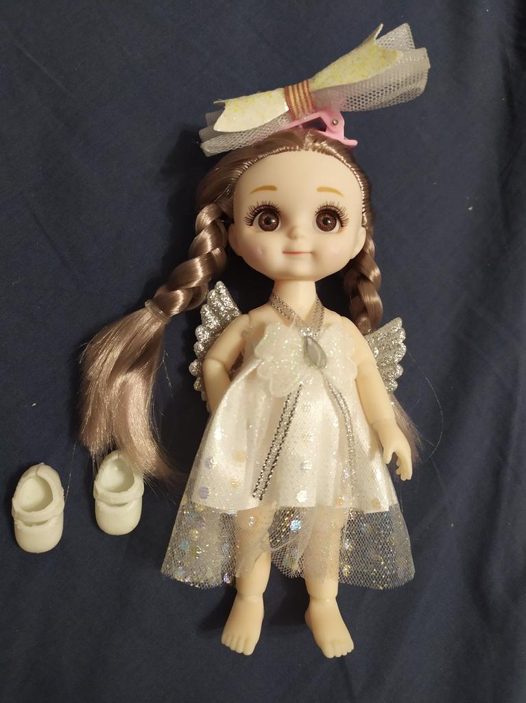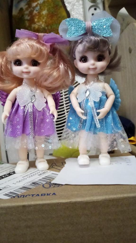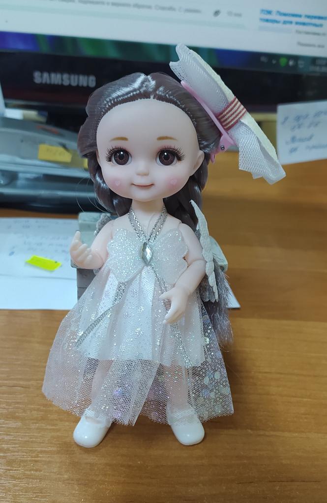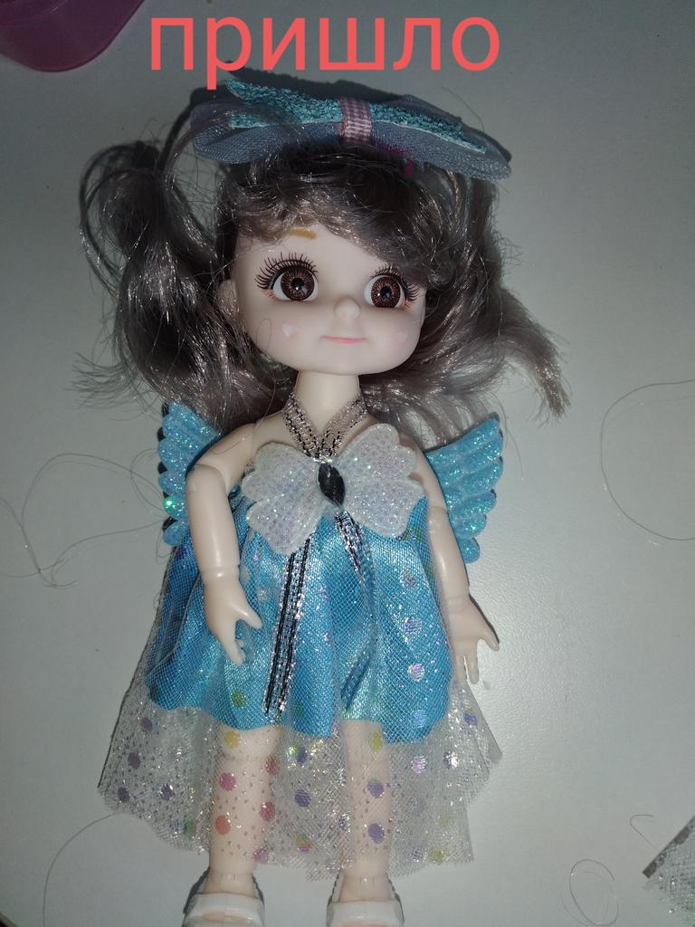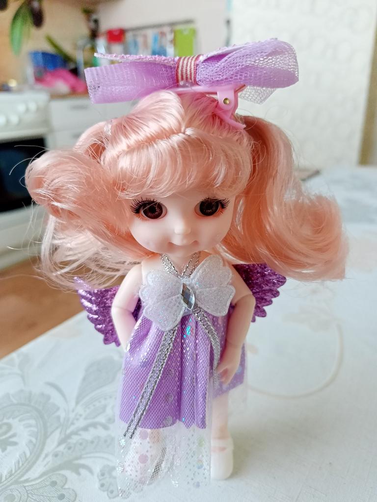 Sweet little doll! The hinges are good, the clothes too, the smell is insignificant, it fixes well in poses, stands confidently, the hair stitching is average. Includes a dress with wings, a hair clip with a bow, shoes. Definitely recommend!