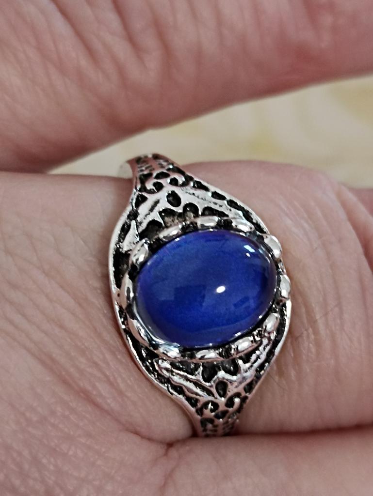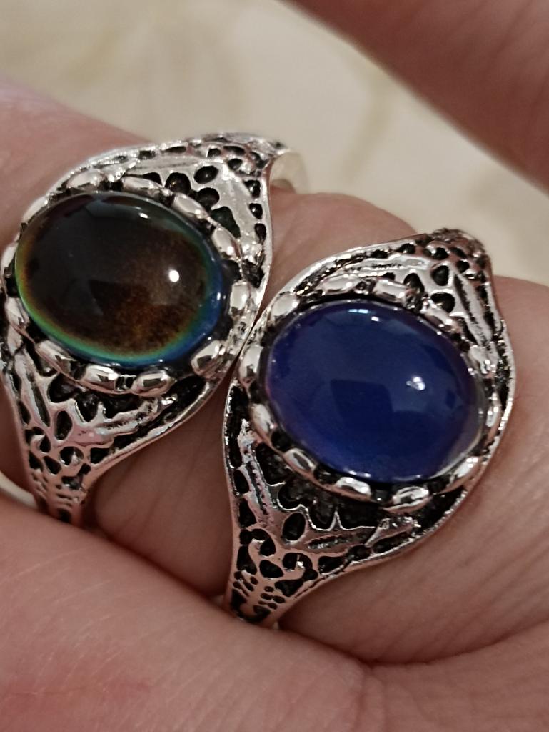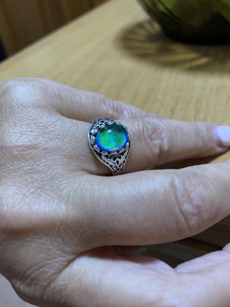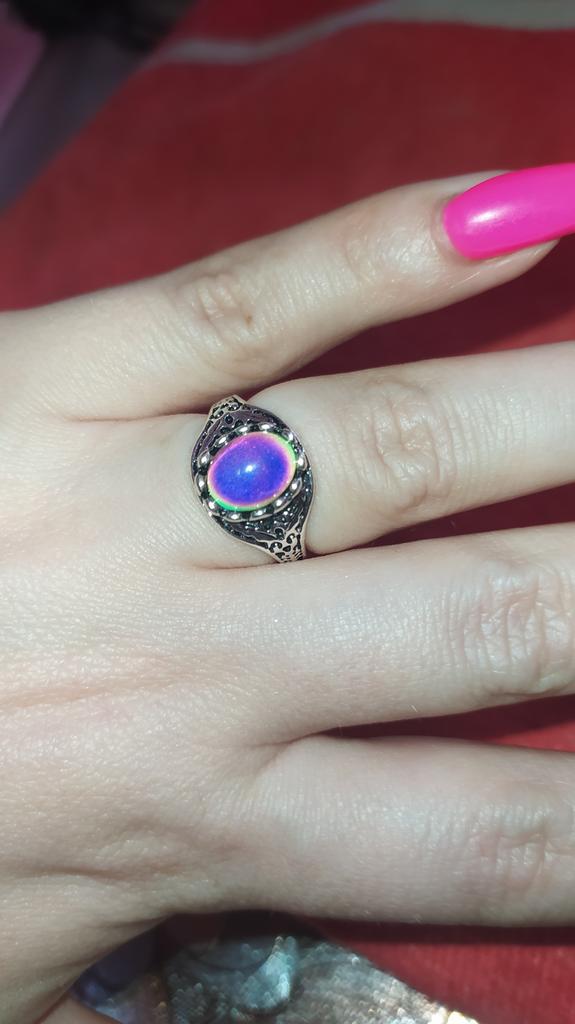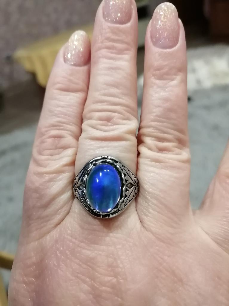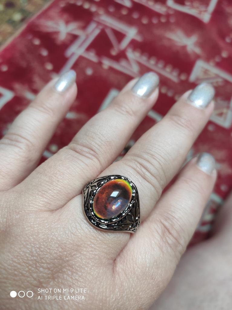 An interesting ring that changes color depending on temperature and lighting. The frame is beautiful, carved. The size matches exactly. Looks very nice! I like it. Thank you very much!!!