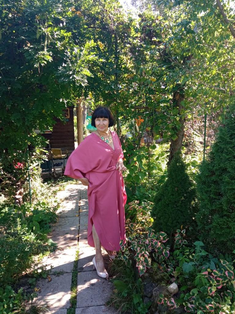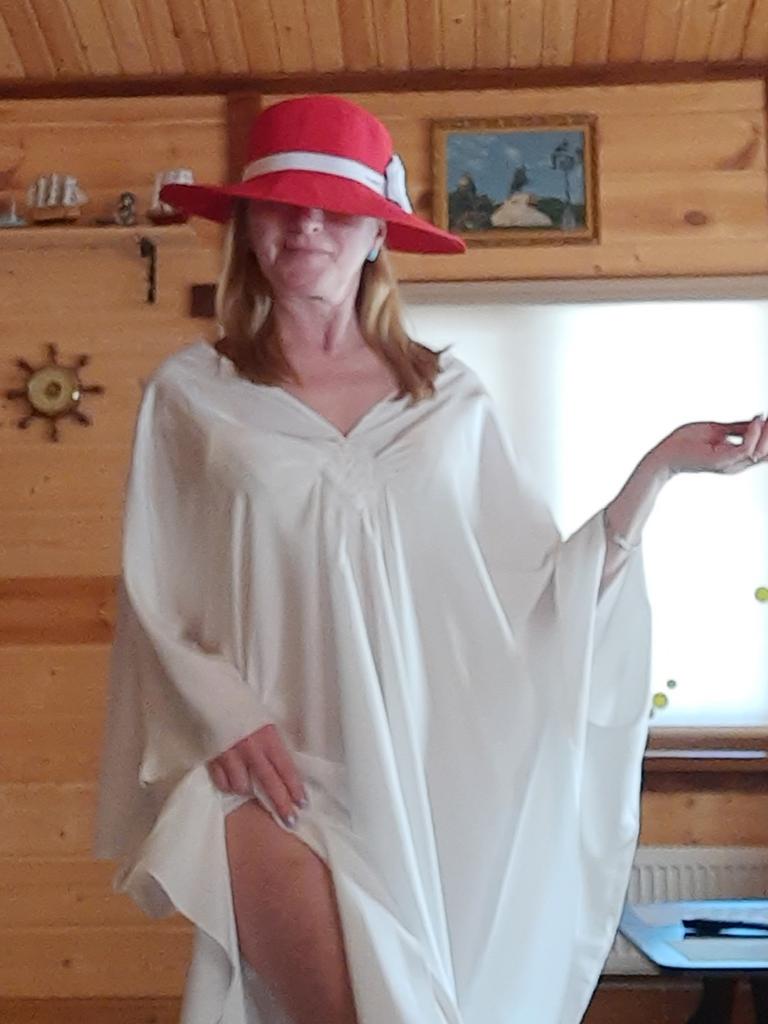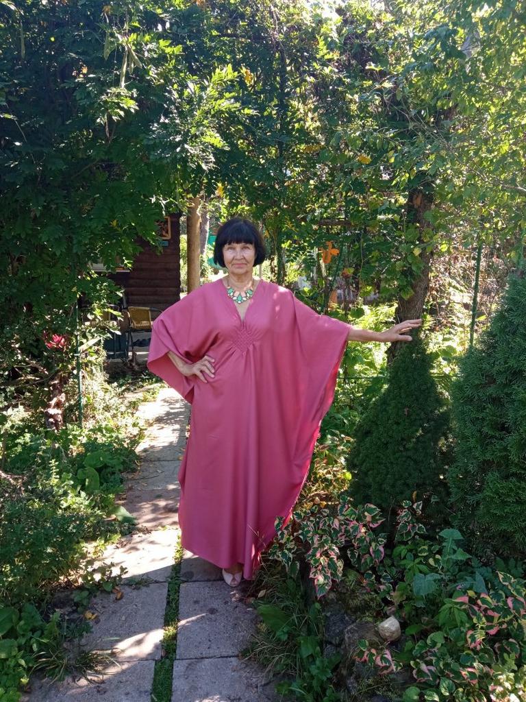 This is my 5th dress of this style. Because of the colors, everyone looks different. It hides curvy shapes perfectly. Fits sizes 56 to 64