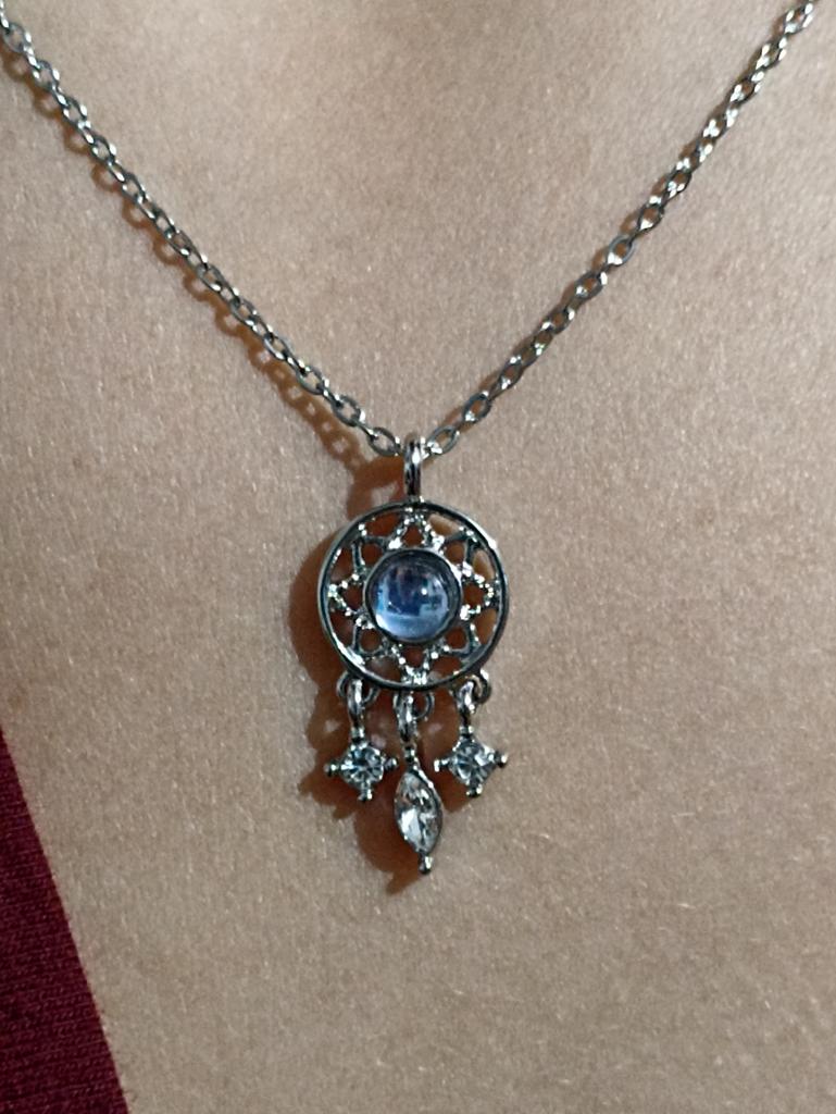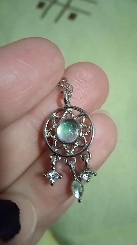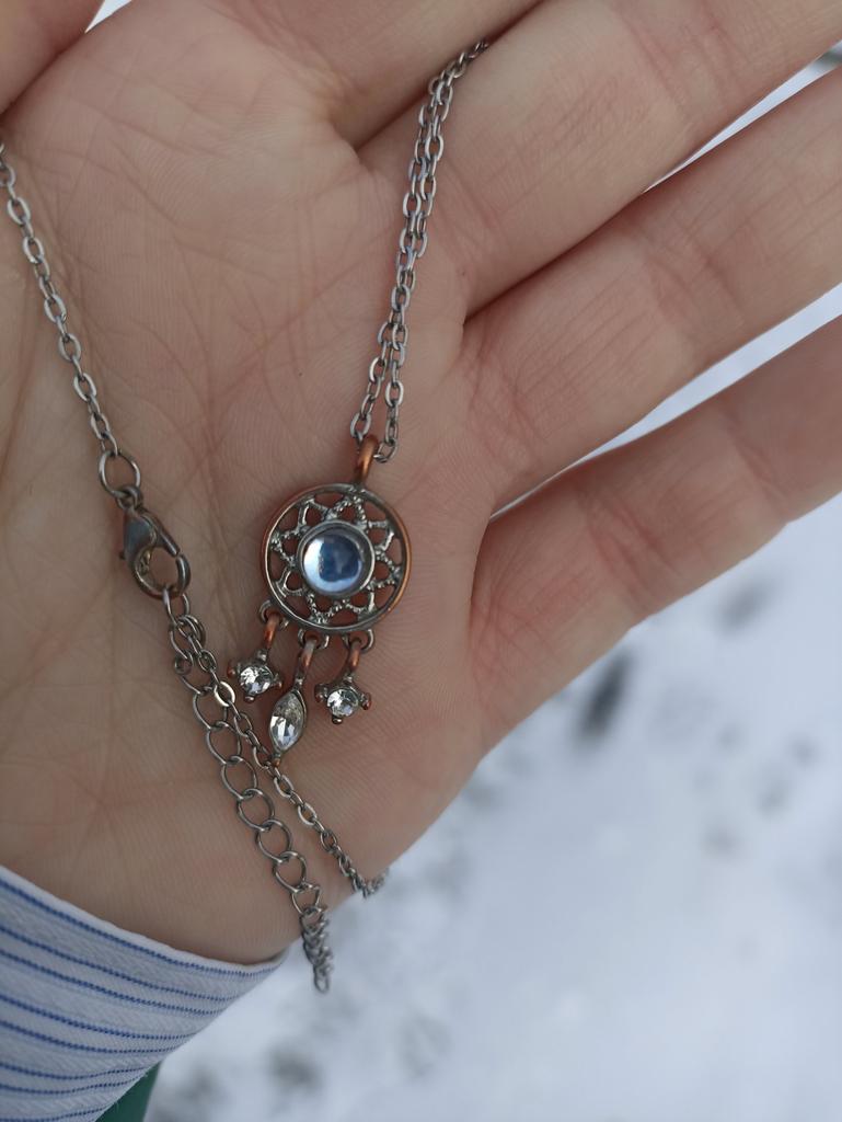Pendant in the form of a dream catcher of silver color. Ordered as a set for a bracelet. In the middle there is a small stone of pale blue color, without defects.