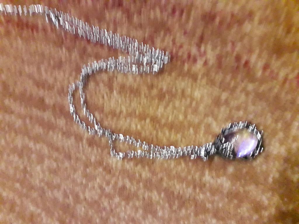 A beautiful necklace with a clear purple stone.