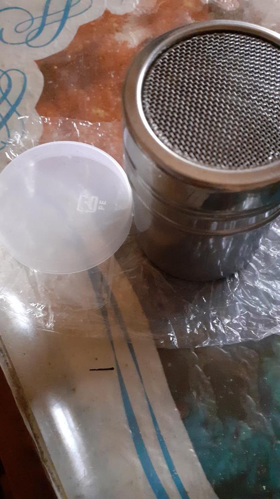 The top of the container is slightly bent, so it's difficult to screw on and off, but overall it's okay. I've already poured the powdered sugar into it, it's good that there's a lid.