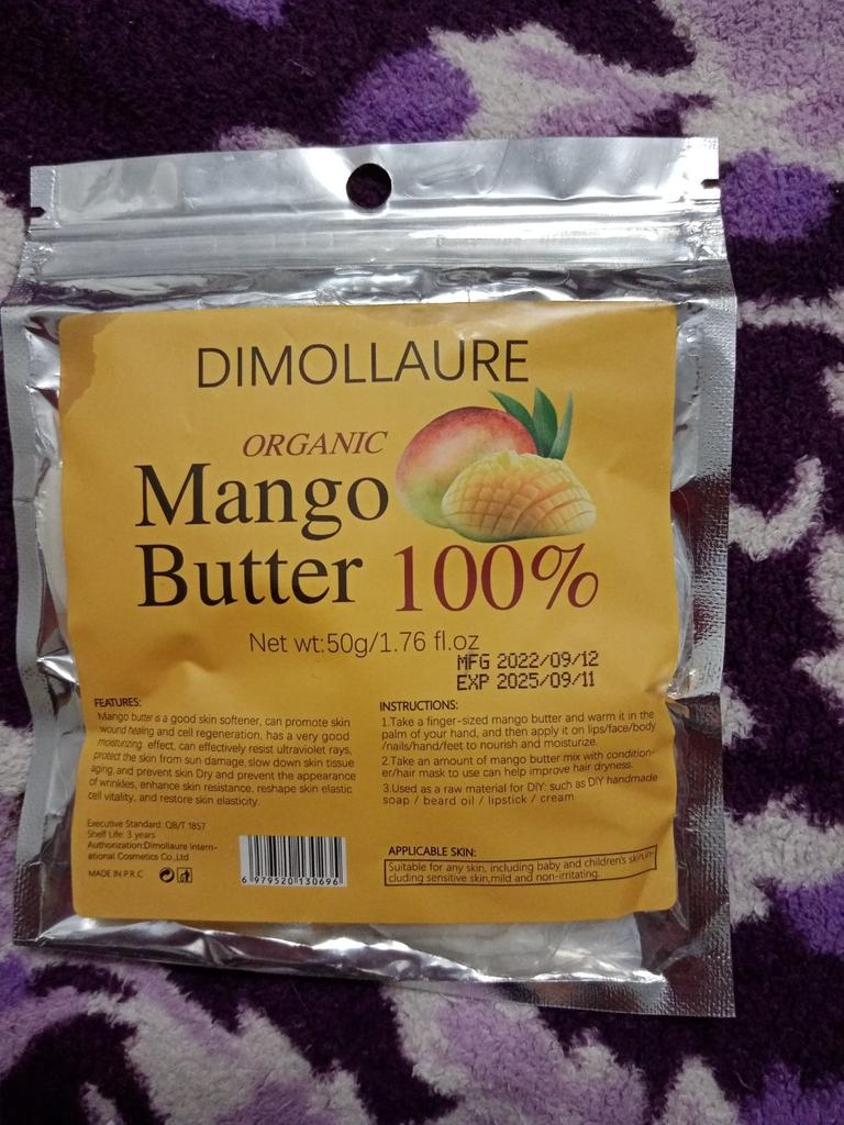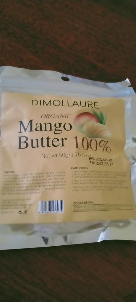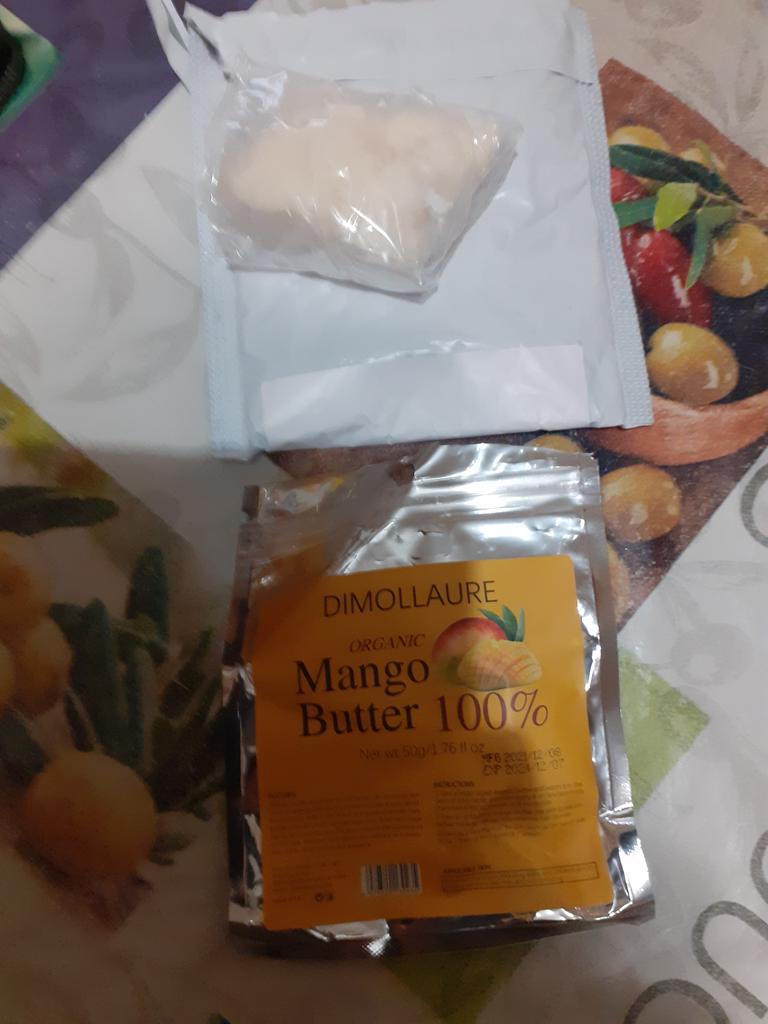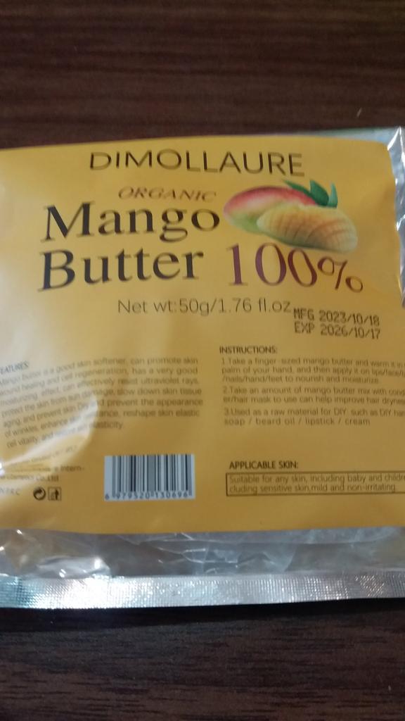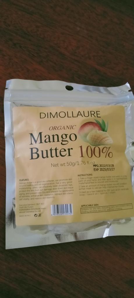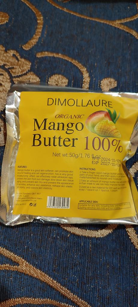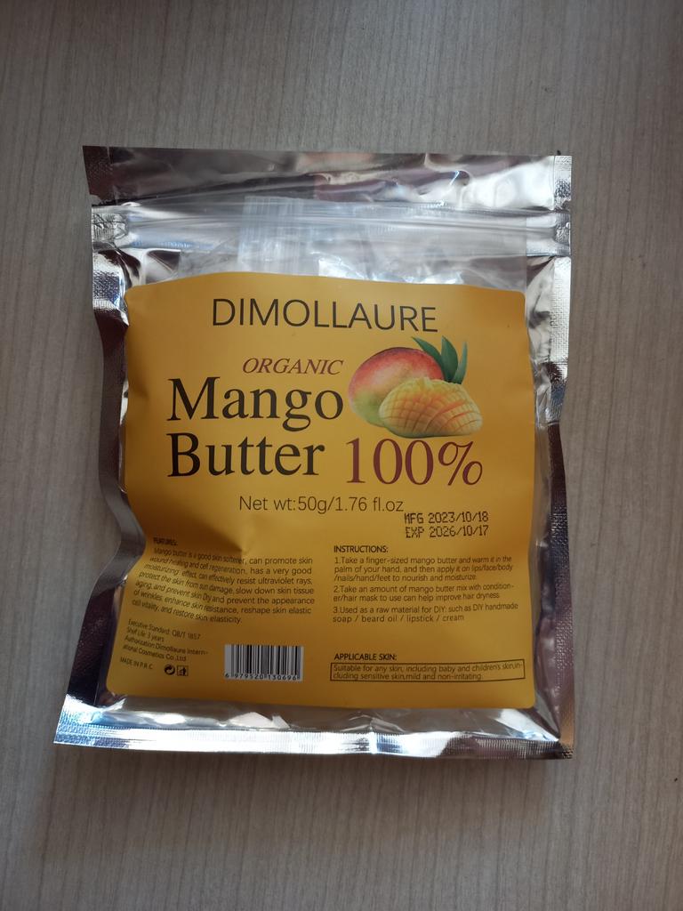 Organic mango butter, not yet used, volume 50 g, smells a little mango. I will probably add it to creams for more hydration.