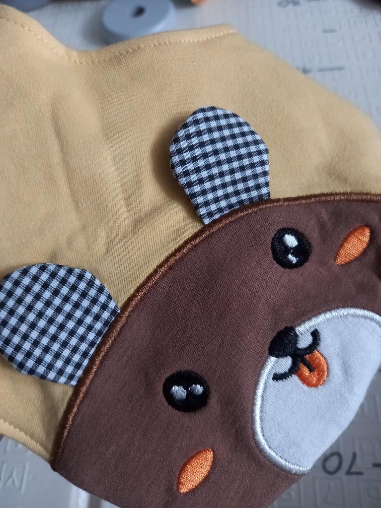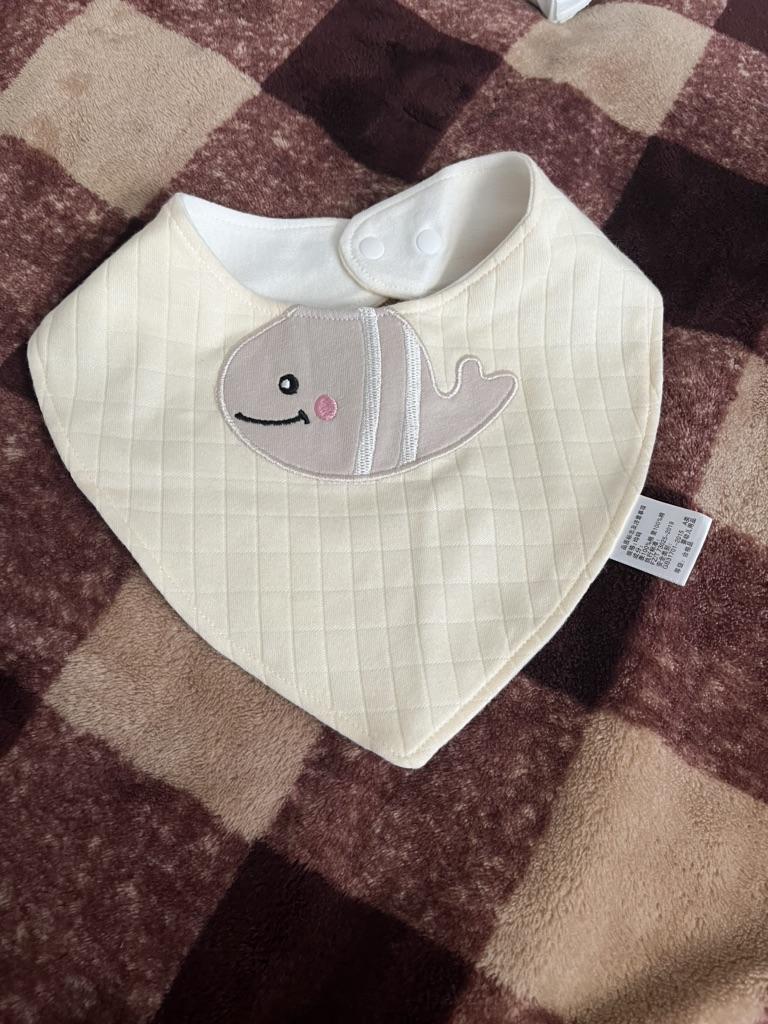 For our second little one we bought this cute bib. The button-fastener works. The cartoon character is pleasing. The quality is excellent.