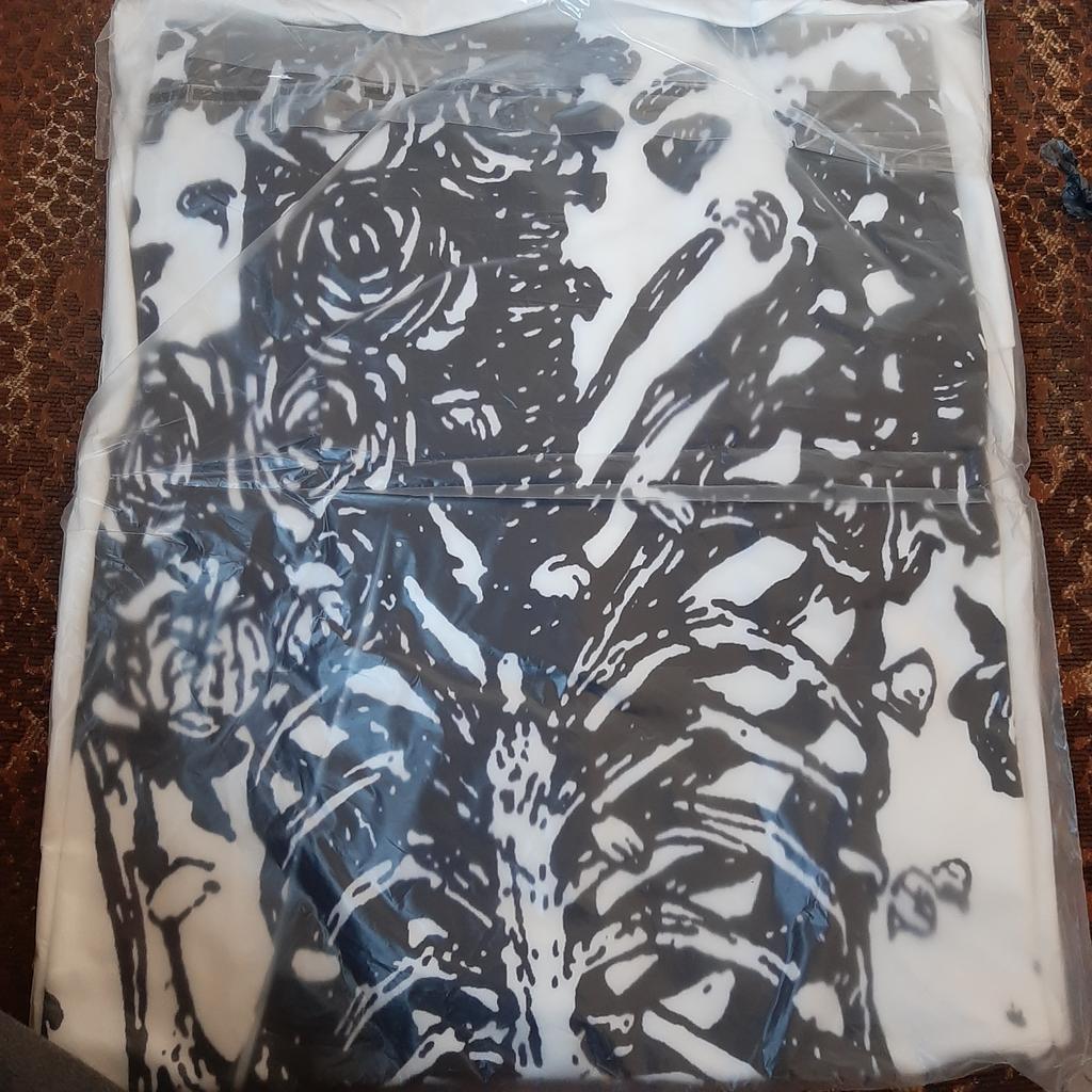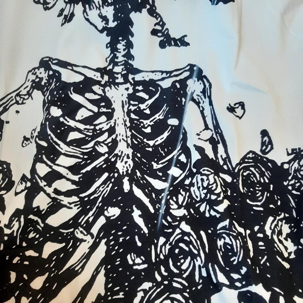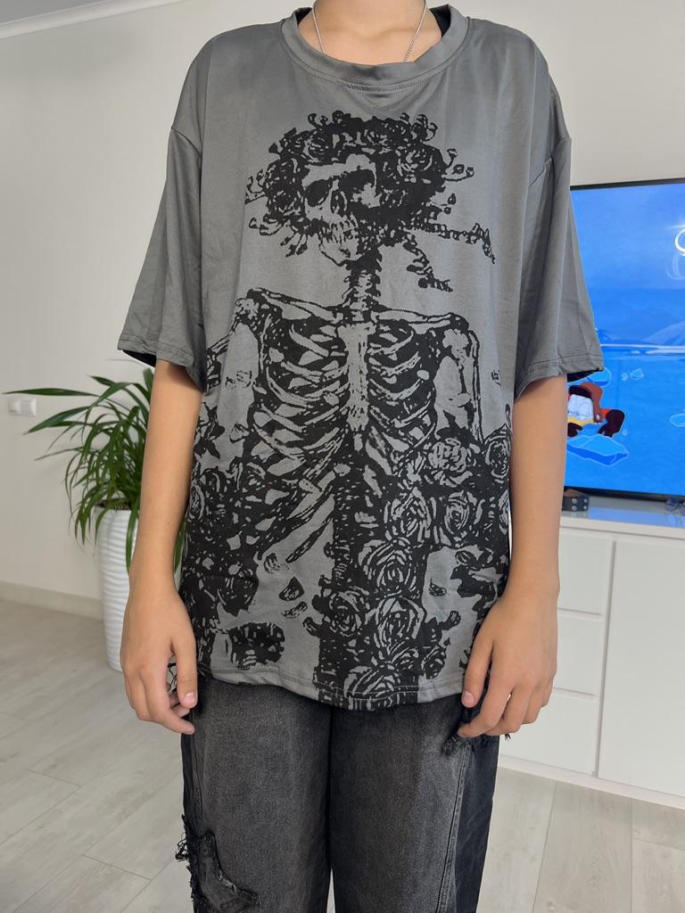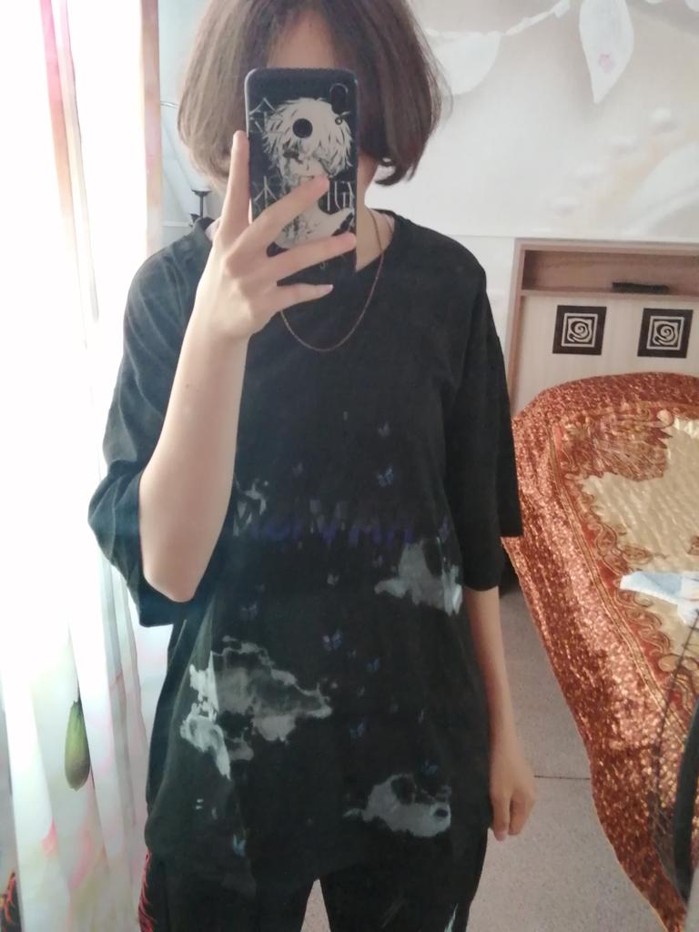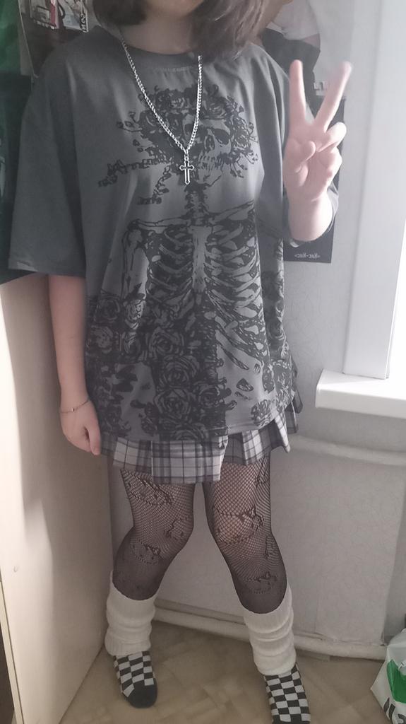 The t-shirt is shorter than in the original photo, but maybe it's the size I ordered. In the photo I took, it's lighter, but in real life it's darker. The material is soft and pleasant to the touch. The picture doesn't match the seams of the t-shirt, but overall it's cool.