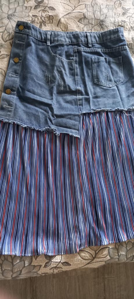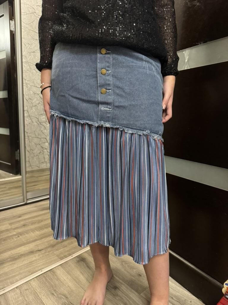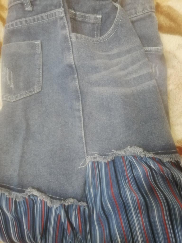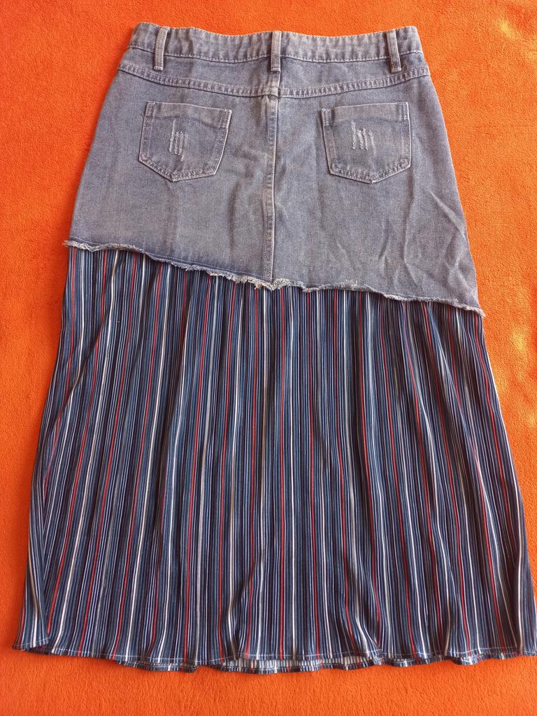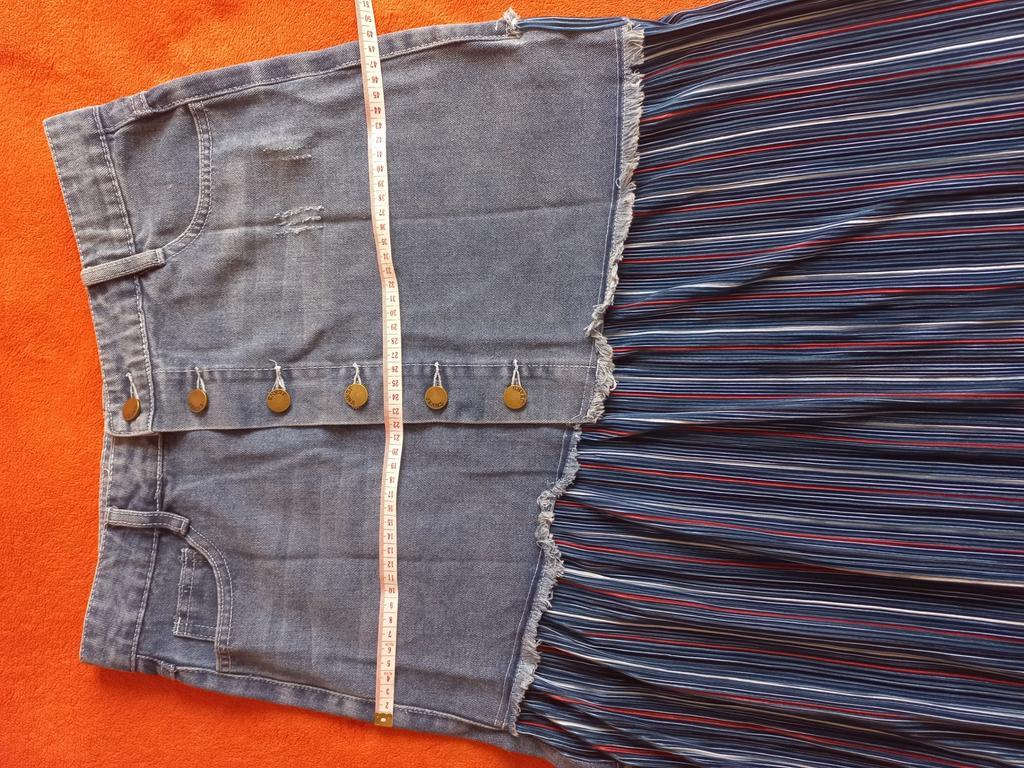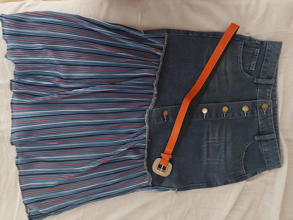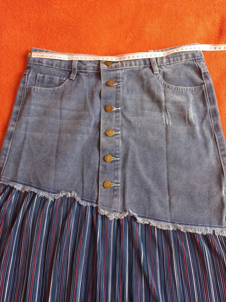 The skirt is great, but I need to work on it. The waist is not the right size. The quality is very good, denim on top, pleated faux fabric on the bottom. Thank you!