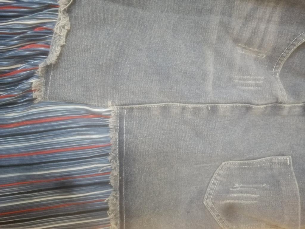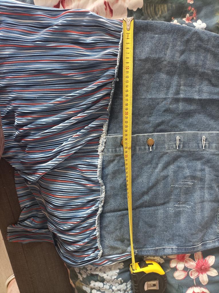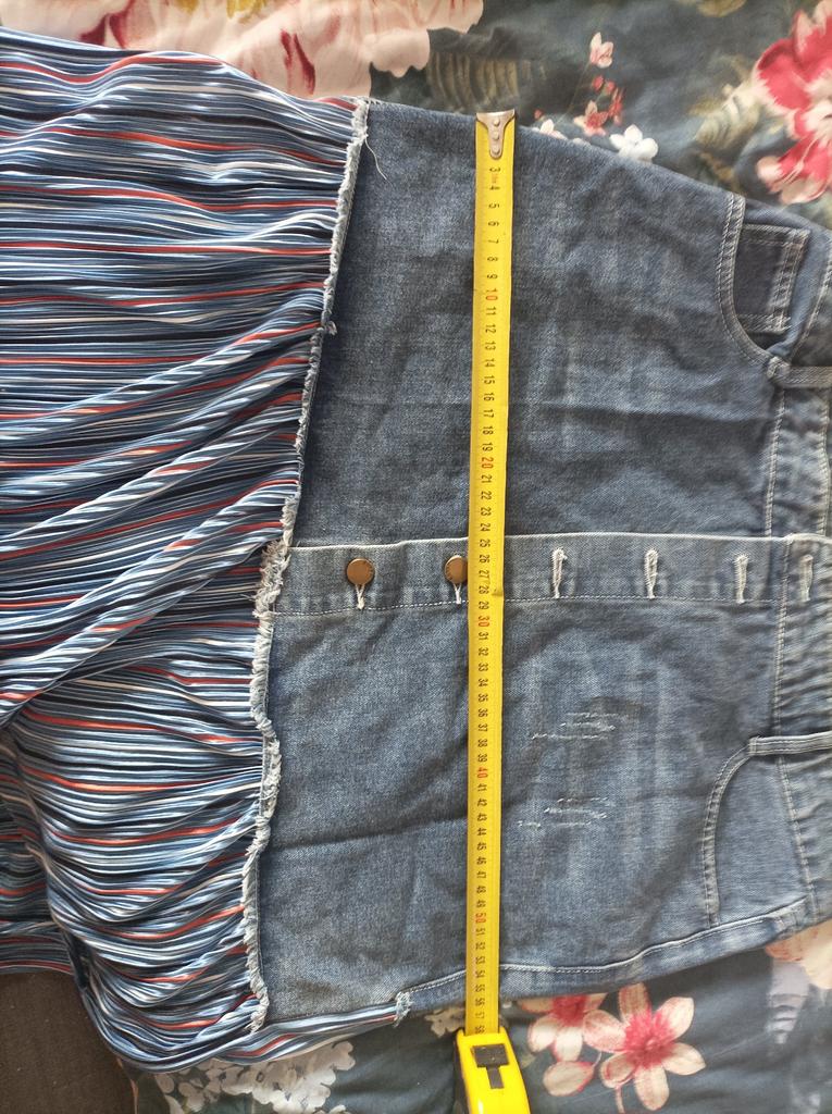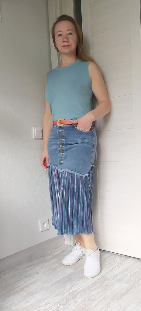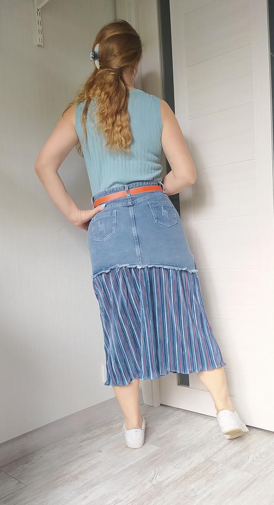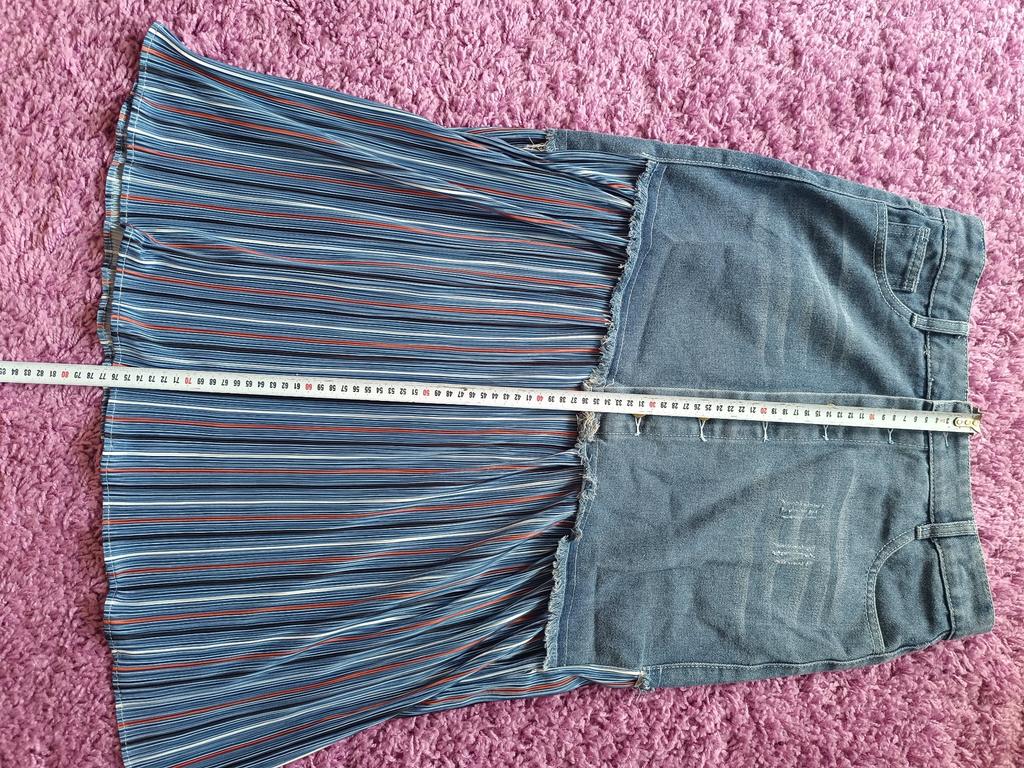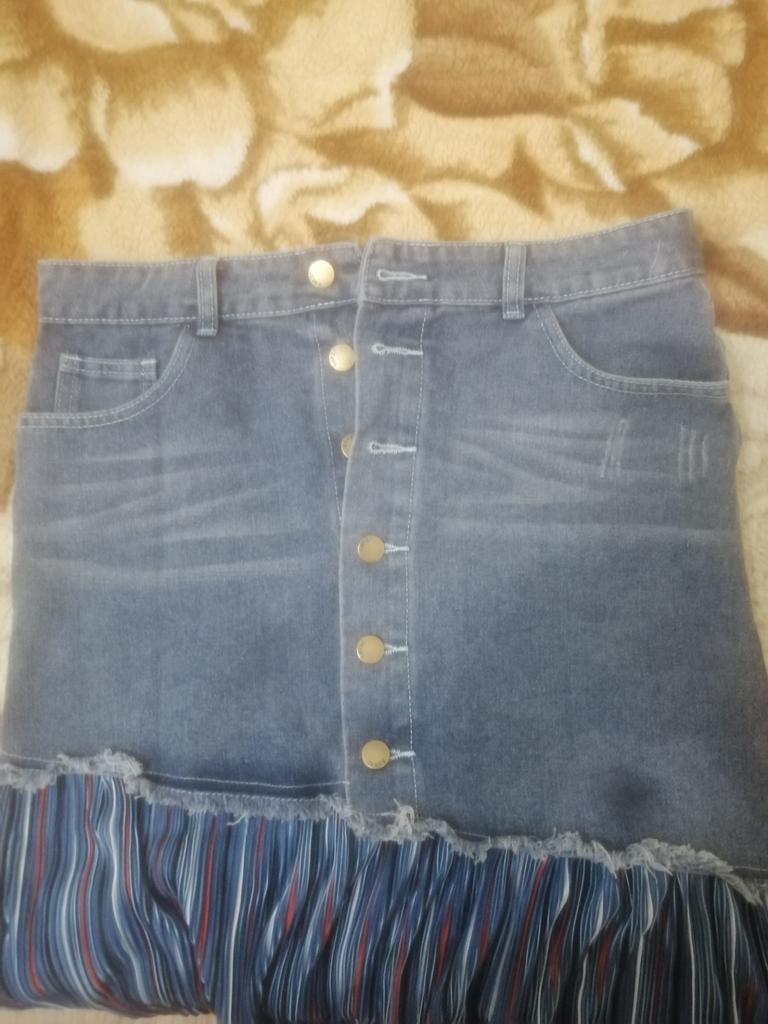 The skirt is great, but I need to work on it. The waist is not the right size. The quality is very good, denim on top, pleated faux fabric on the bottom. Thank you!