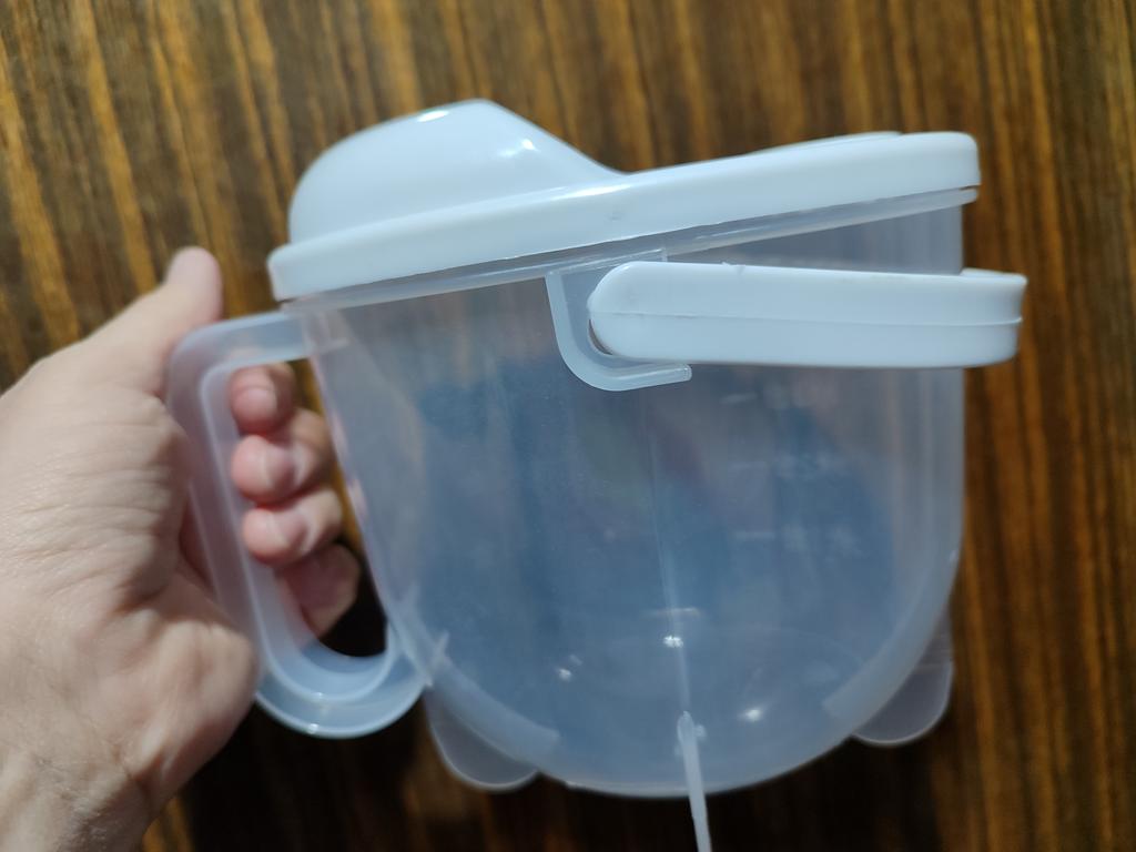 Container for 2 cups of cereals, convenient mesh for straining on the drain hole. There are risk indicators