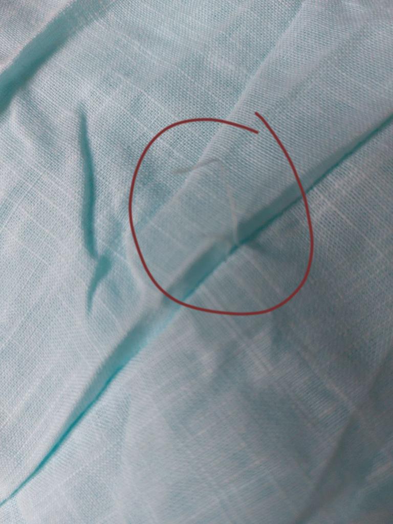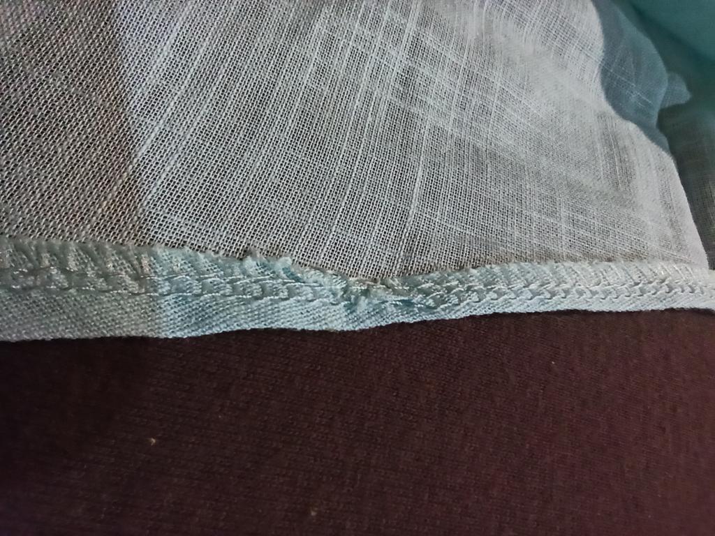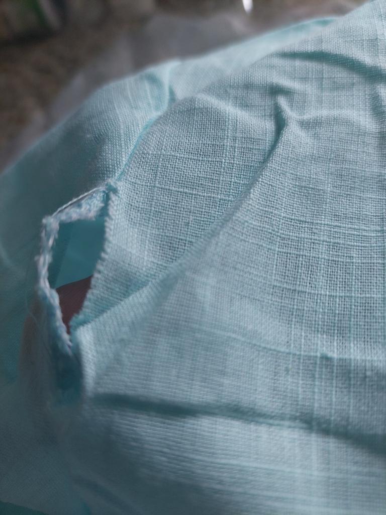 The fabric is thin, like gauze. The color is beautiful. The seams are very bad, the sleeve generally has a hole along the seam and the fabric is falling apart. The collar has dirty spots on the front.