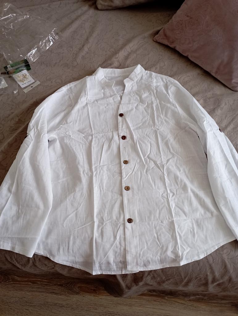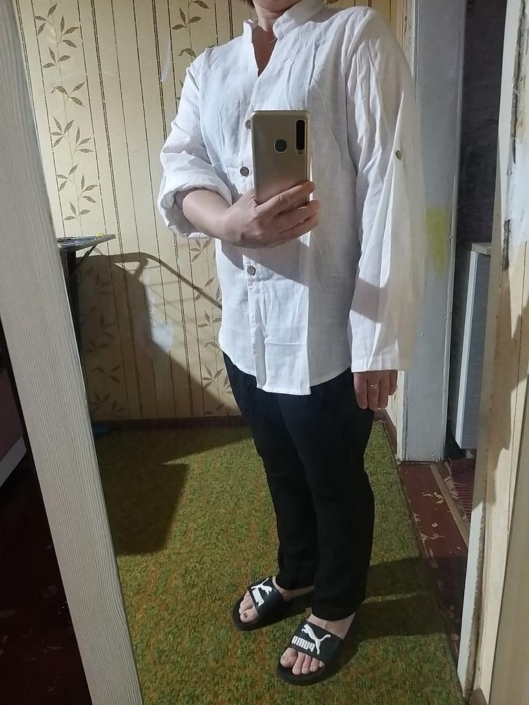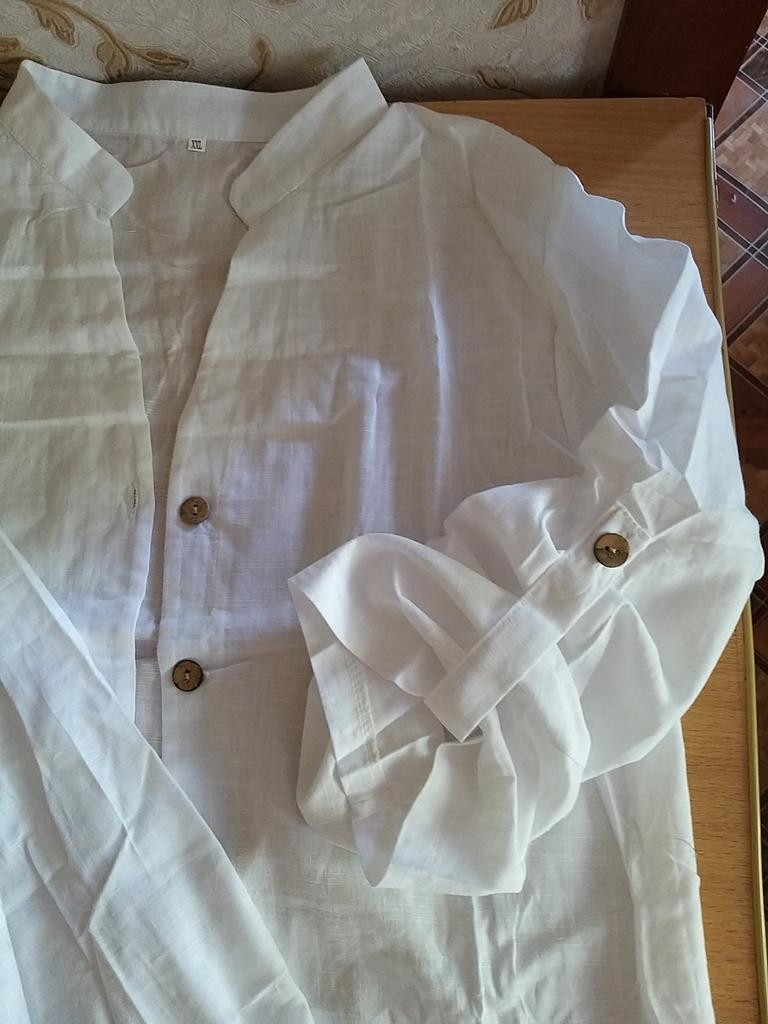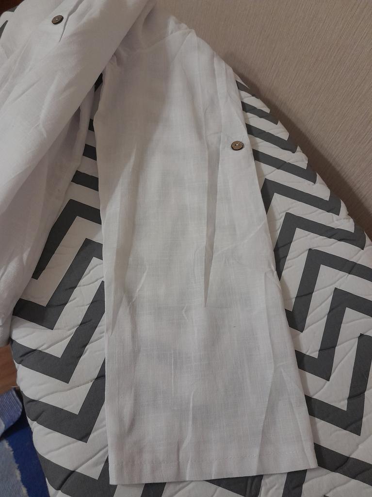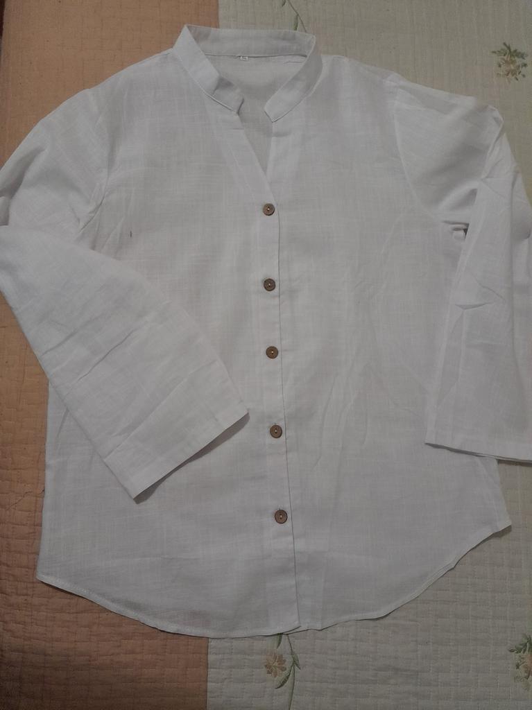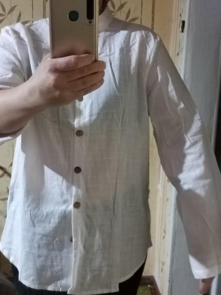 Received the order on time. To be honest, I expected more. In the photo the fabric is thin and breathable, but in reality it looks like an ordinary white doctorβs coat. The fabric is completely different and looks just like a robe only in white. In the photo you canβt see what kind of collar the shirt has, but thereβs just a stand like on menβs underwear. The sleeves are wide and very long. Overall I'm disappointed.