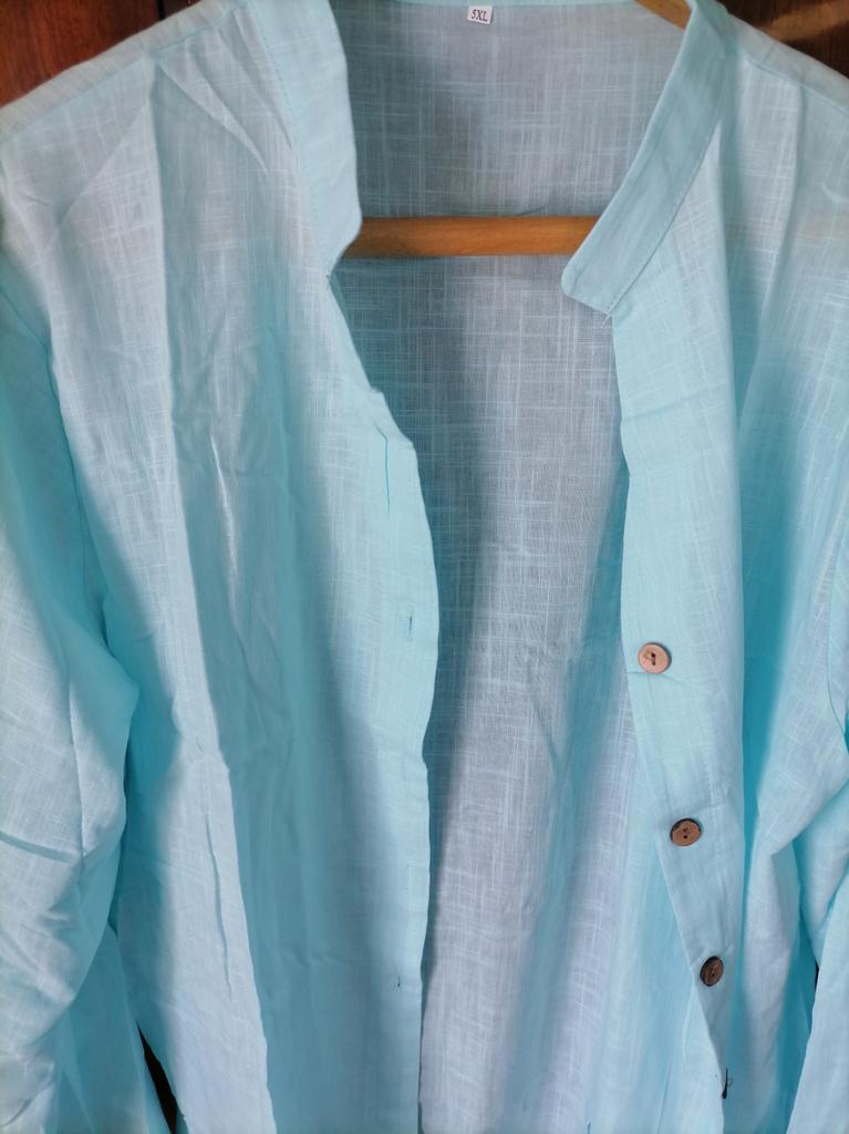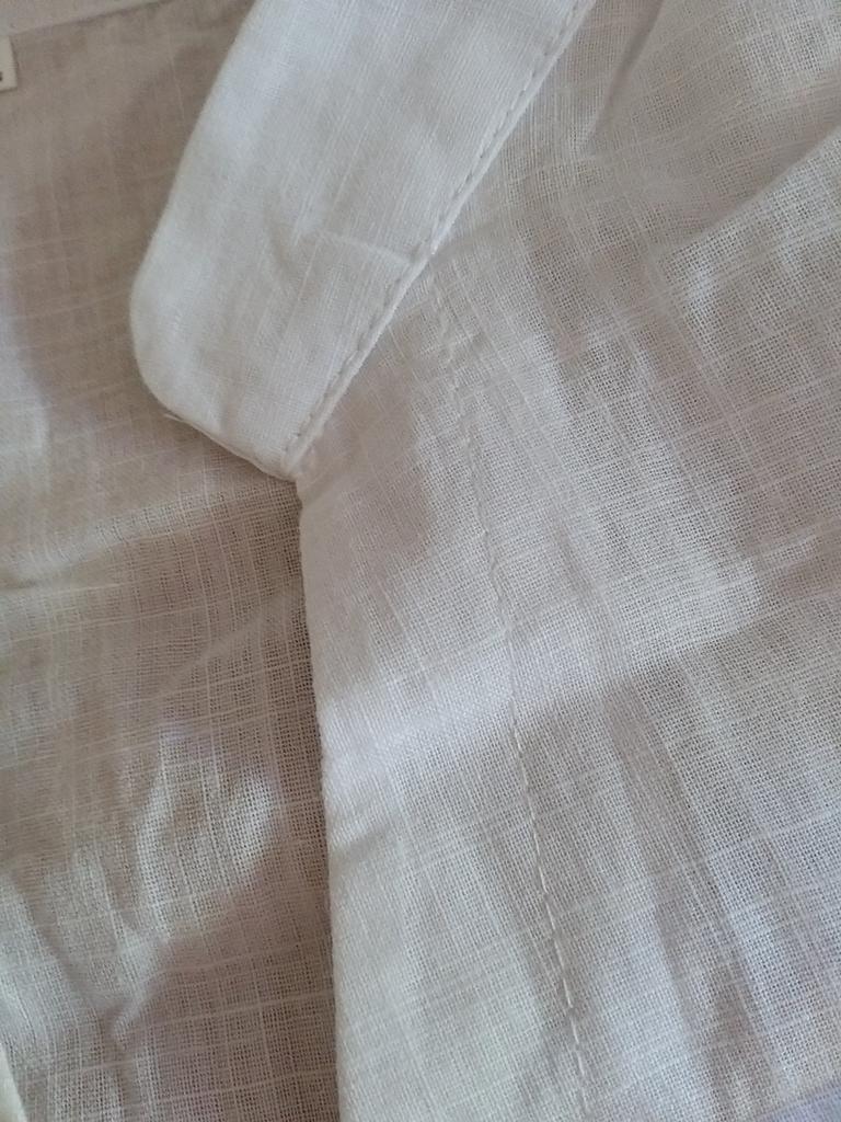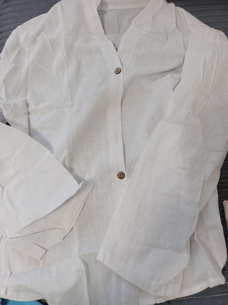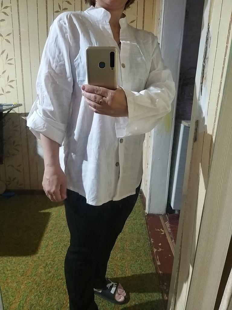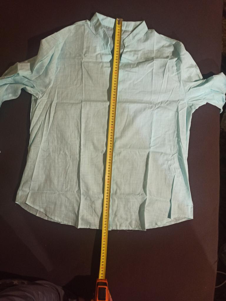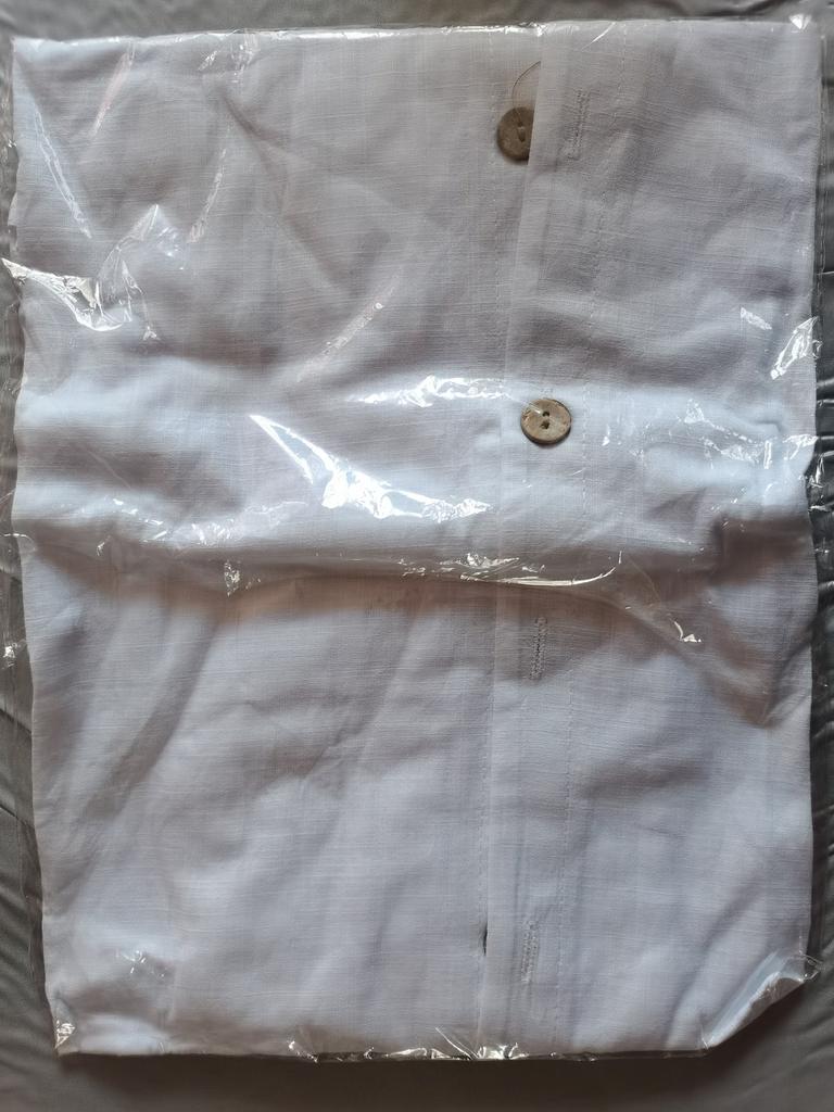 Received the order on time. To be honest, I expected more. In the photo the fabric is thin and breathable, but in reality it looks like an ordinary white doctorβs coat. The fabric is completely different and looks just like a robe only in white. In the photo you canβt see what kind of collar the shirt has, but thereβs just a stand like on menβs underwear. The sleeves are wide and very long. Overall I'm disappointed.