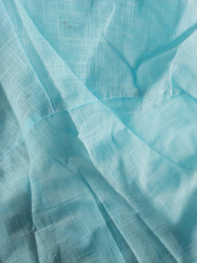 Super shirt! Cotton! The blue color is amazing! Thank you! It's shorter than in the photo!