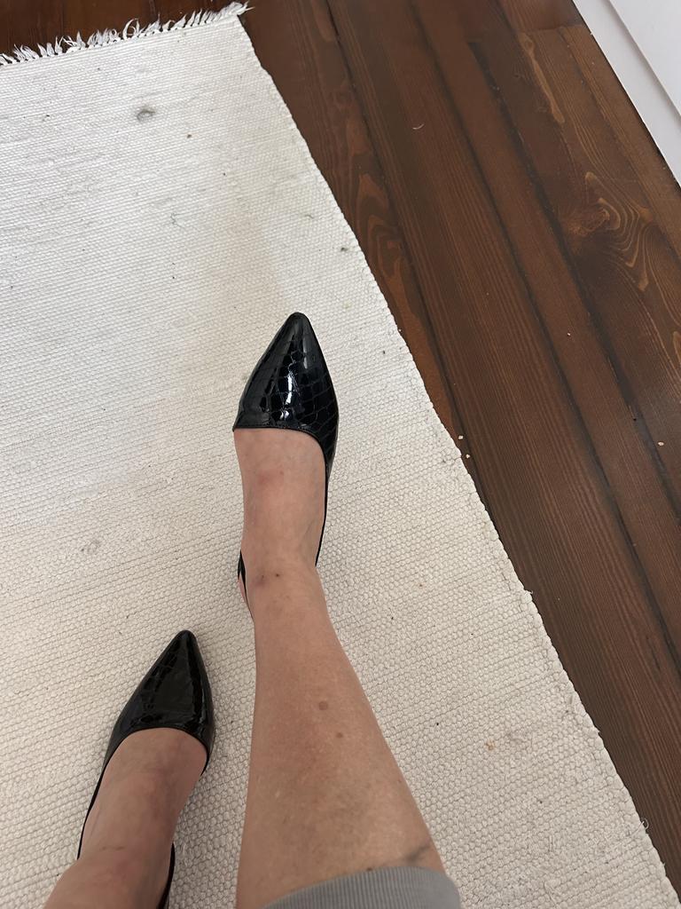 They look great on my feet, classic as I wanted, comfortable heel, not sure if they are leather, a bit hard