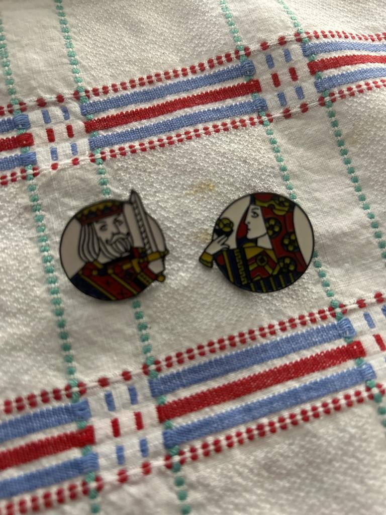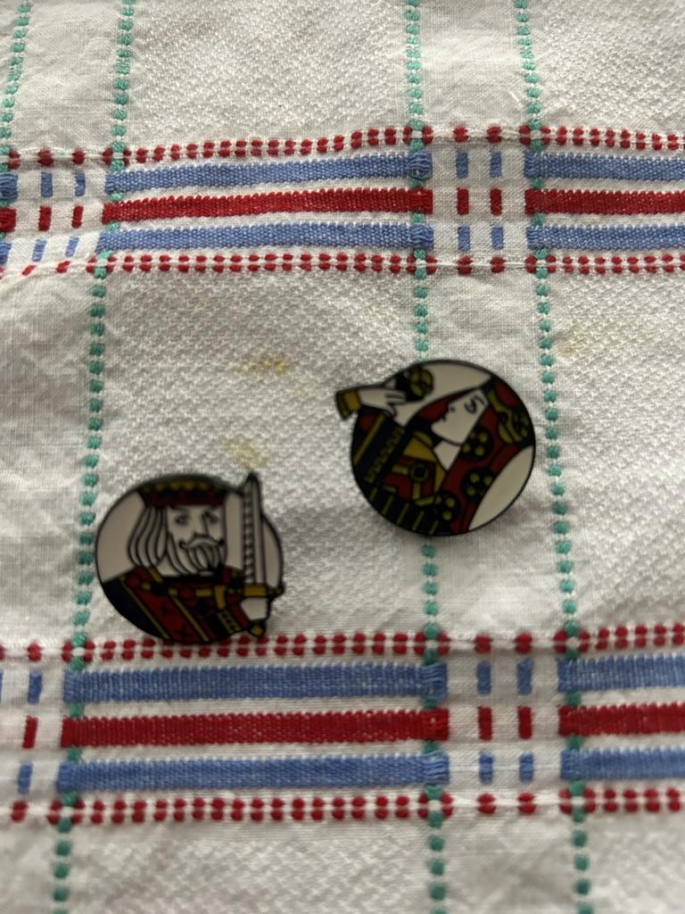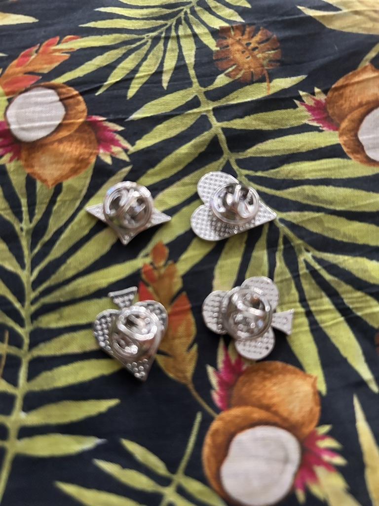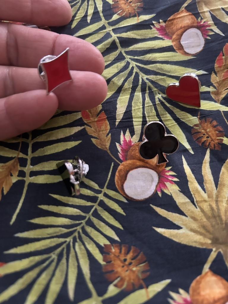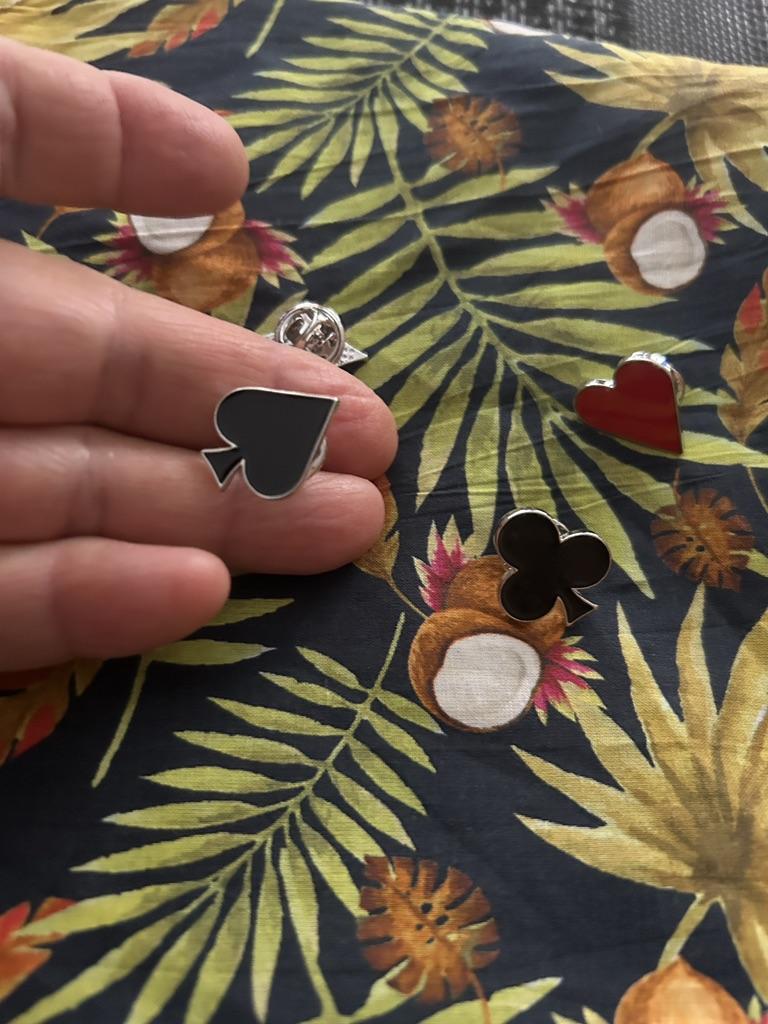 Metal brooches of playing card icons 🃏 ♦️♥️♣️♠️very beautiful. It arrived in less than 15 days in Spain 🇪🇸. I use them to enrich Patchwork work