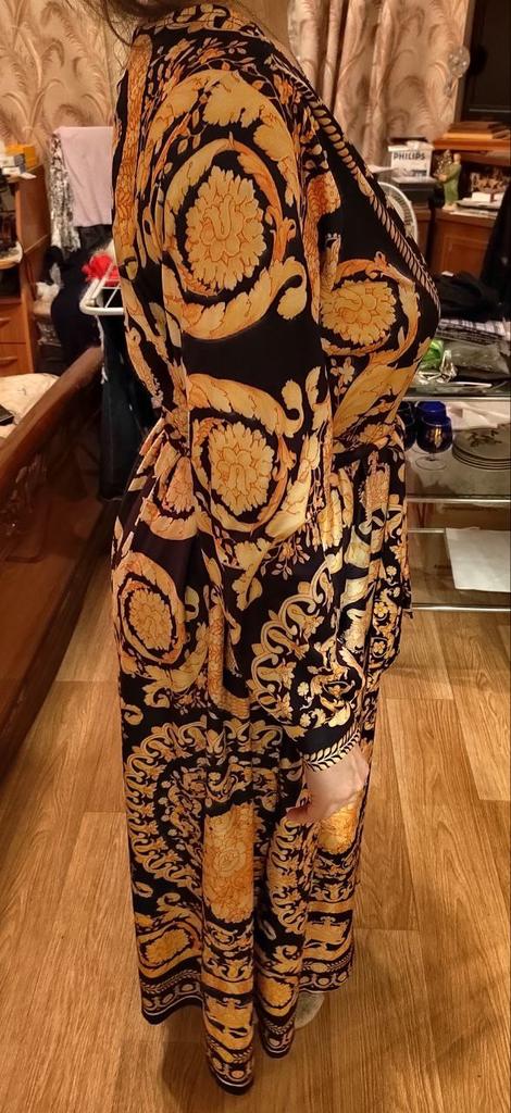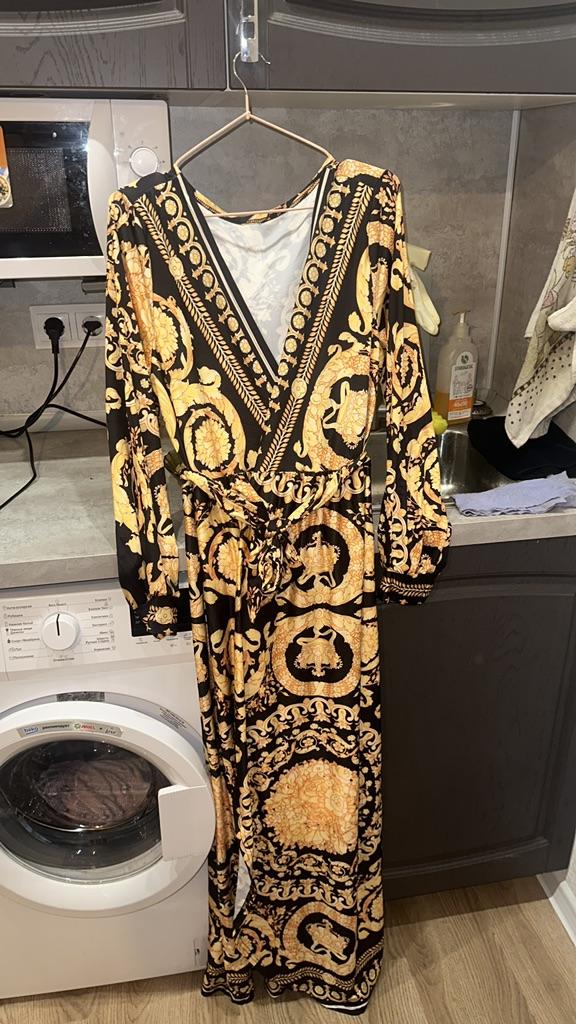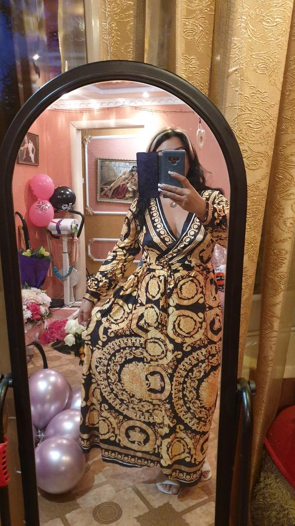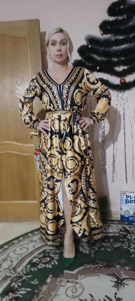 The product does not fit the definition of a dress, especially an evening one... An ordinary knitted dressing gown, made of very cheap material, with the quality of the seams of a house robe, and the selection of the pattern, very far from the reference. You will not find a luxurious border along the hem.