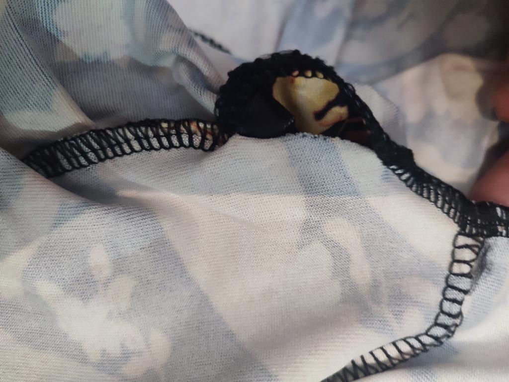 The color is different from the picture, paler, the hem is not as wide as in the picture. The edge of the collar is stretchy, it needs to be strengthened, otherwise it will stretch after washing