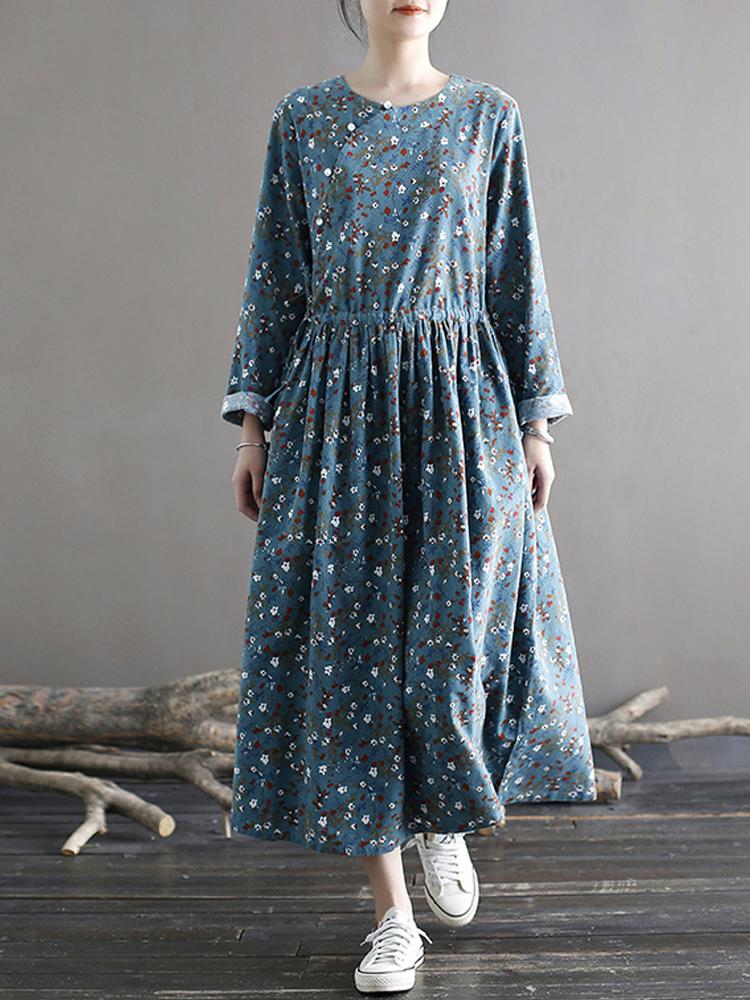 Johnature Women Chinese Style Vintage Dresses Long Sleeve Print Floral Robes Spring Button Women Clothes Soft Dresses