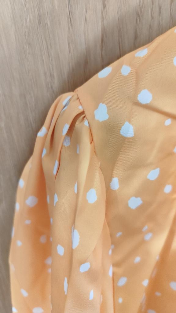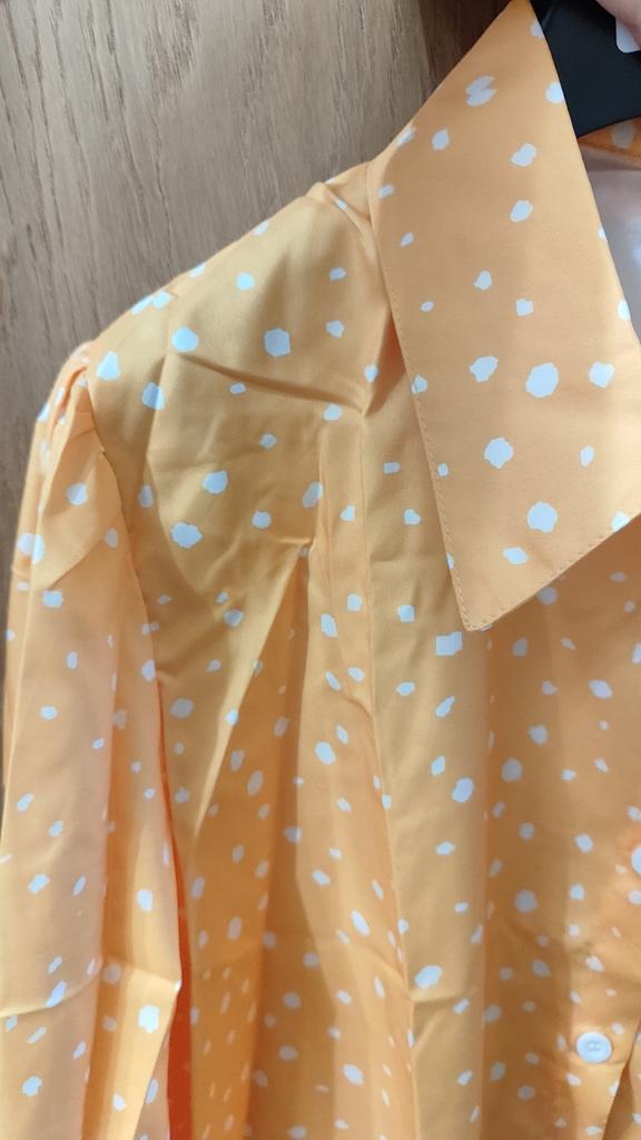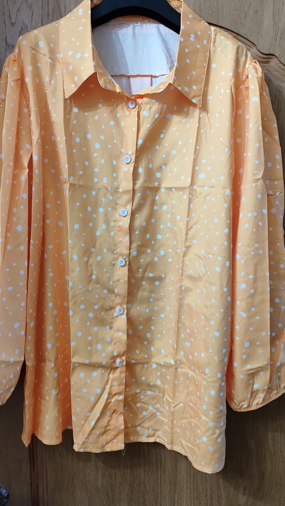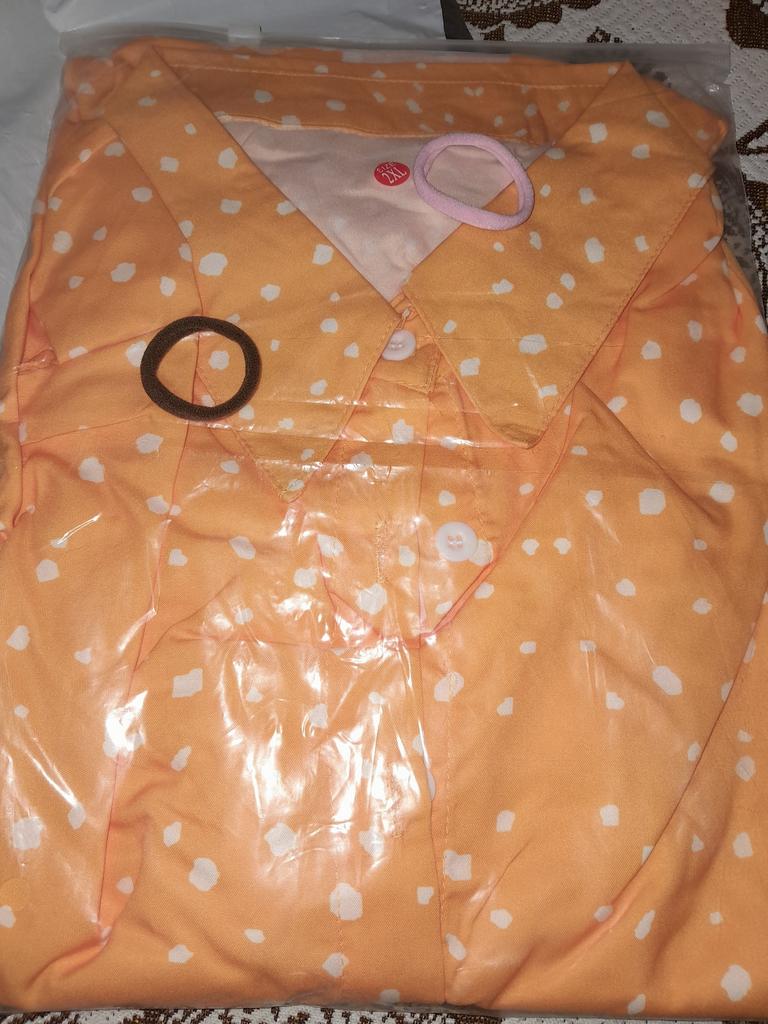 The photo of the gift does not correspond to the quantity. The packaging is opened. The blouse is orange in color.