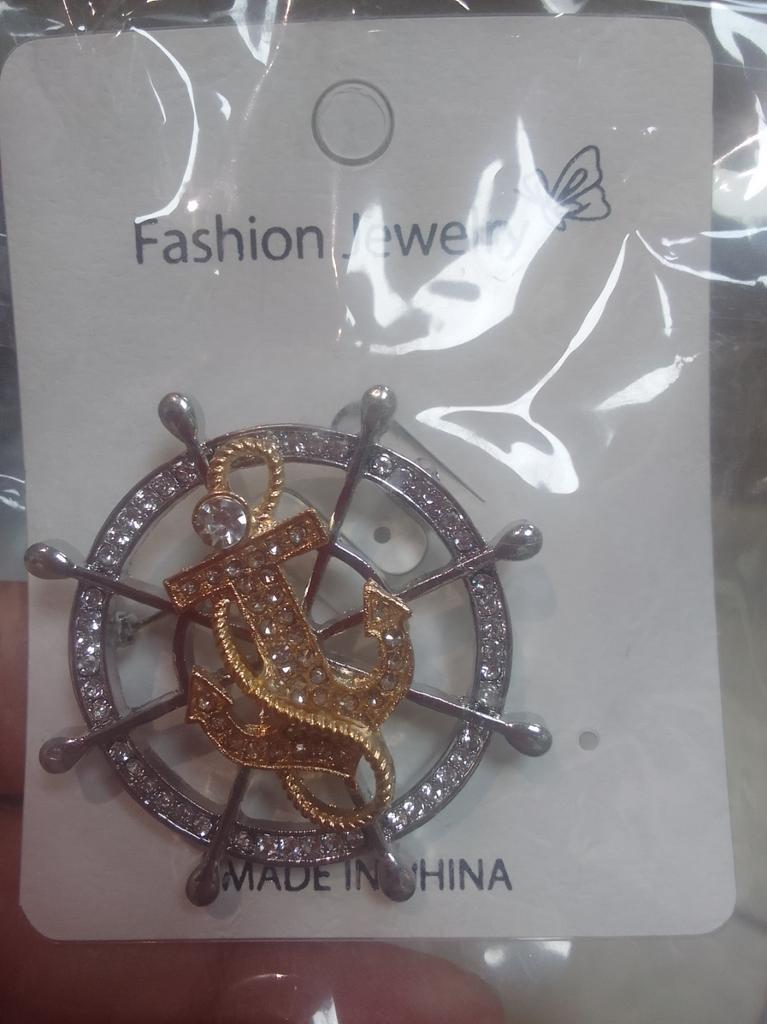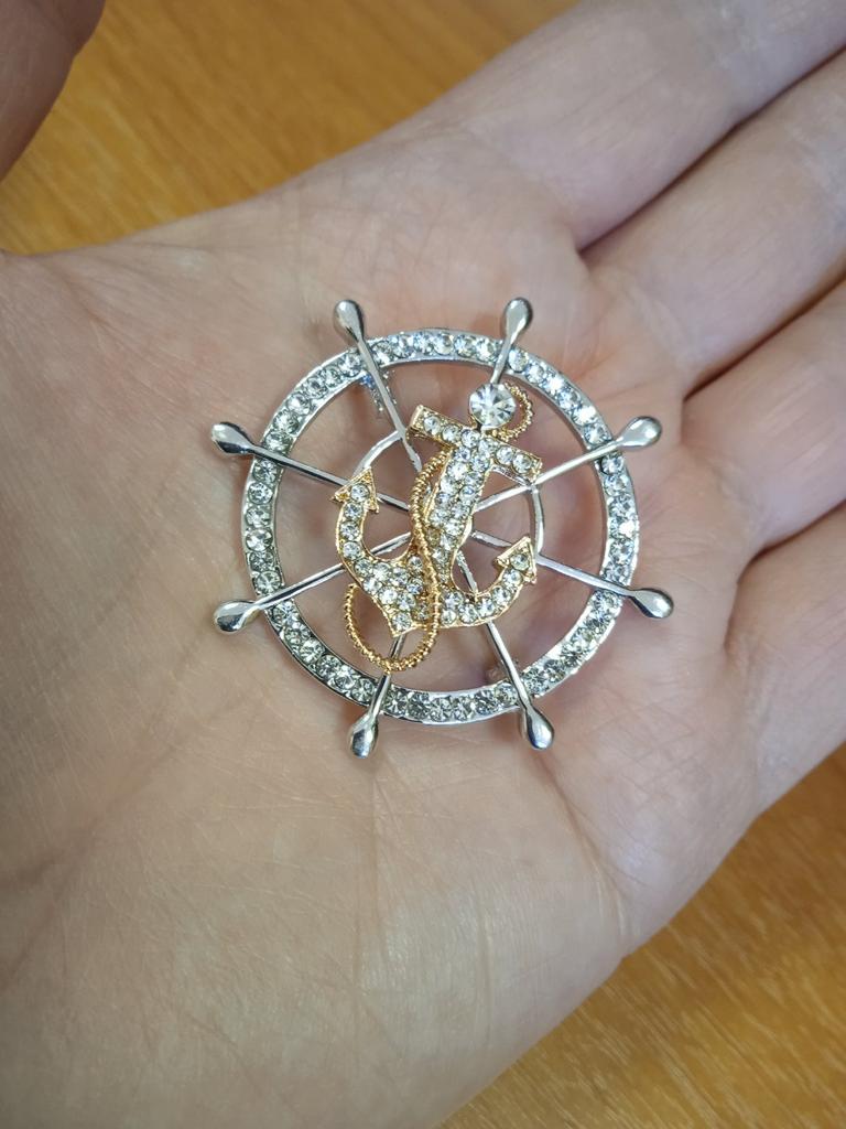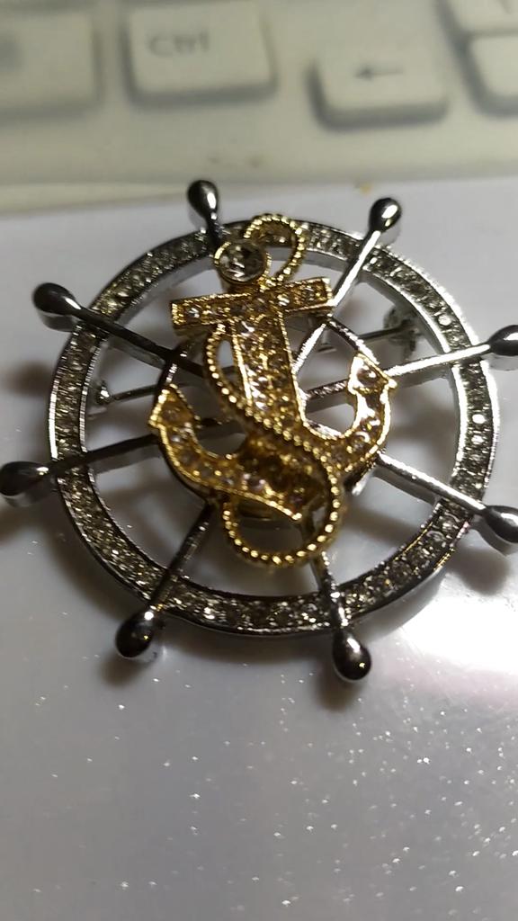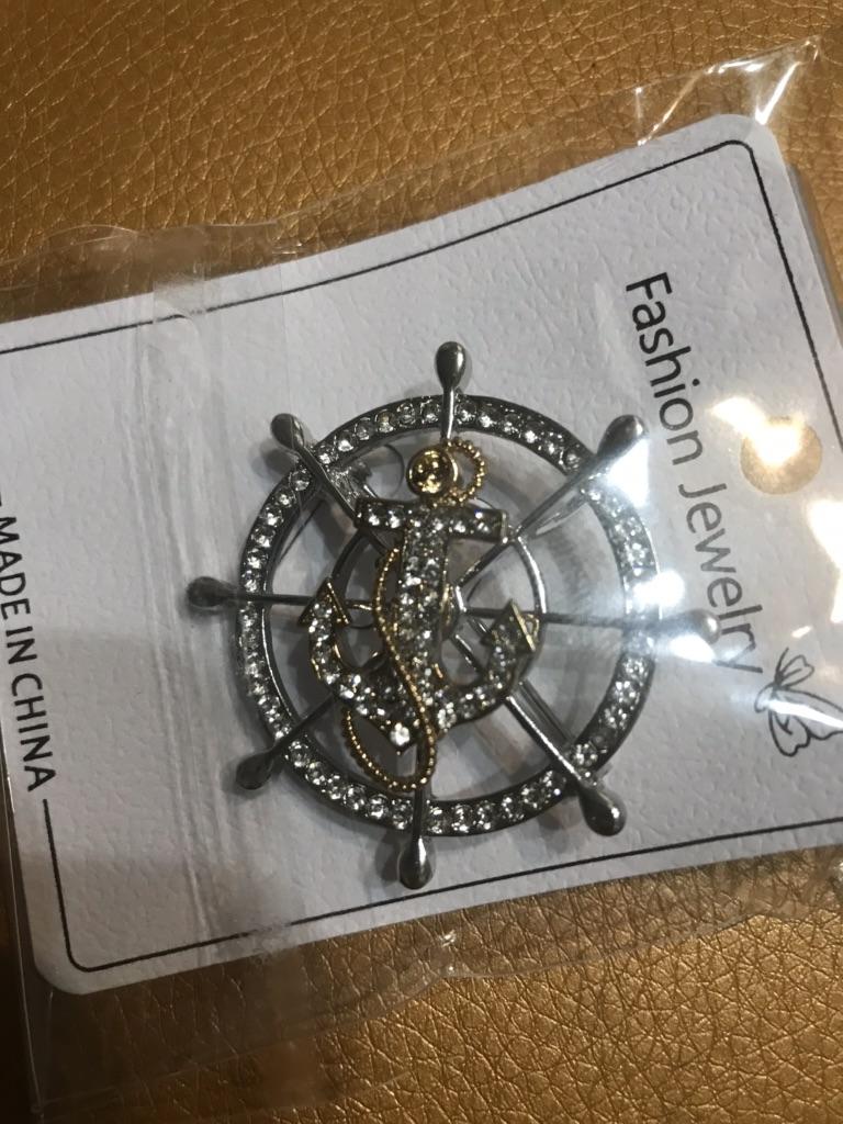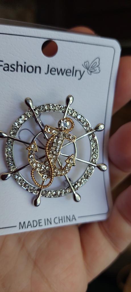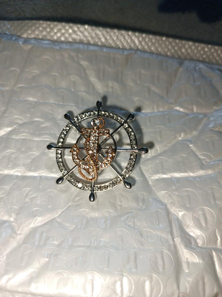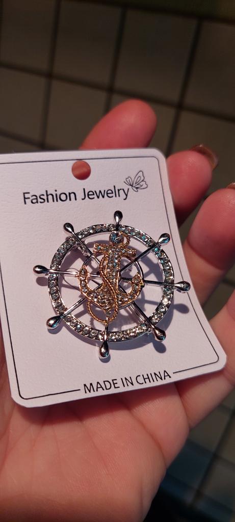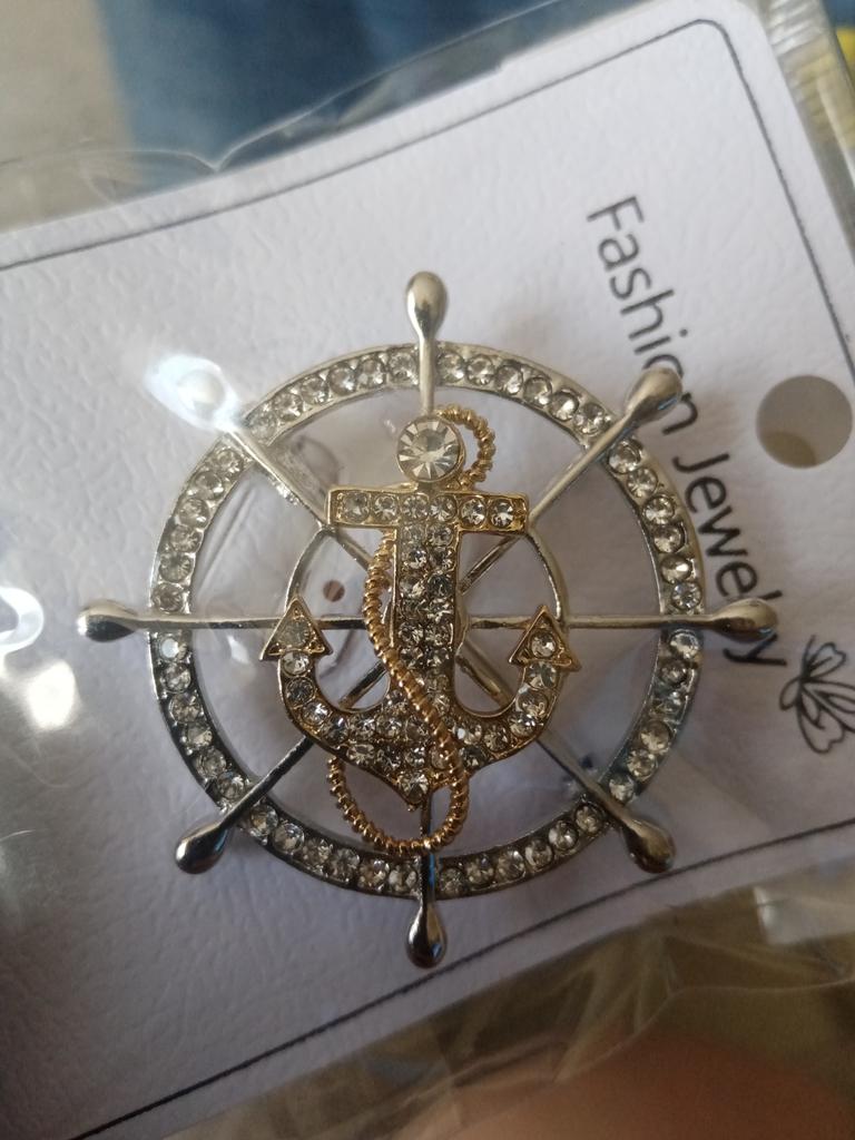 Jewellery review ✨️ broach from BLUCOME This beautiful broach/clothing pin has many uses. Can be worn on a jacket label, a shirt, jumper or scarf, even a hat. It's made with zinc alloy and its very sturdy 😃 The design is an anchor and rudder. With its beautiful diamontes/crystals which shine and glisten with the light it will surely add a touch of glam to any outfit ✨️ The anchor is gold in colour whilst the rest of the broach is silver. The back has a pin which simply slides under the clasp to keep it securely in place on any outfit The weight is 12g and the size is 4.2cm x 4.2cm Thankyou joom and joom seller ❤️