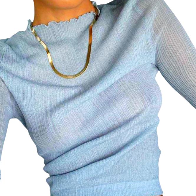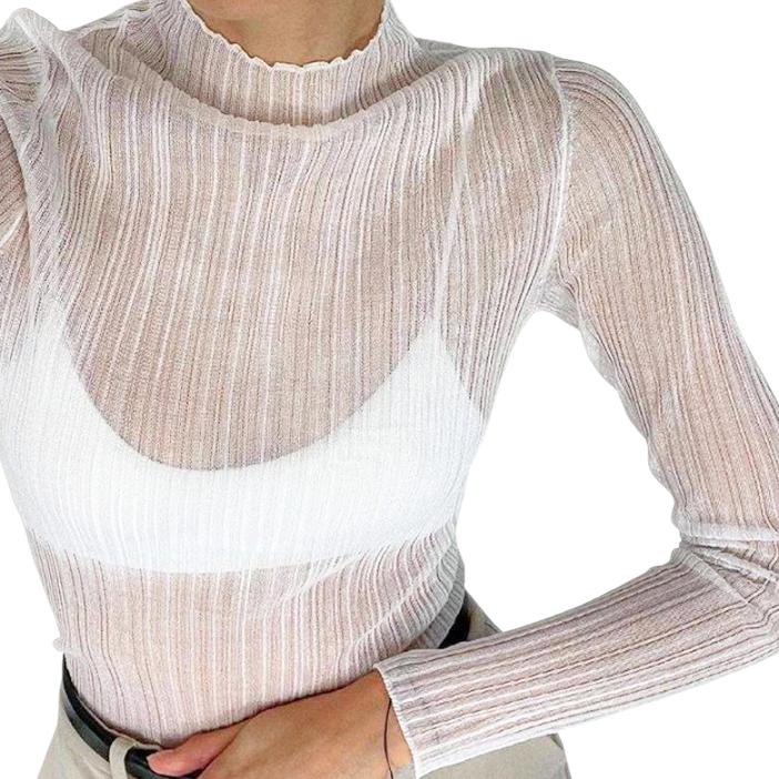 Fall Elegant See Through Long Sleeve Mock Neck Women Tops Fashion Streetwear Sexy T-Shirts Tees Slim Clothes