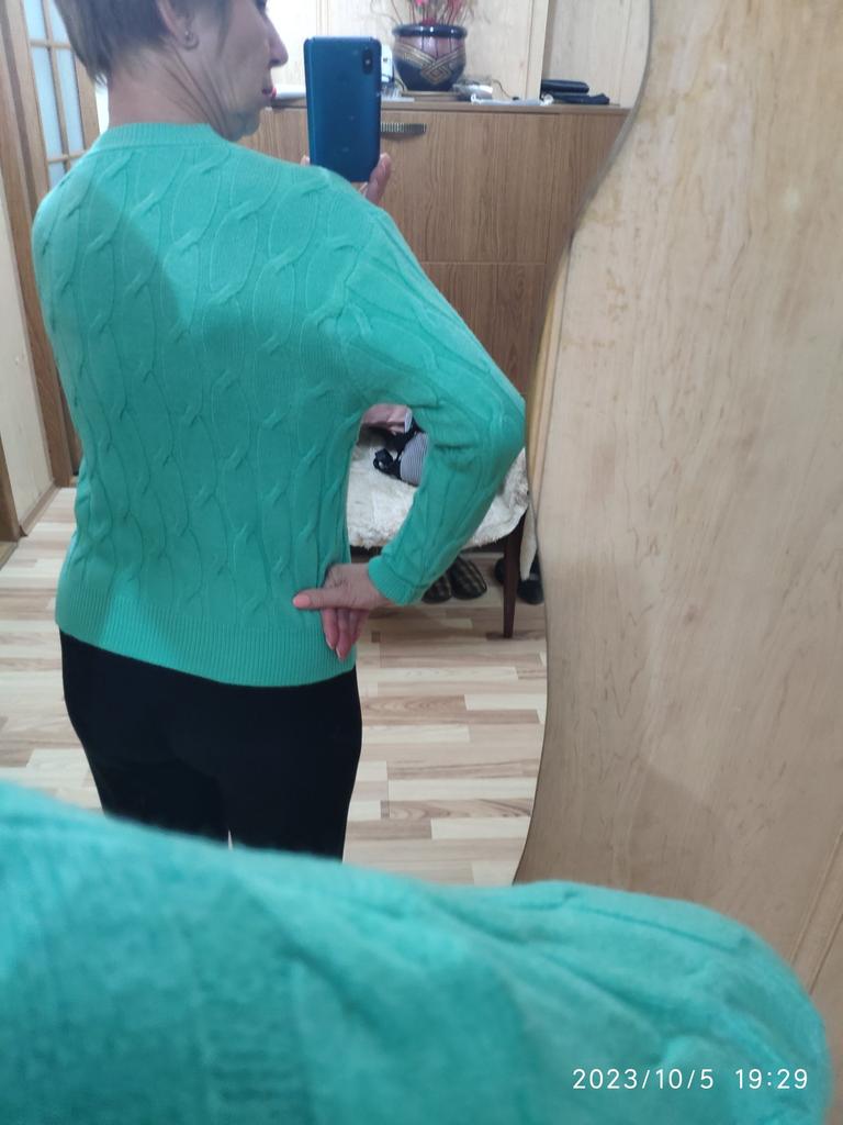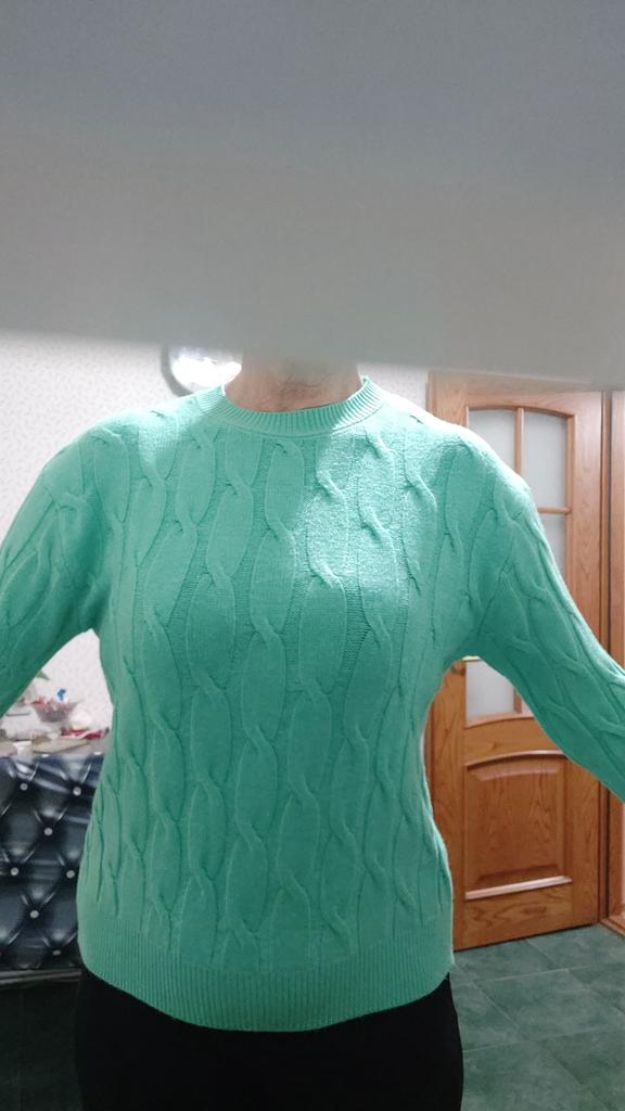 For 48-50 it's a bit small, very fitted, the sleeves are a bit short, for 46 it will be normal, it looks much better in the photo, there are threads pulling at the collar.