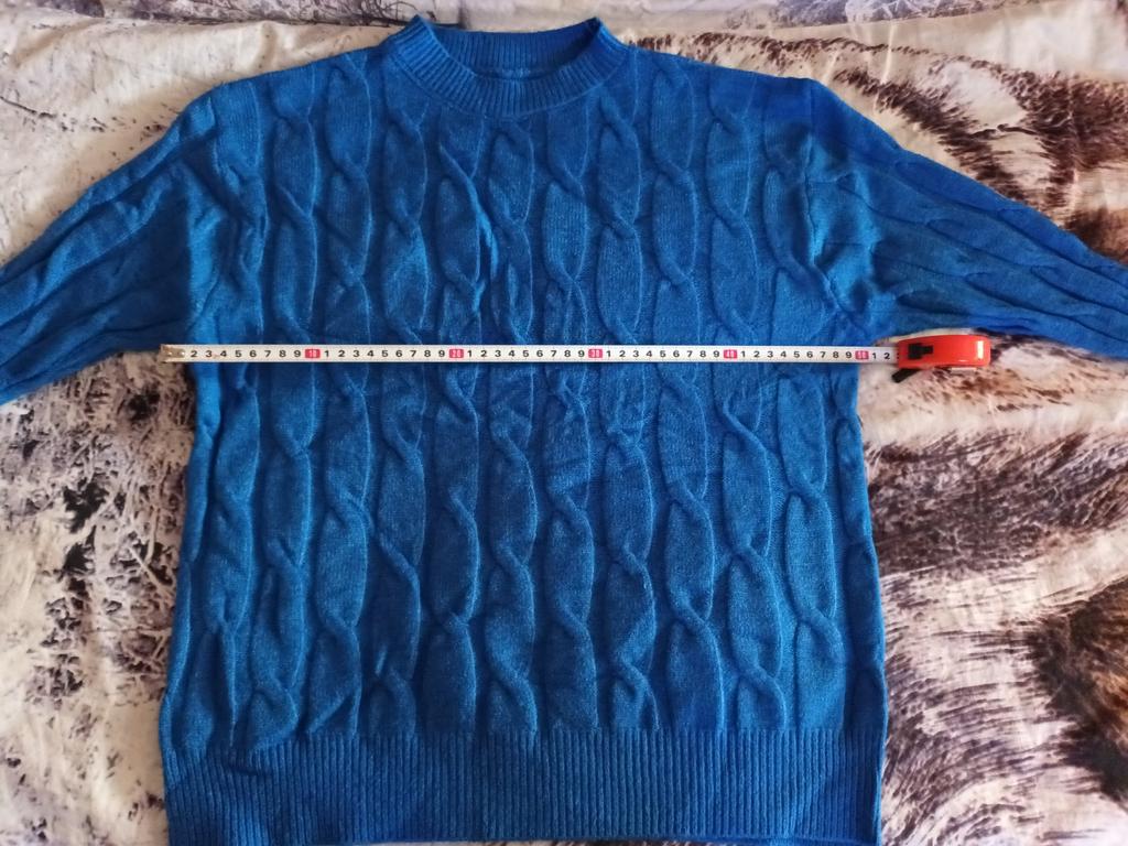 Excellent sweater, the blue color is beautiful and saturated, Fits in size 46. The sleeves are just not short.