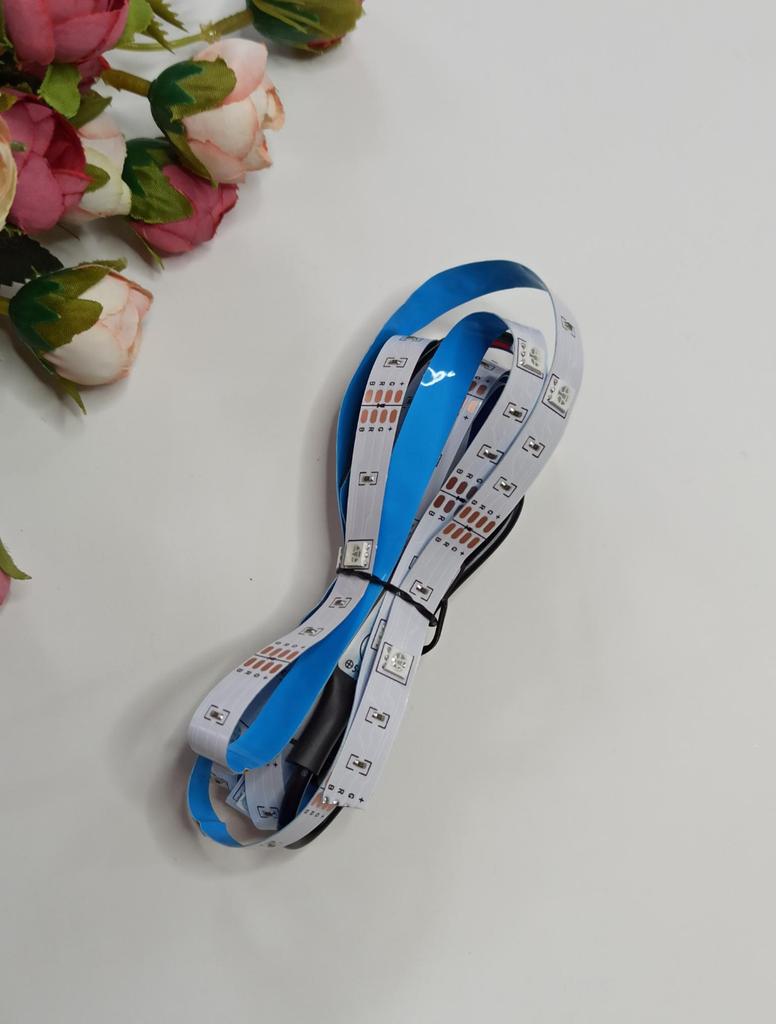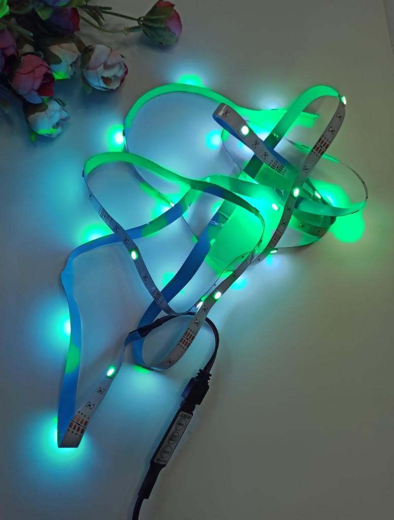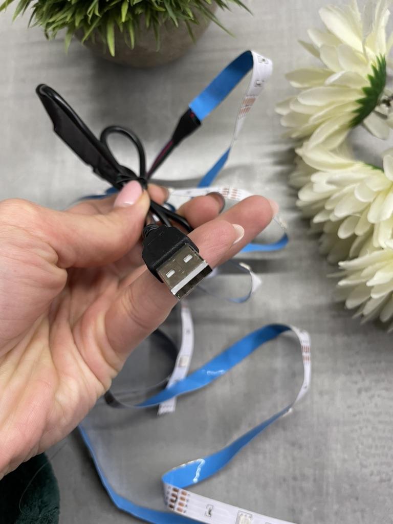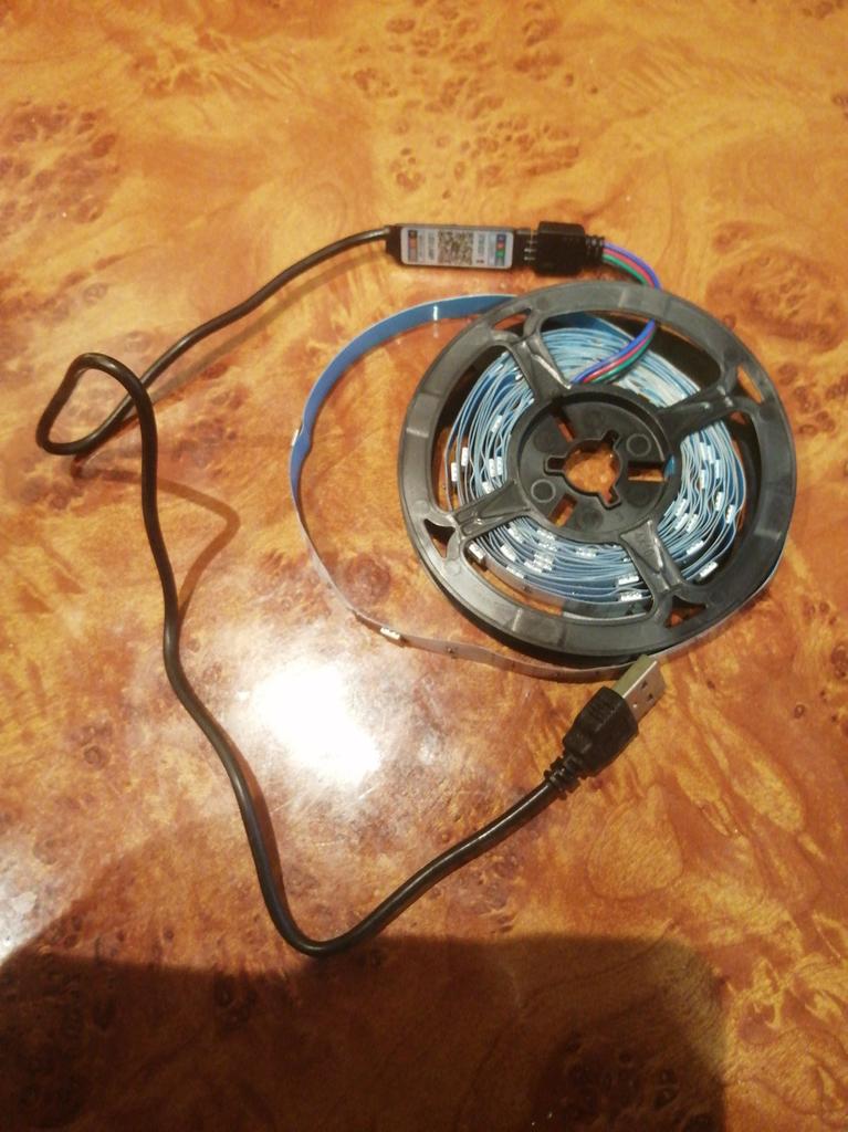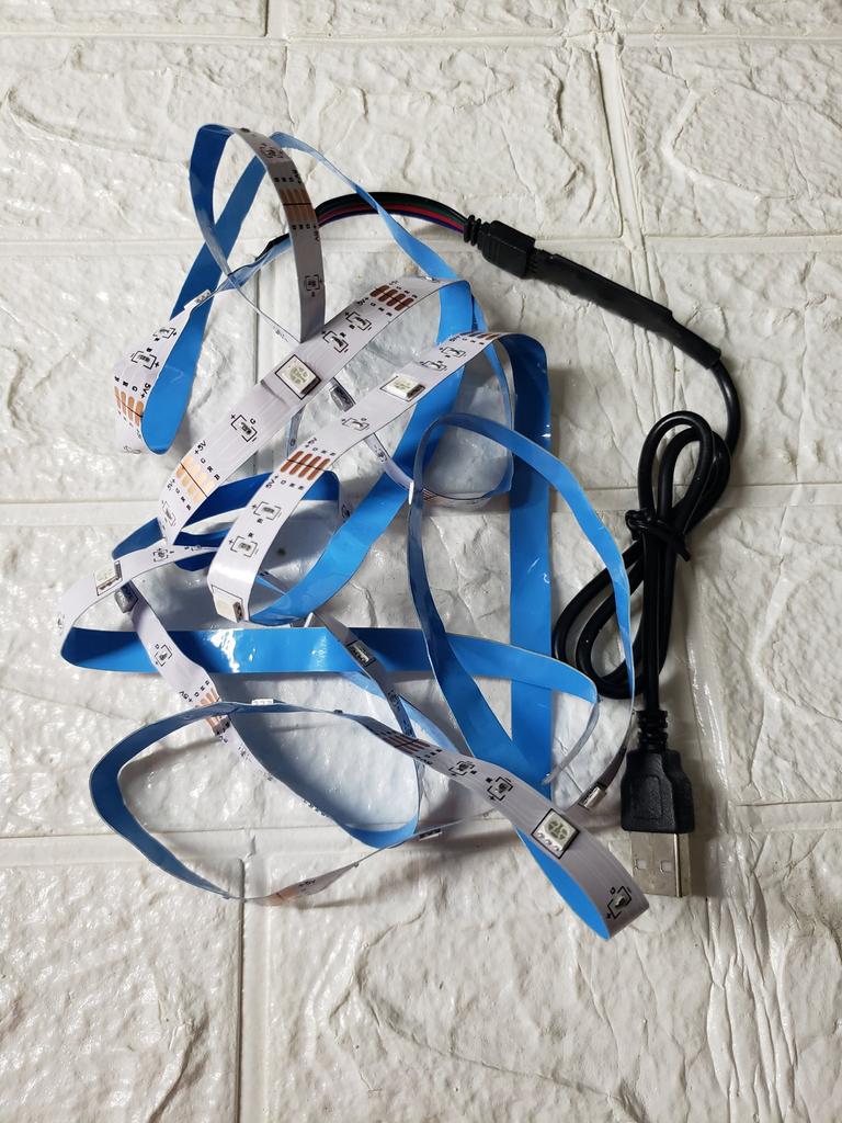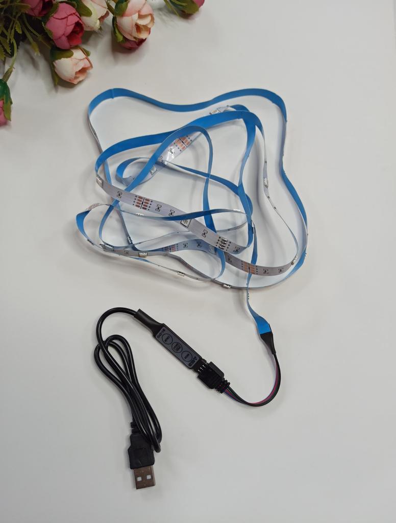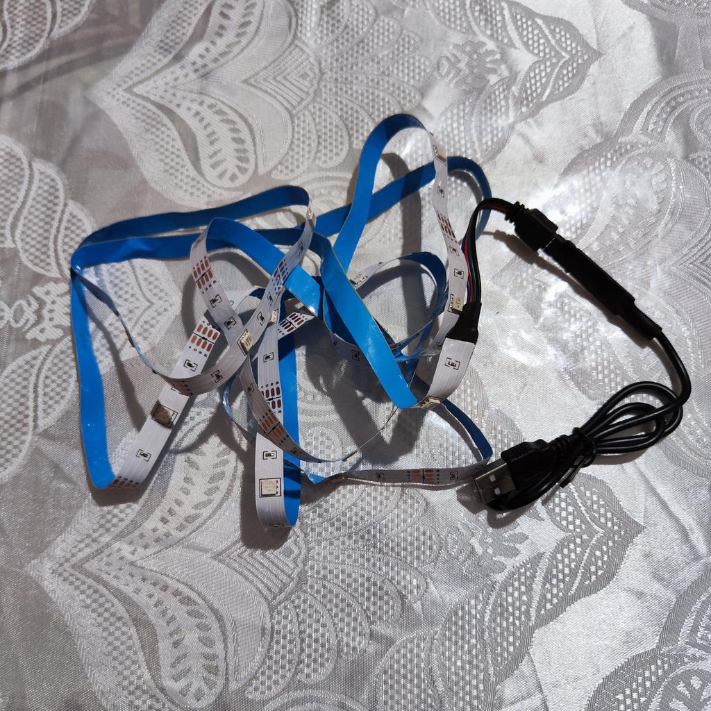 The LED strip is a flexible printed circuit board, on which there is a set of LEDs, current-regulating resistors and their communication lines. The product is intended for organizing decorative lighting and is not suitable as the only source of general lighting.. This LED strip belongs to the average consumer class of LED products, that is, it is designed for domestic use and installation by non-professional craftsmen. The tape has an adhesive backing, so it can be easily fixed on various surfaces.. The tape is powered via USB. Can be connected to a laptop TV or smartphone charger. The tape is controlled by a remote control (see photo).
