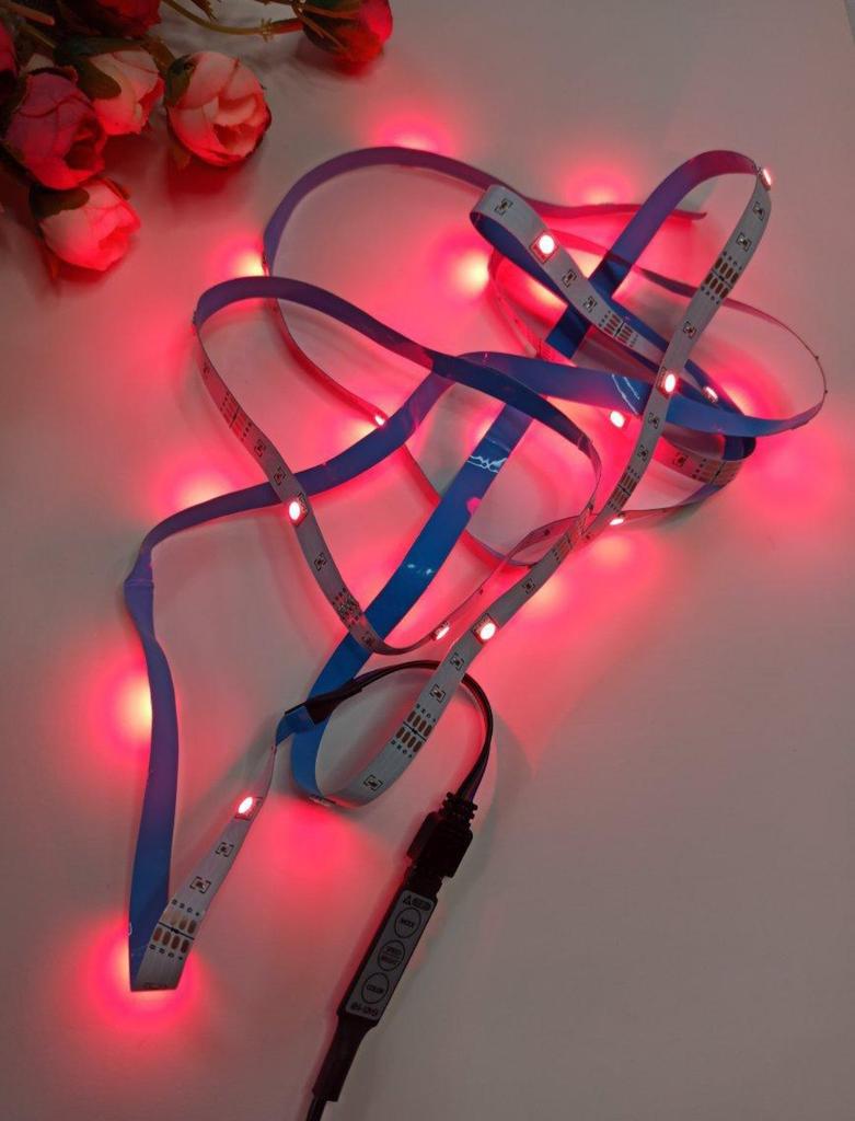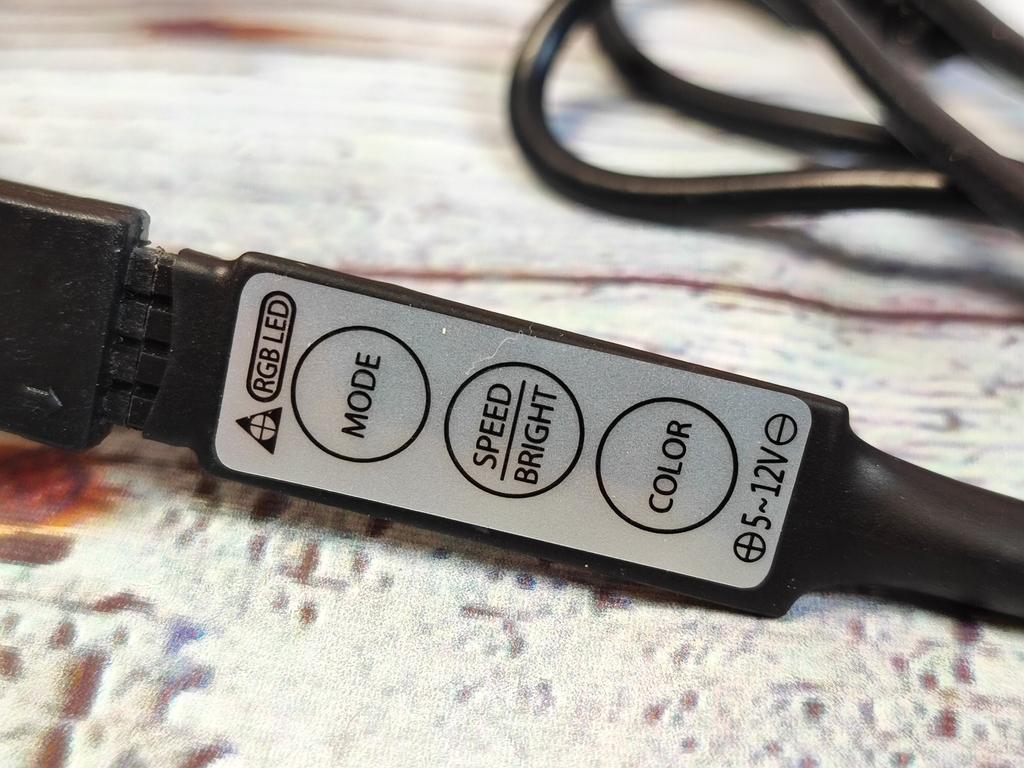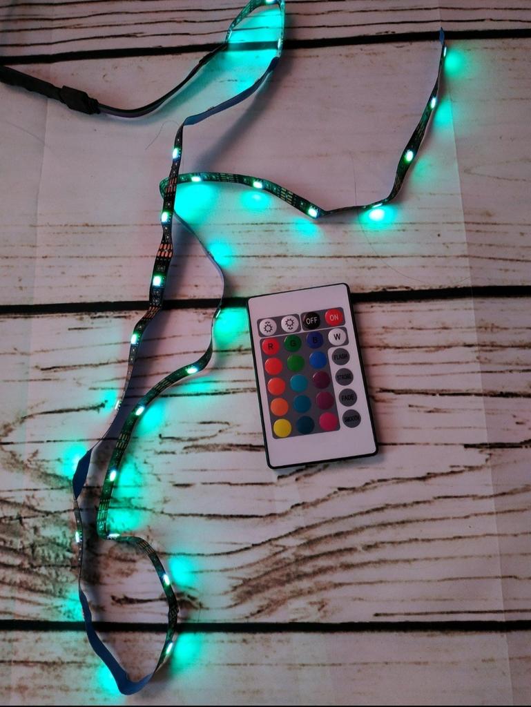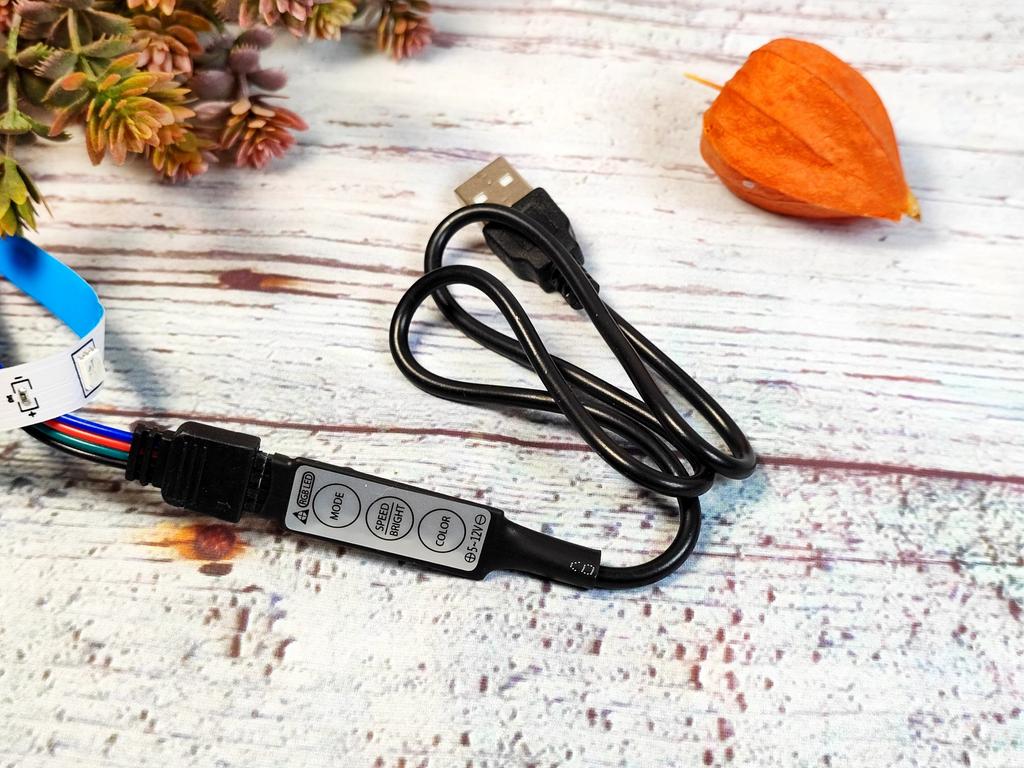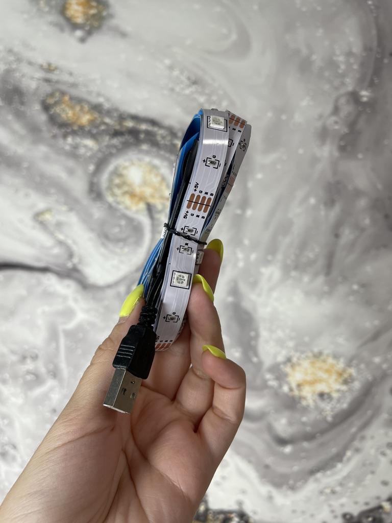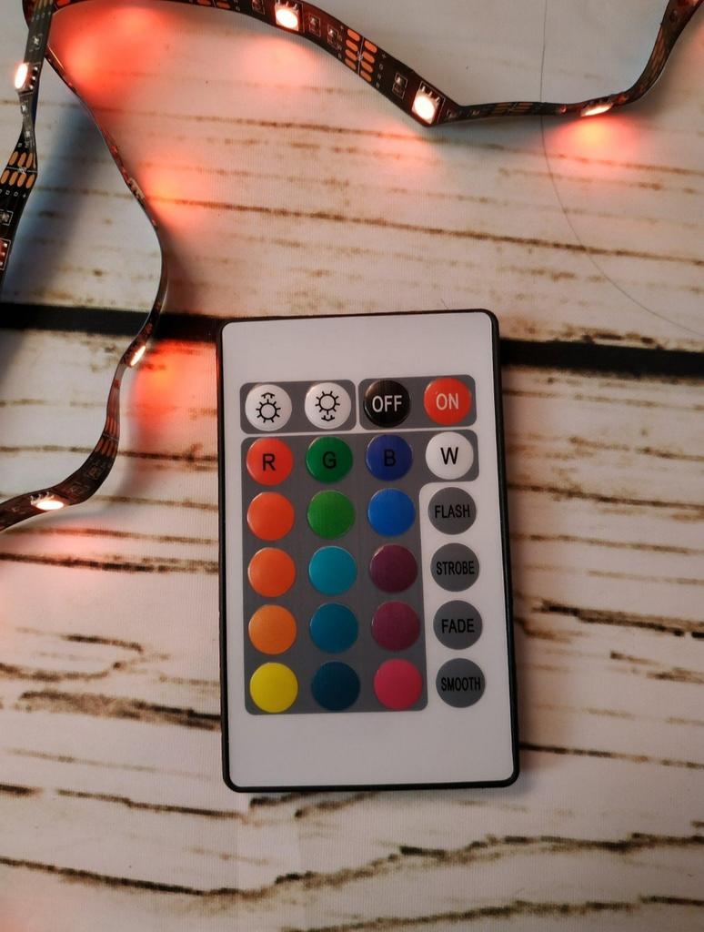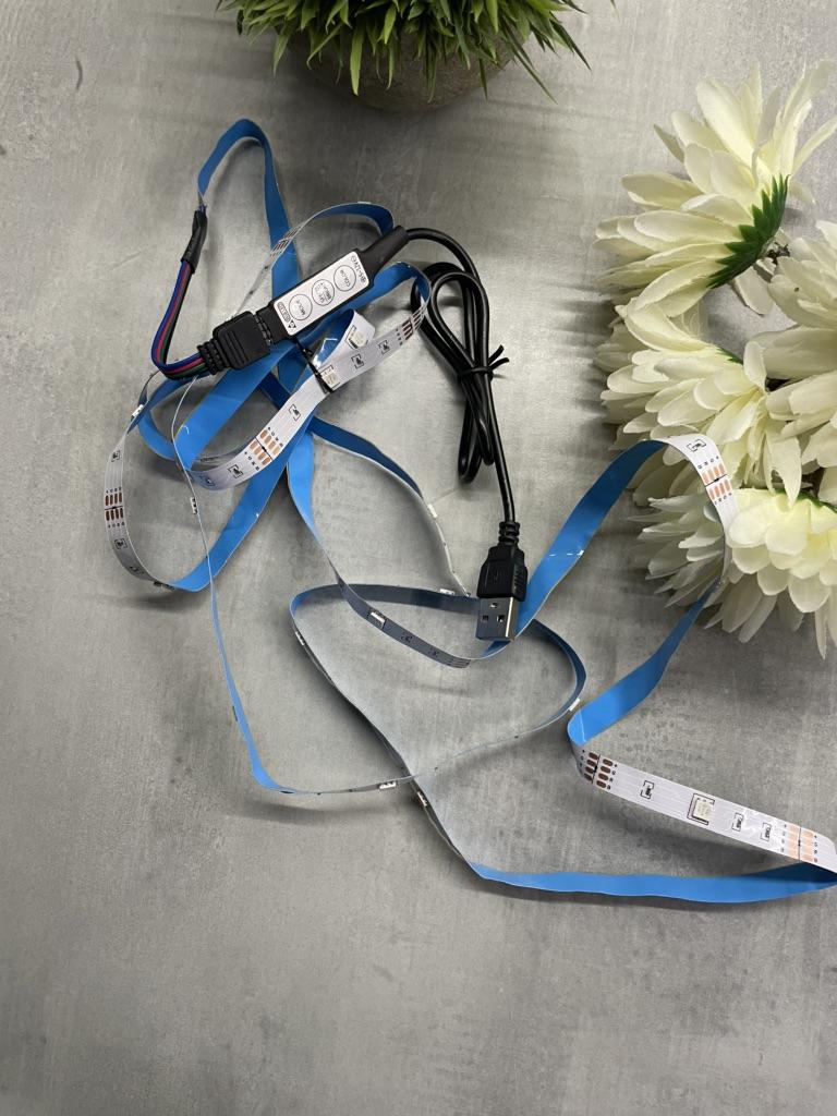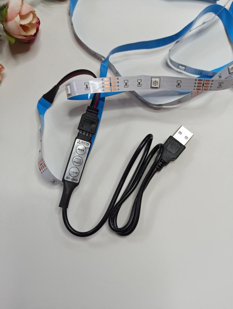The LED strip is a flexible printed circuit board, on which there is a set of LEDs, current-regulating resistors and their communication lines. The product is intended for organizing decorative lighting and is not suitable as the only source of general lighting.. This LED strip belongs to the average consumer class of LED products, that is, it is designed for domestic use and installation by non-professional craftsmen. The tape has an adhesive backing, so it can be easily fixed on various surfaces.. The tape is powered via USB. Can be connected to a laptop TV or smartphone charger. The tape is controlled by a remote control (see photo).