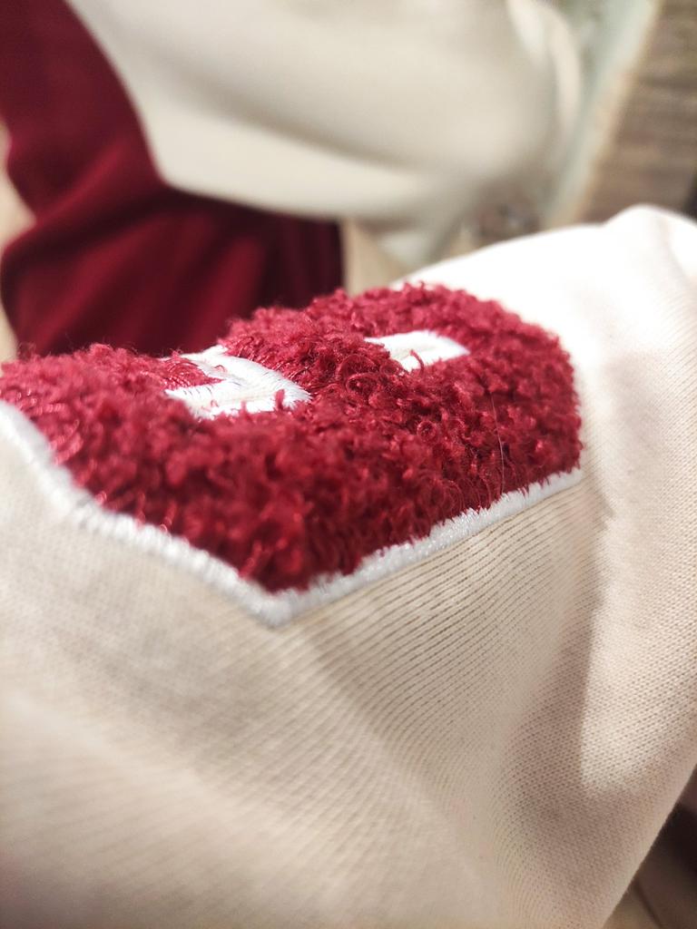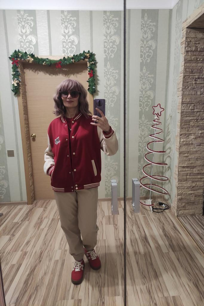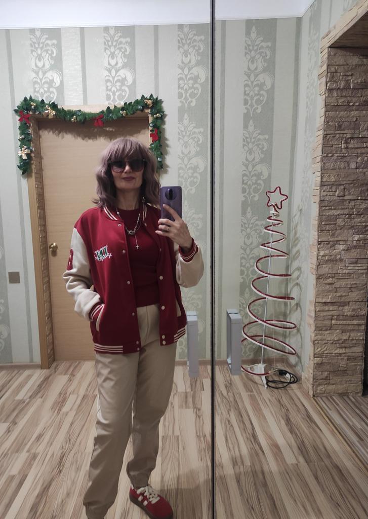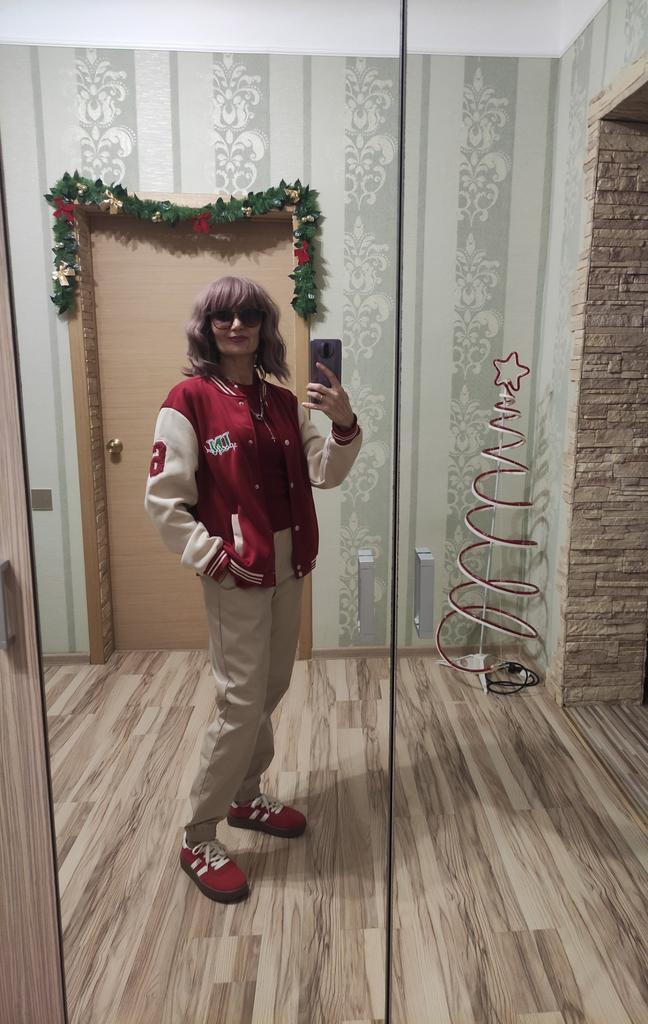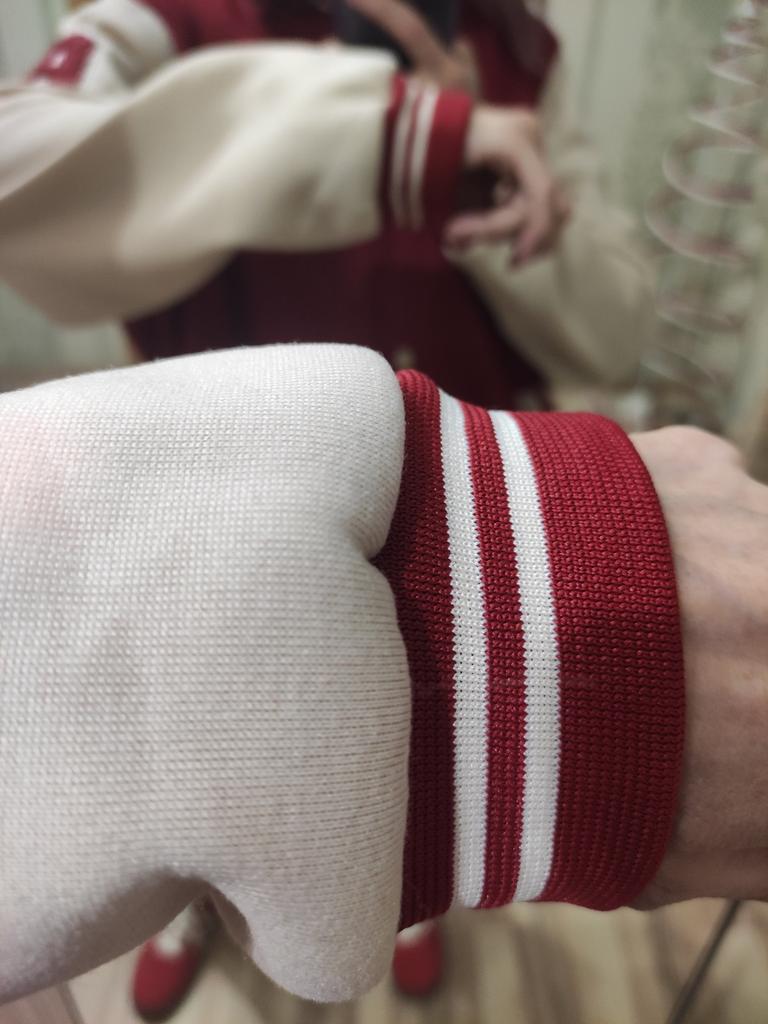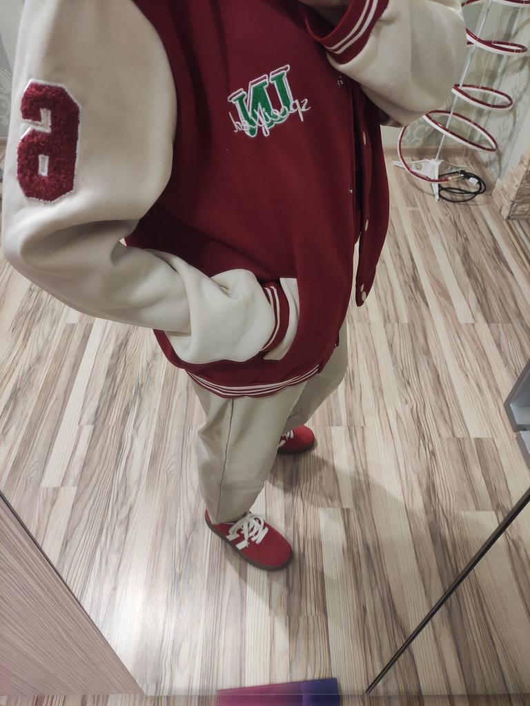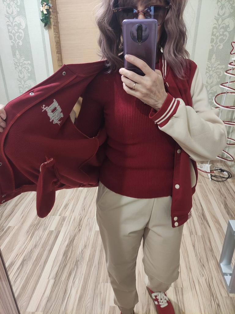 Warm bomber jacket. The sleeves are not pure white, but cream-milk colored; the buttons are ivory-colored. In size, it's just what I wanted. Oversized, but not too much. For 1.70m, size M (my) L (bomber) will be just right