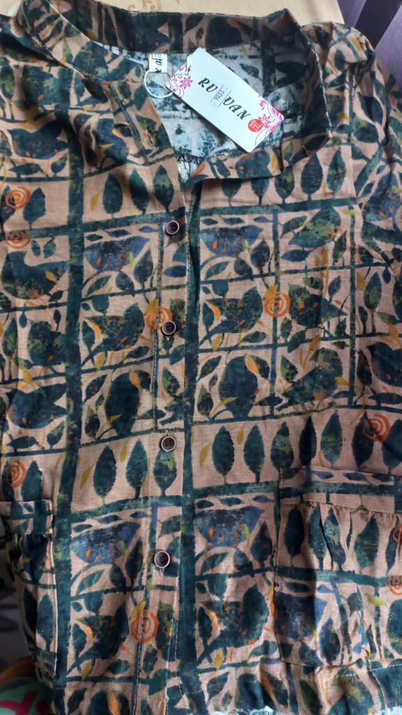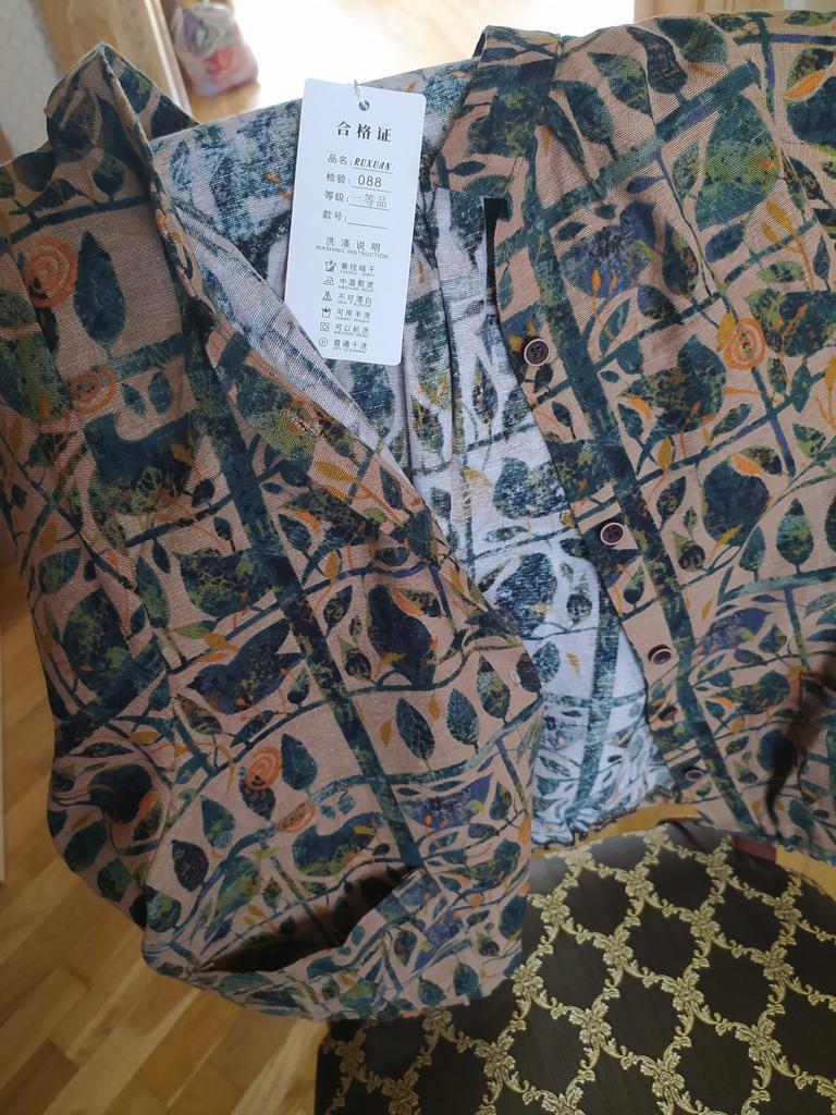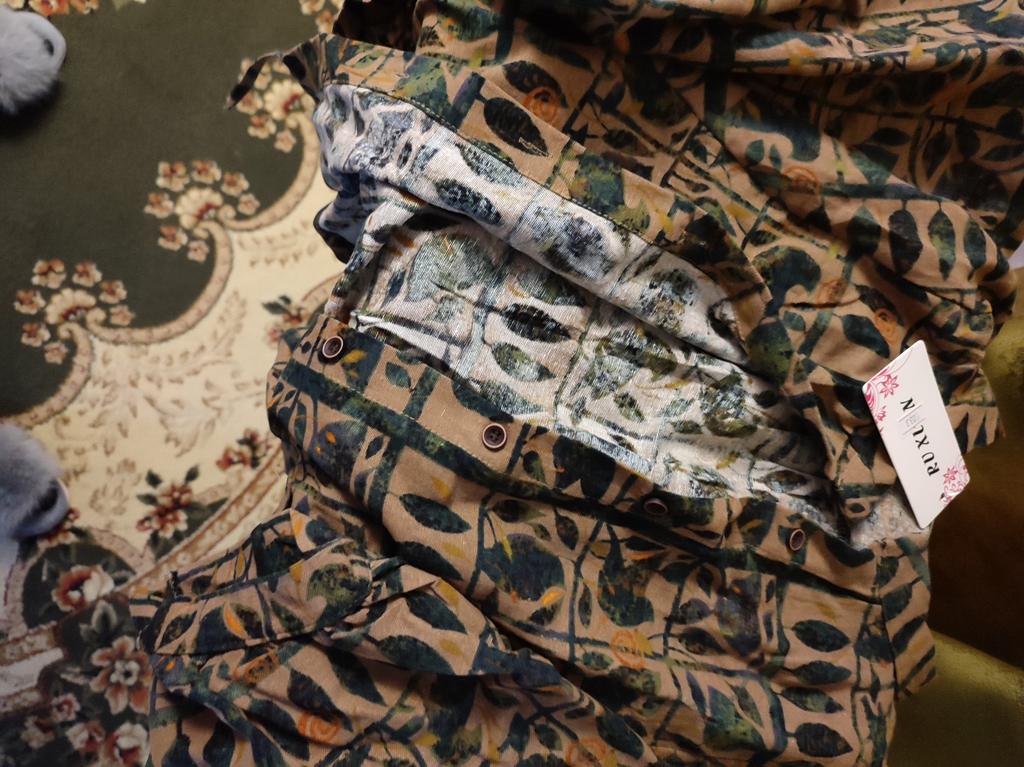 The order took 16 days. The fabric is natural. The size matches, it seems to be sewn decently. One problem is the color. In the photo of the toaara, the background is olive, with green leaves. very interesting. In life it is light brown, it looks much simpler. If it weren’t for the color, I would have given it a 5, otherwise it’s a 4. But it’s not that it’s impossible to wear or that it’s very shameful, no, it’s normal. But I wanted the color like in the picture. Fits well, not shapeless.