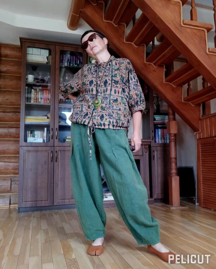 The fabric is thick, the sleeves are lanterns, short. It fits perfectly in size 50. The style in the photo is completely different