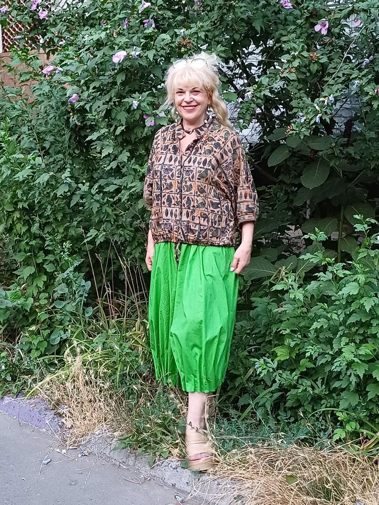 Like on a picture. The fabric is light and natural. I will wear it with a long skirt or green trousers.