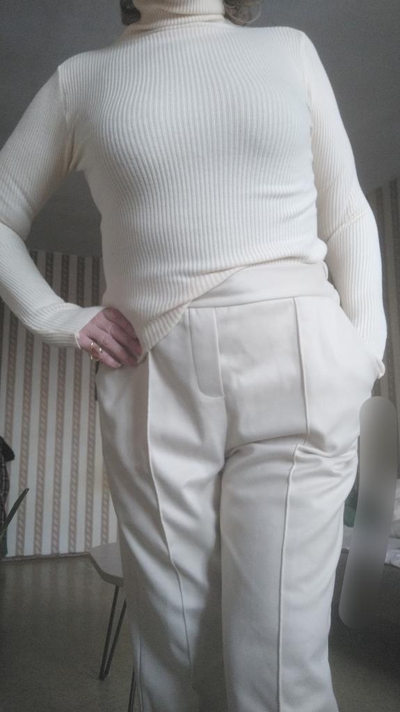 The seams are visible at the neckline when you make a turn-down, because they should be on the other side so they aren't visible. Otherwise, it's a very beautiful blue color, thin, but I think it will be warm for autumn-spring. It fits my 52 okay.