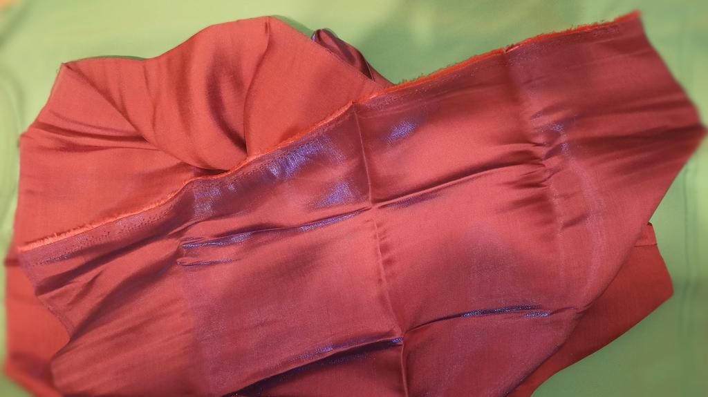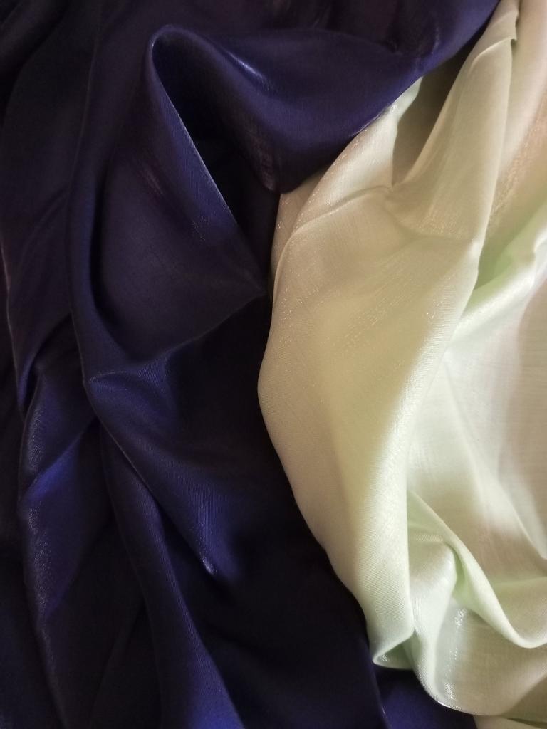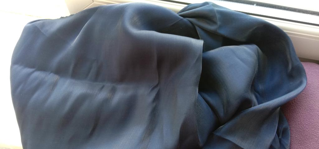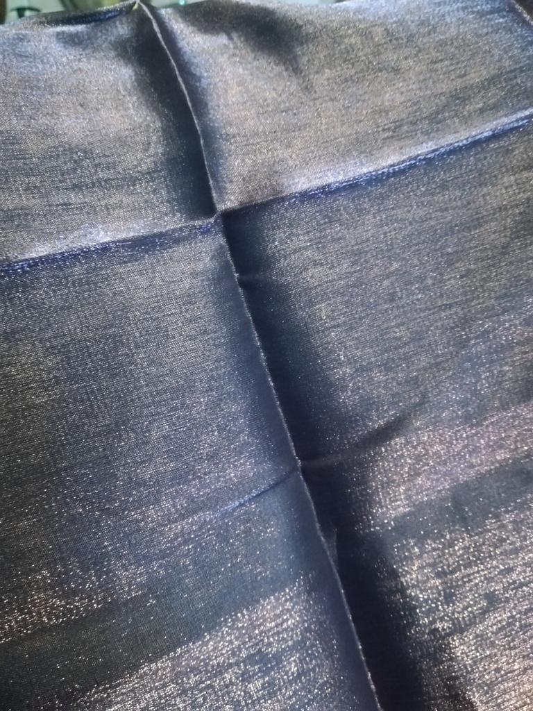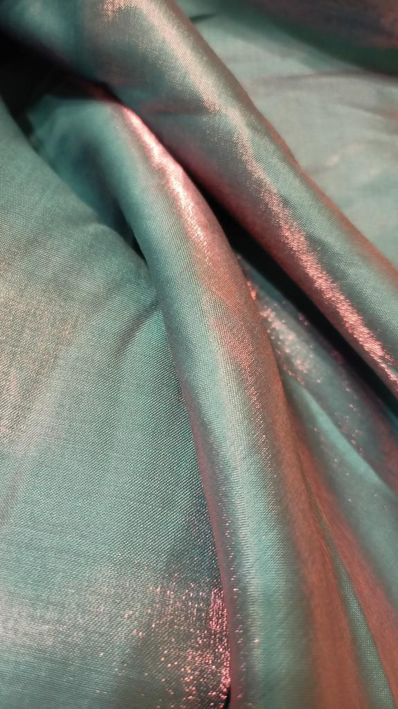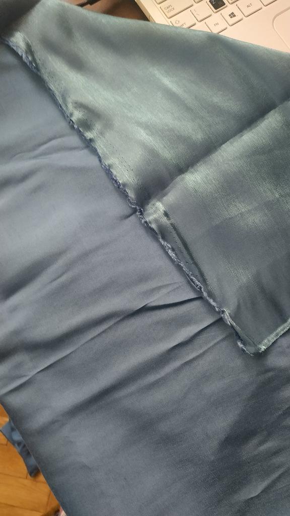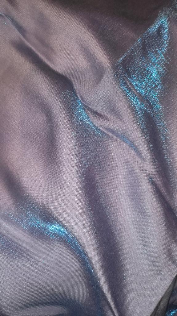 Nice fabric. Shines beautifully - base color is blue, warp yarn is shiny green. The fabric flows beautifully.