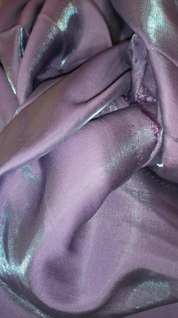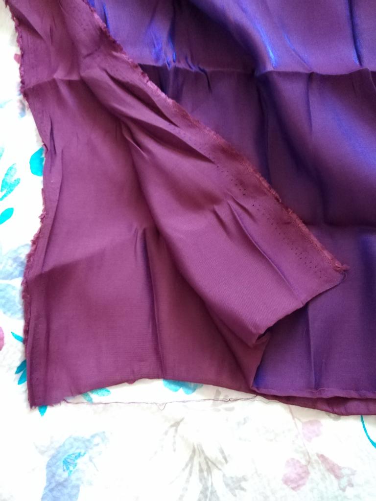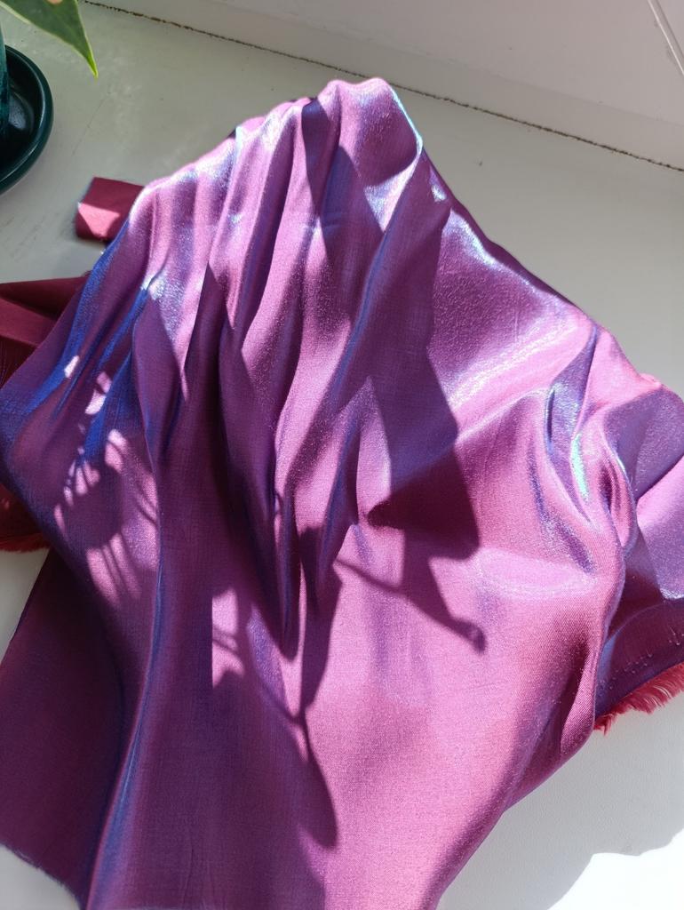 Beautiful fabric with a beautiful color gradient. The base color is a reddish purple, where bluish shiny threads are woven in for the effect. Fabric falls very flowily