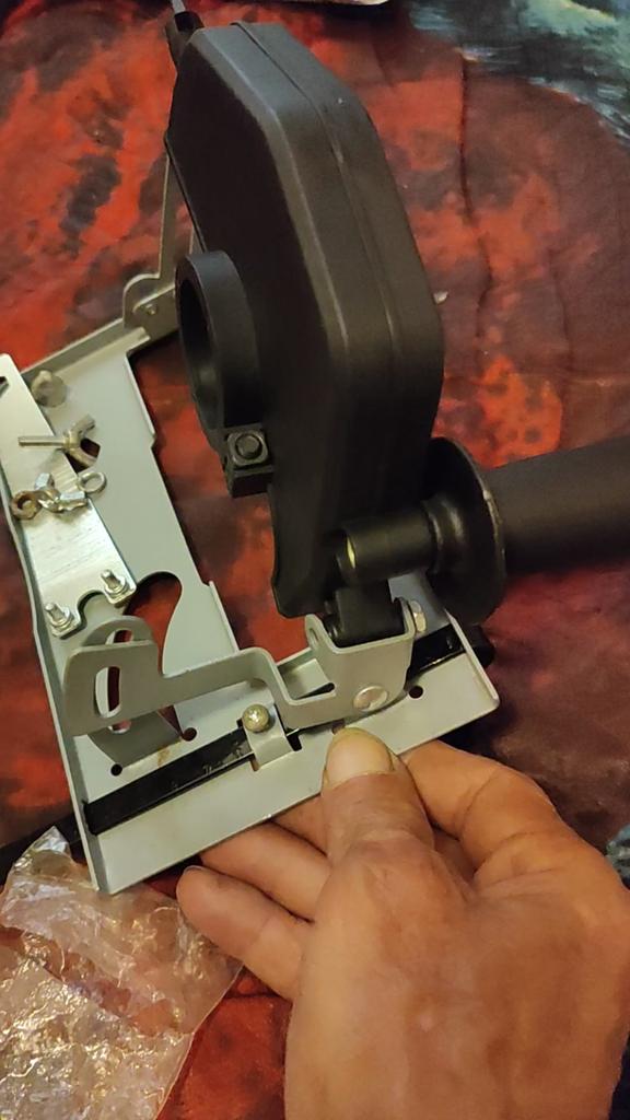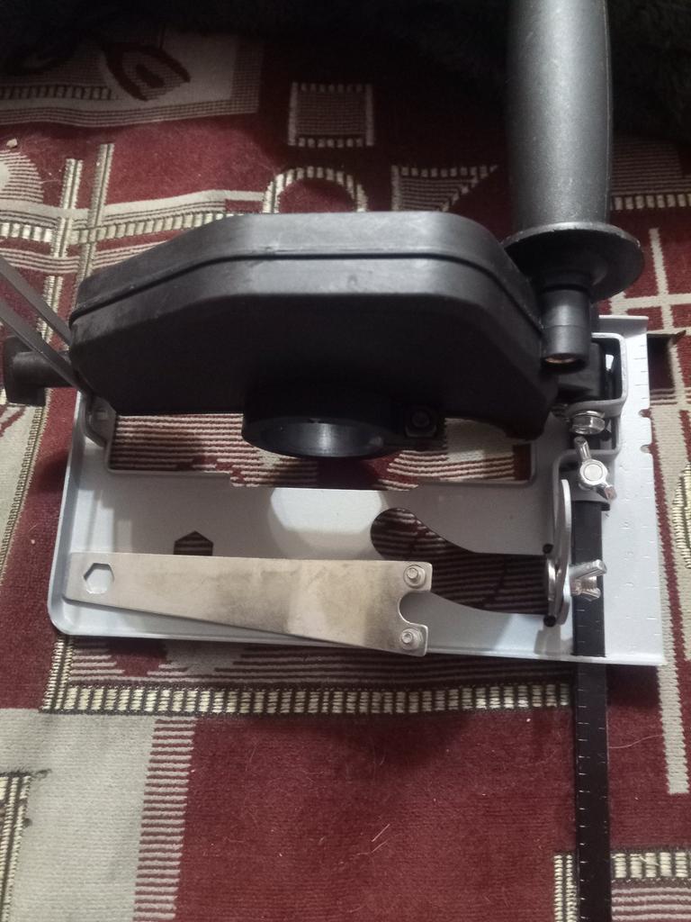 It fits the angle grinder well. The plastic disk screen moves up and down and has a 45° tilt, but only one way. The iron base is soft, but not critical. So far, it is convenient to work with.