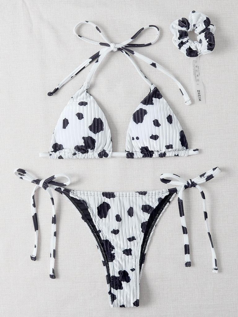 Women Sexy Triangle Oversize Split Bikini Suit Set Tie Side G-String Thong Swimsuit Halter Ribbon Dot Print
