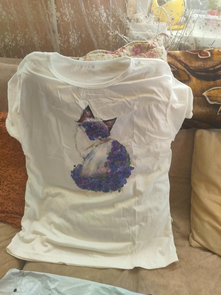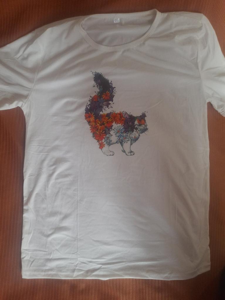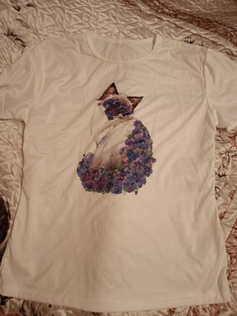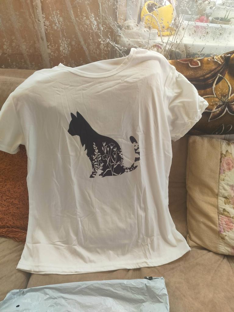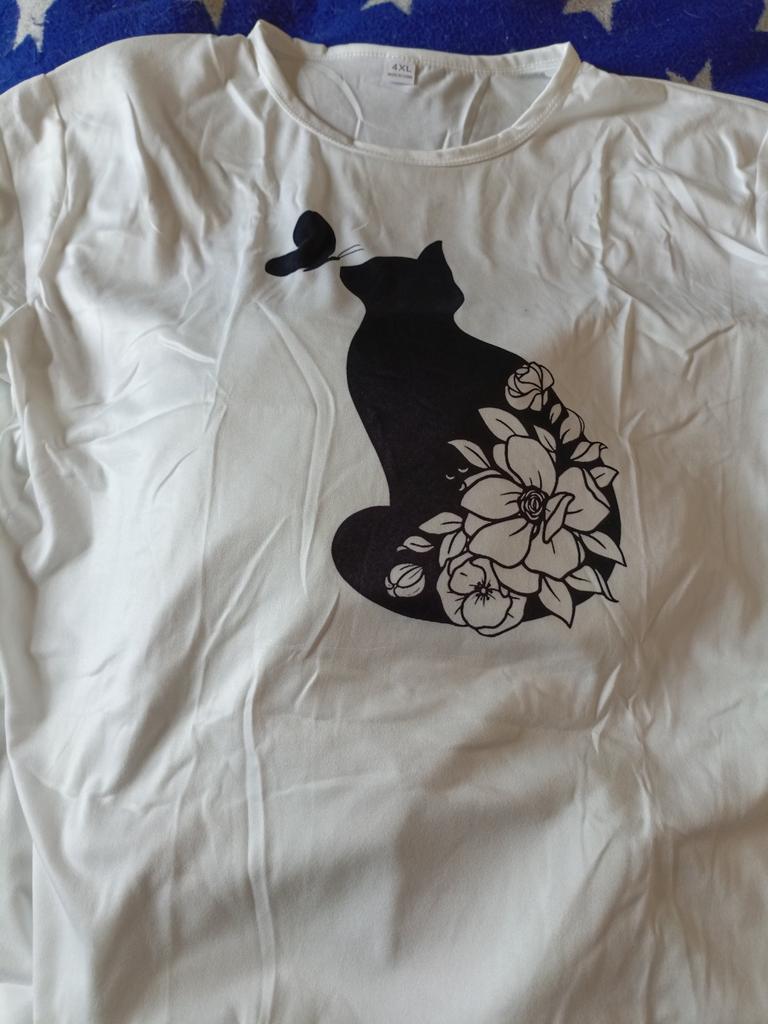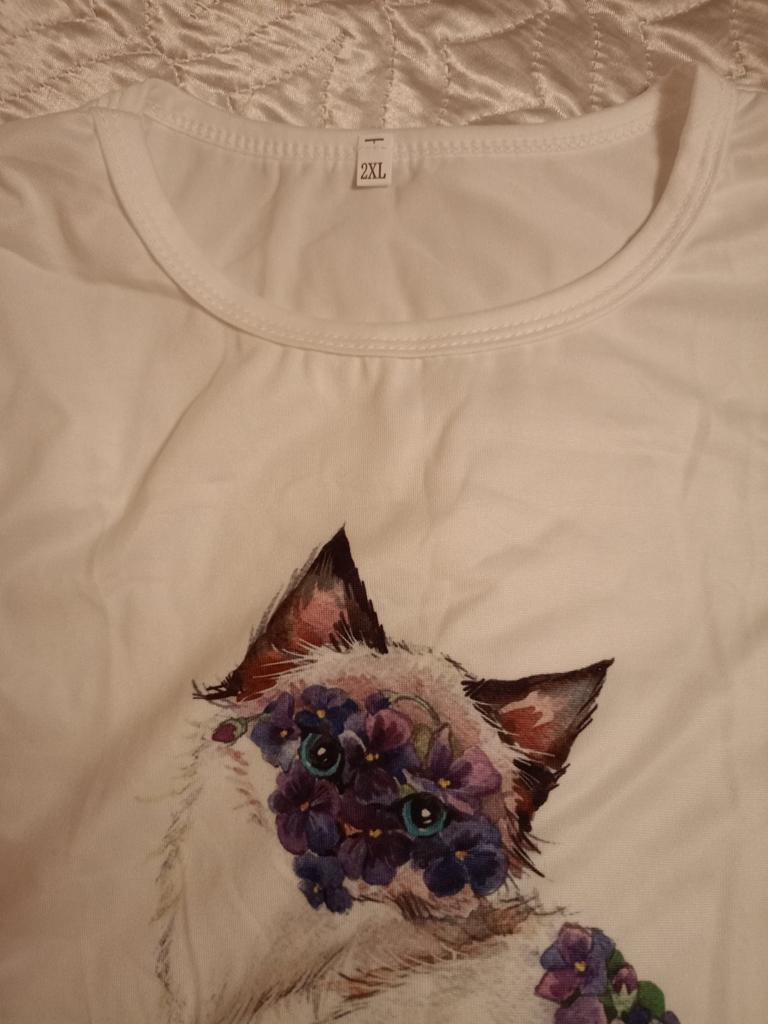 Women's t-shirt size 50-52 fits just right. The cat print is cute.