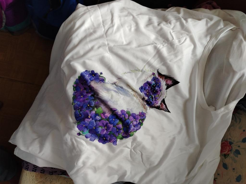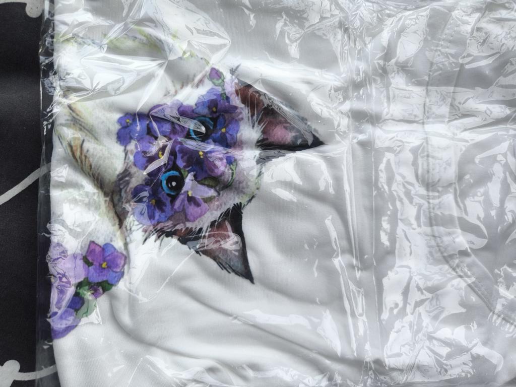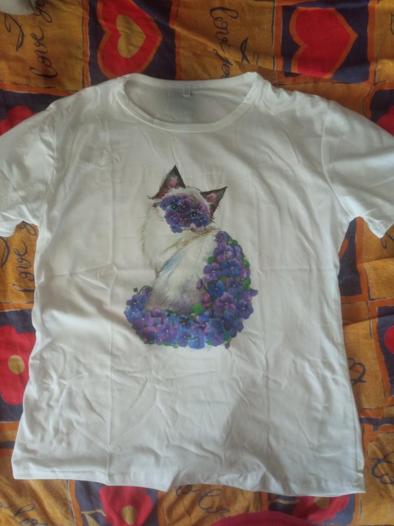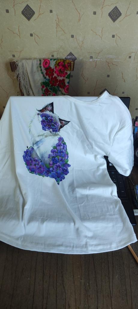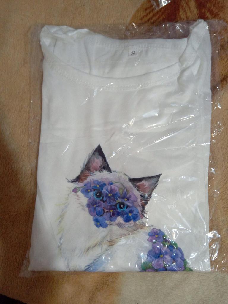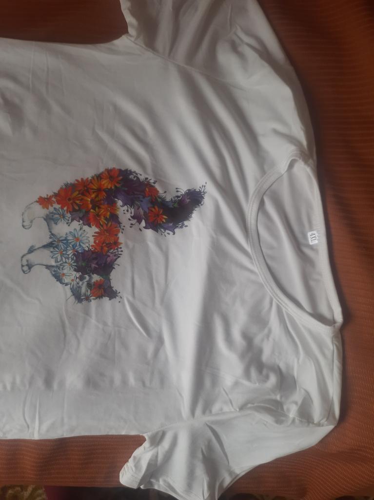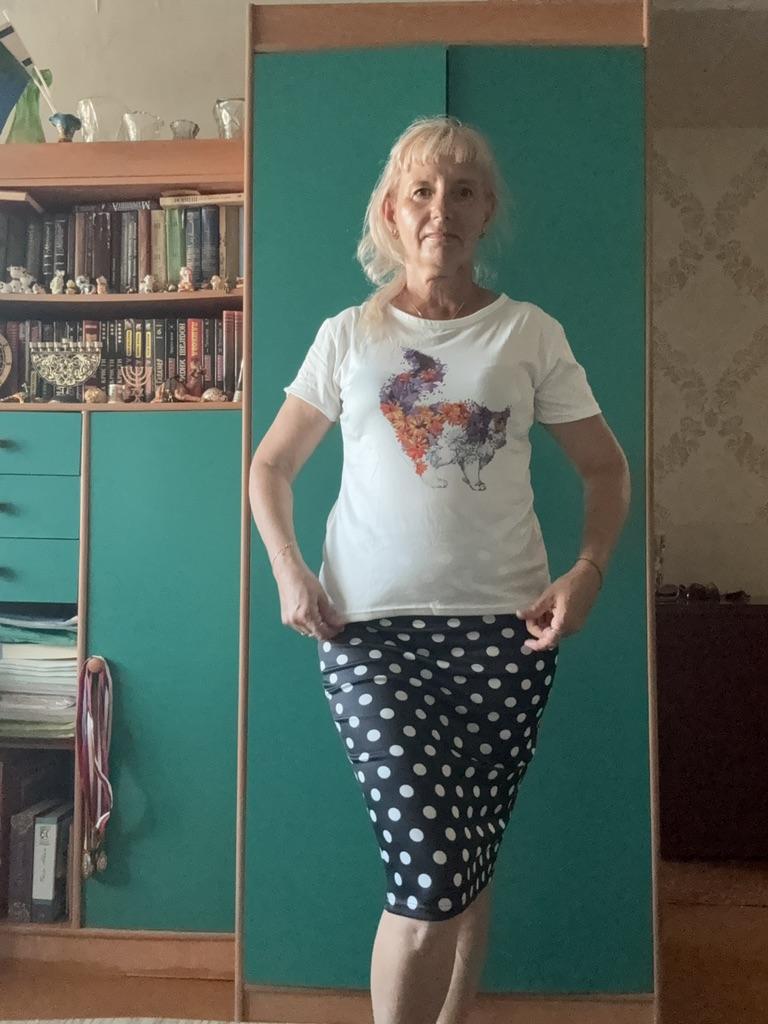 Women's t-shirt size 50-52 fits just right. The cat print is cute.