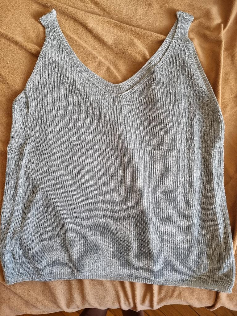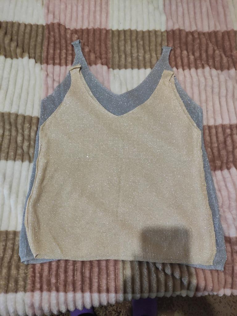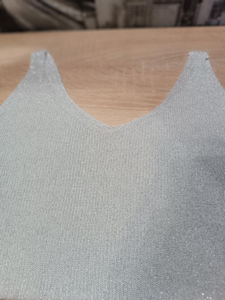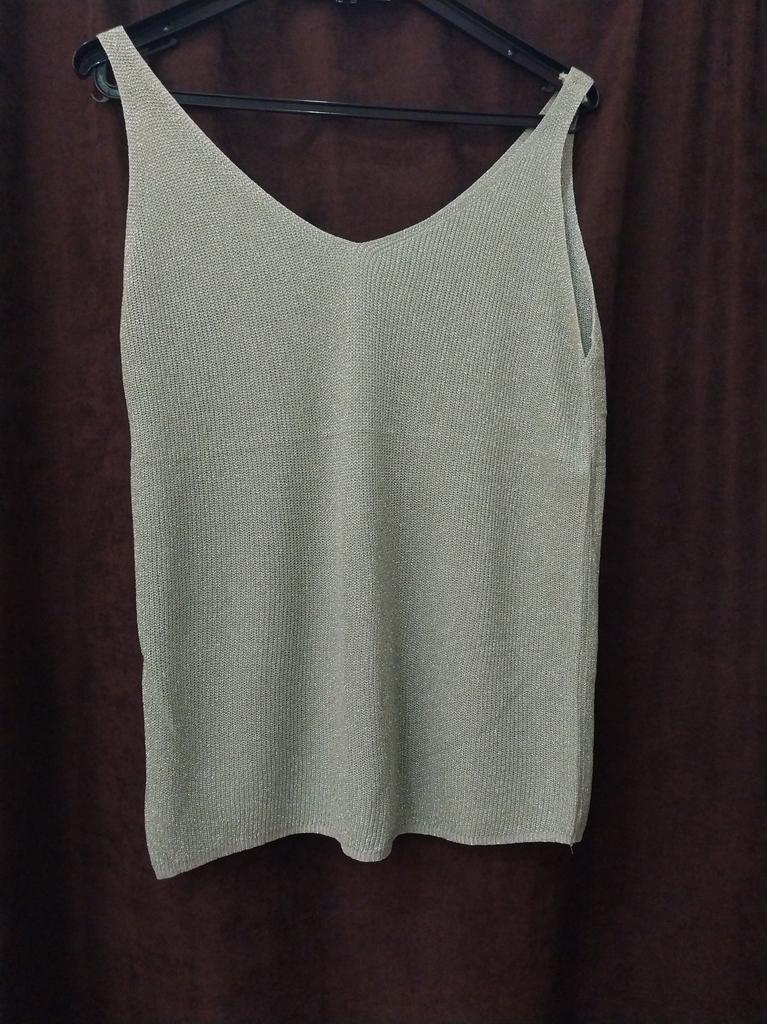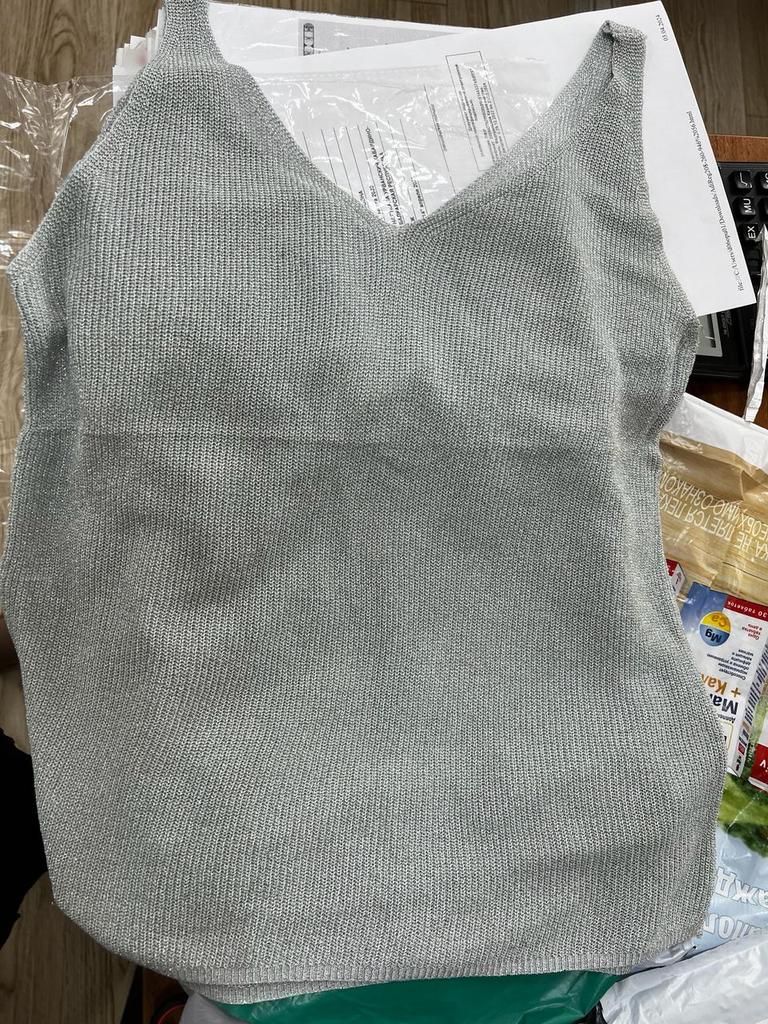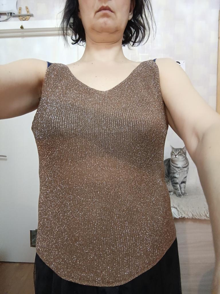 Knitted T-shirt with lurex. I ordered size L, it fits my 96-74, it's free. The neckline of the T-shirt, front and back, is the same. The knitwear is loose, light, slightly translucent. This T-shirt is good for the summer, or under jackets. Color light gray, silver. Of the minuses, the straps are sewn with an overlocker, the overlock seam extends beyond the straps. Cutting is dangerous, you have to fasten it inside. But overall everything is fine. A budget T-shirt will always come in handy.
