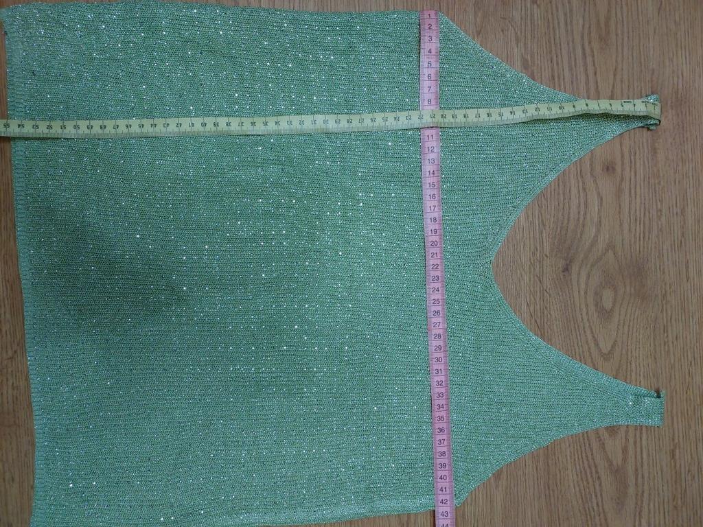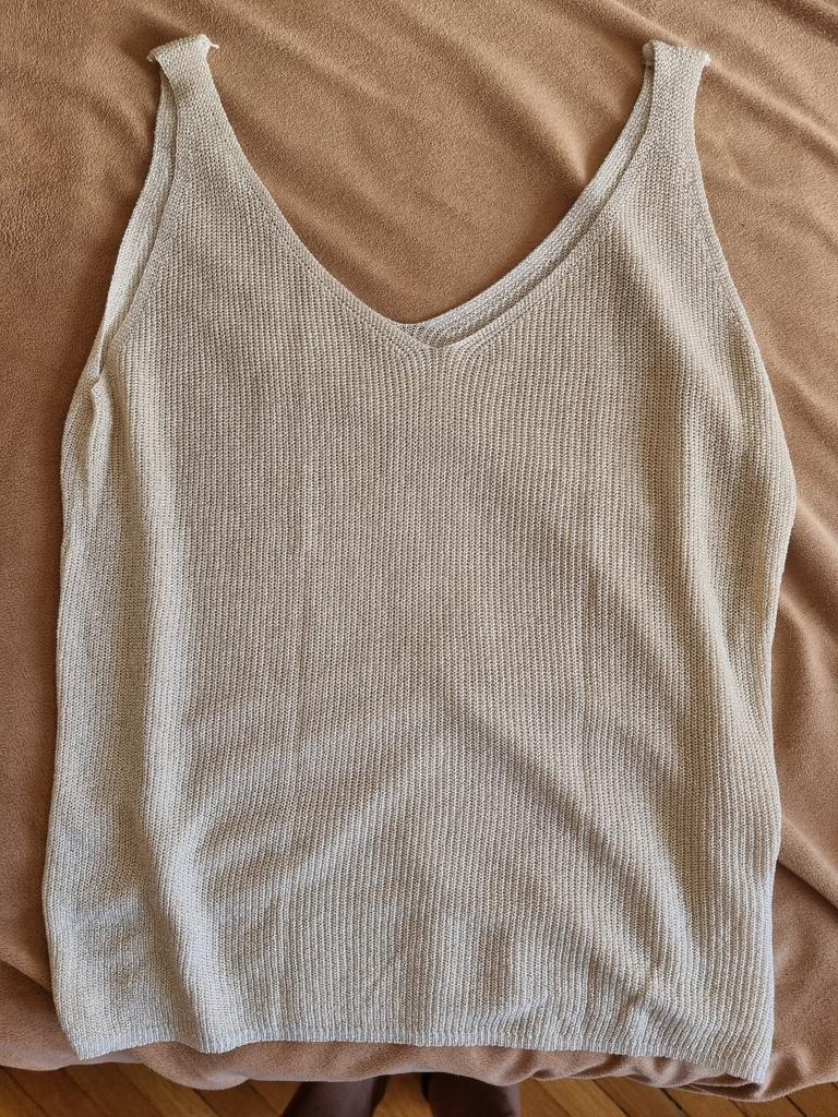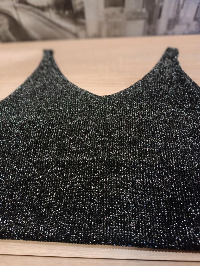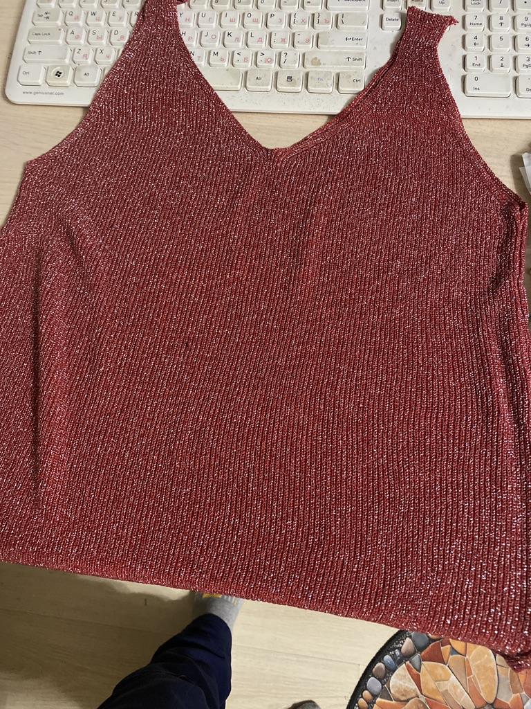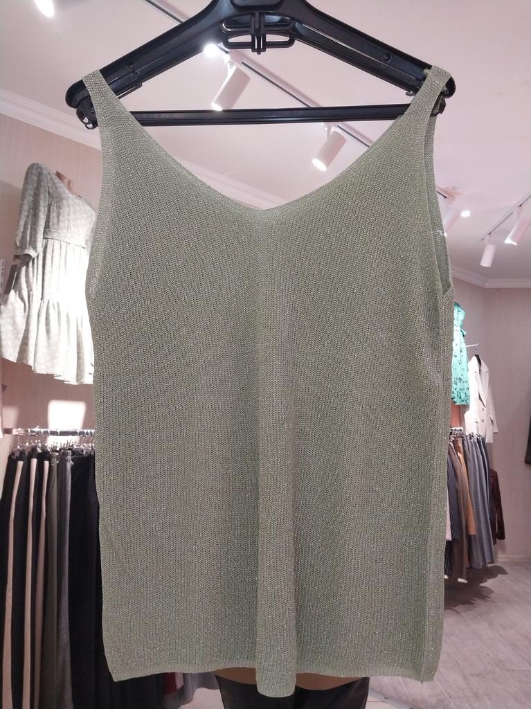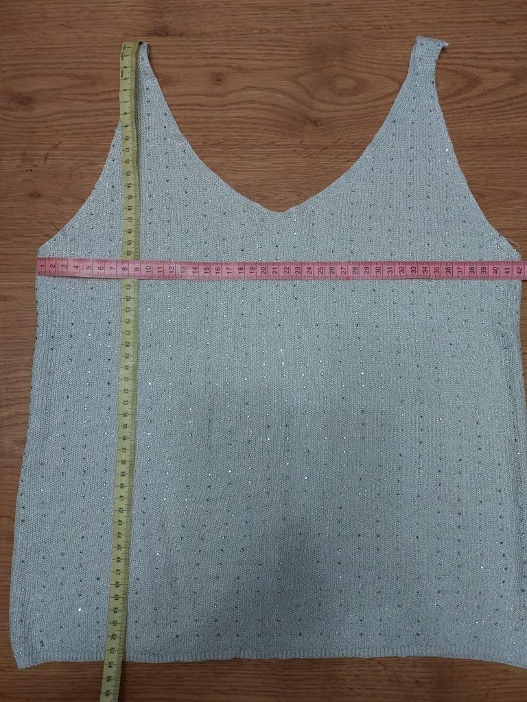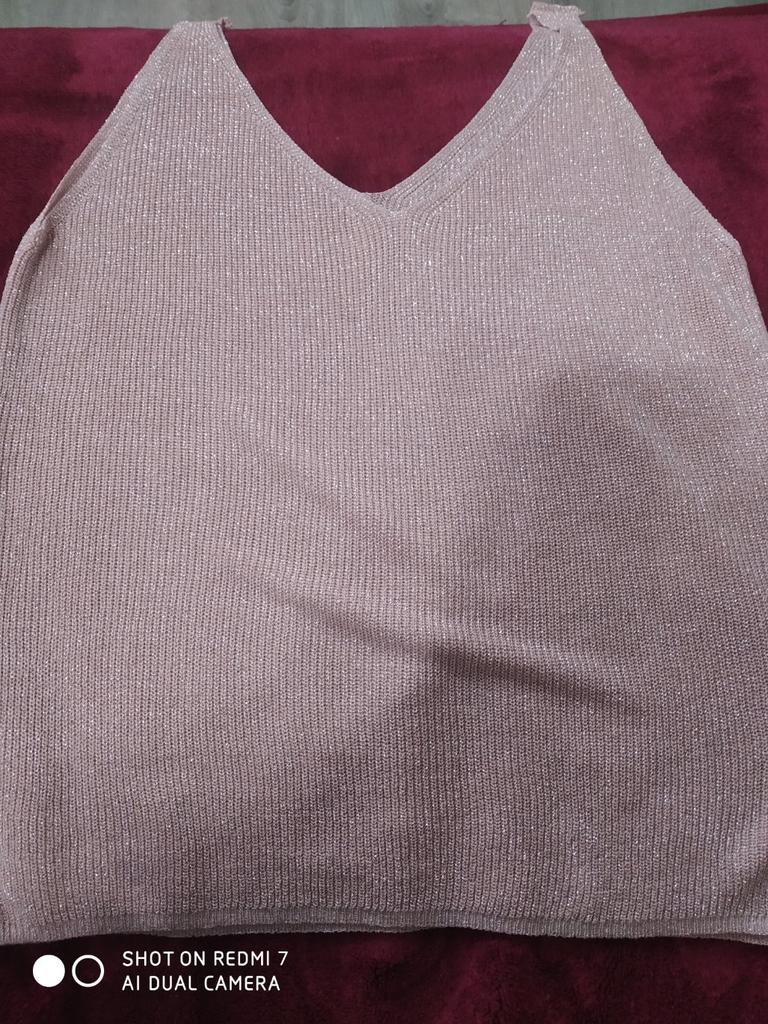 Knitted T-shirt with lurex. I ordered size L, it fits my 96-74, it's free. The neckline of the T-shirt, front and back, is the same. The knitwear is loose, light, slightly translucent. This T-shirt is good for the summer, or under jackets. Color light gray, silver. Of the minuses, the straps are sewn with an overlocker, the overlock seam extends beyond the straps. Cutting is dangerous, you have to fasten it inside. But overall everything is fine. A budget T-shirt will always come in handy.