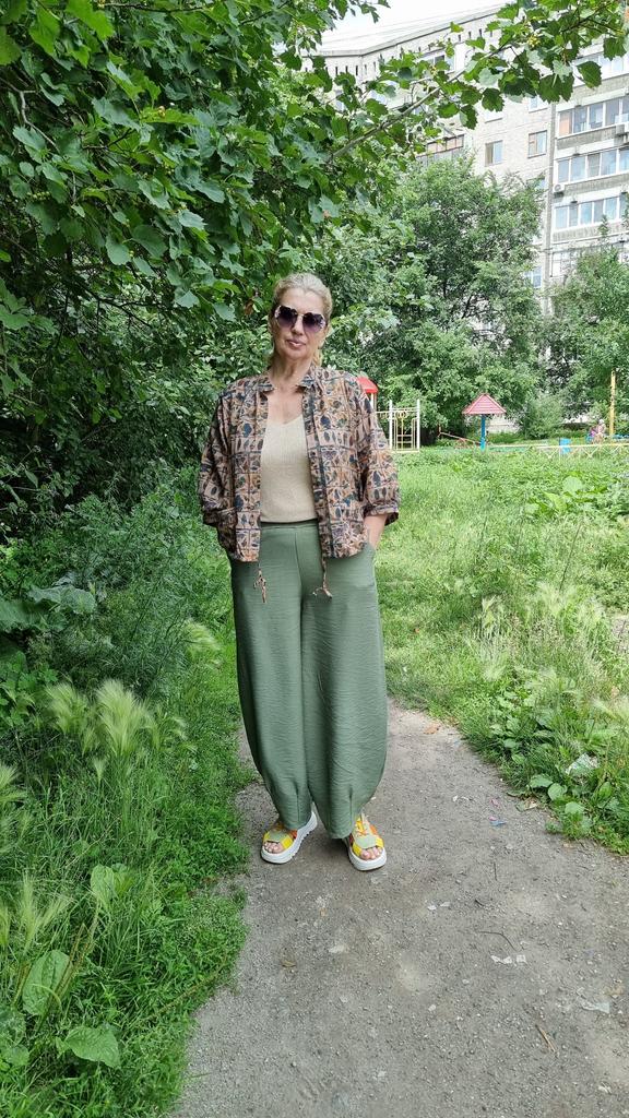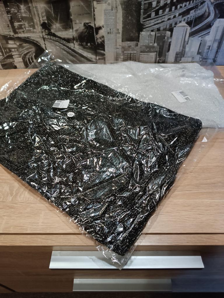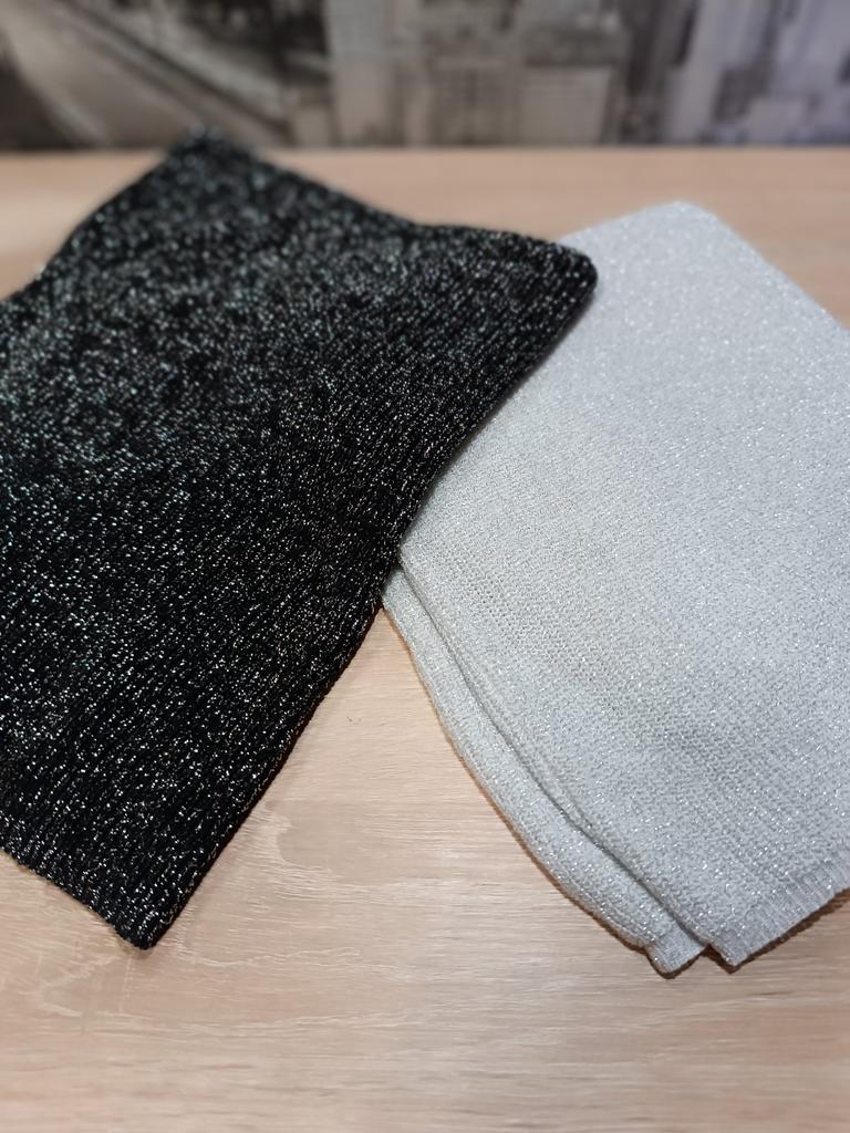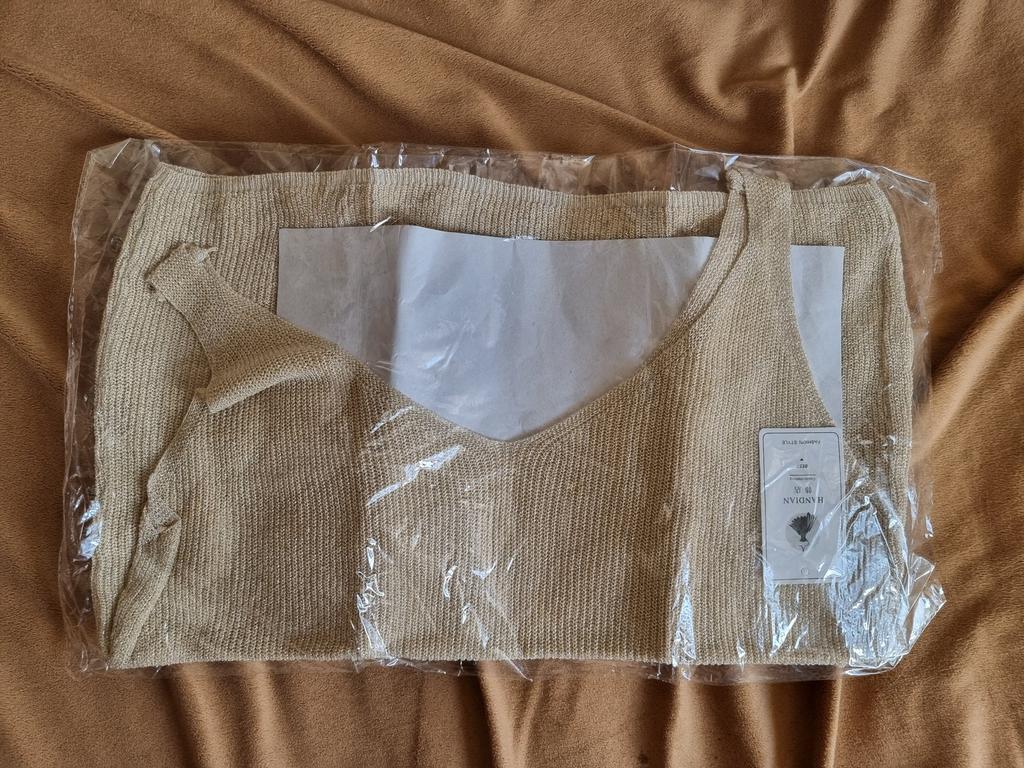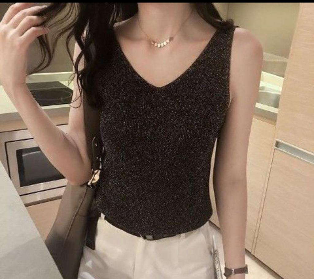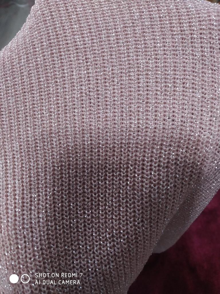 Knitted T-shirt with lurex. I ordered size L, it fits my 96-74, it's free. The neckline of the T-shirt, front and back, is the same. The knitwear is loose, light, slightly translucent. This T-shirt is good for the summer, or under jackets. Color light gray, silver. Of the minuses, the straps are sewn with an overlocker, the overlock seam extends beyond the straps. Cutting is dangerous, you have to fasten it inside. But overall everything is fine. A budget T-shirt will always come in handy.