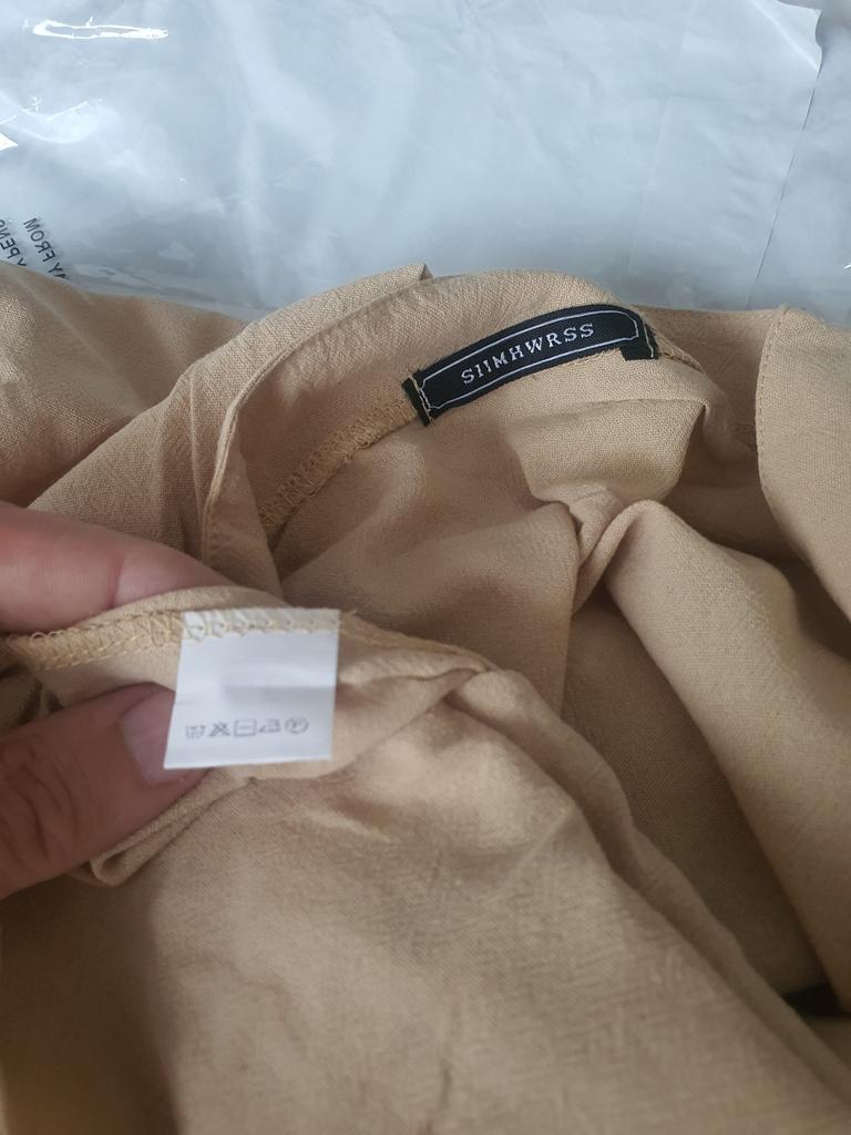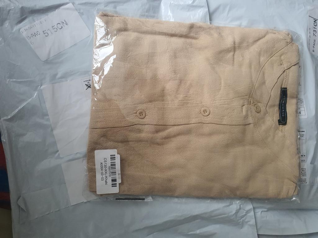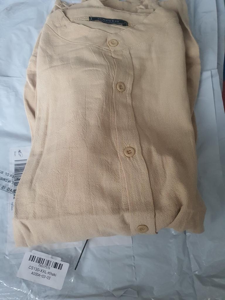 In the description, it says "Khaki" for a shirt, rather white/beige, the one in the photo and I receive a shirt that is neither beige/white nor khaki. with mini patterns on it that I did not see in the photo, nor in the description. The size M is correct while I usually wear L. Not sure that the buttons will last very long.