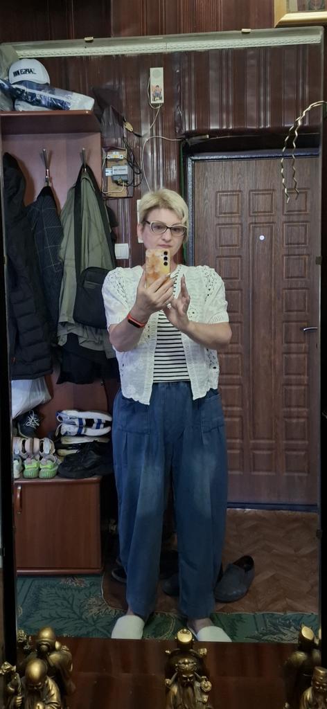 I was very satisfied with the cardigan. It is sewn neatly. The product is natural cotton, and it looks loose on a size 48, very refreshing due to the white color. Thank you to the manufacturer..