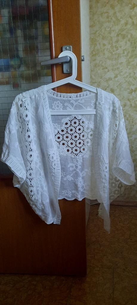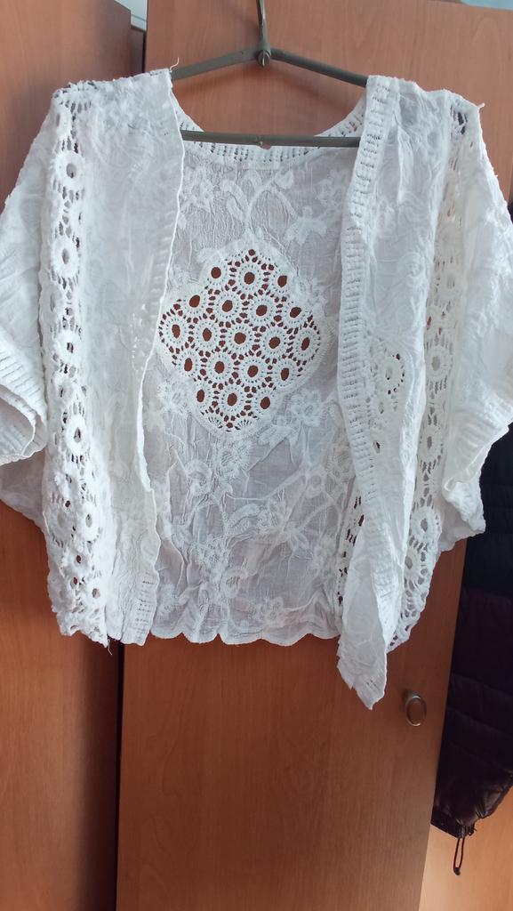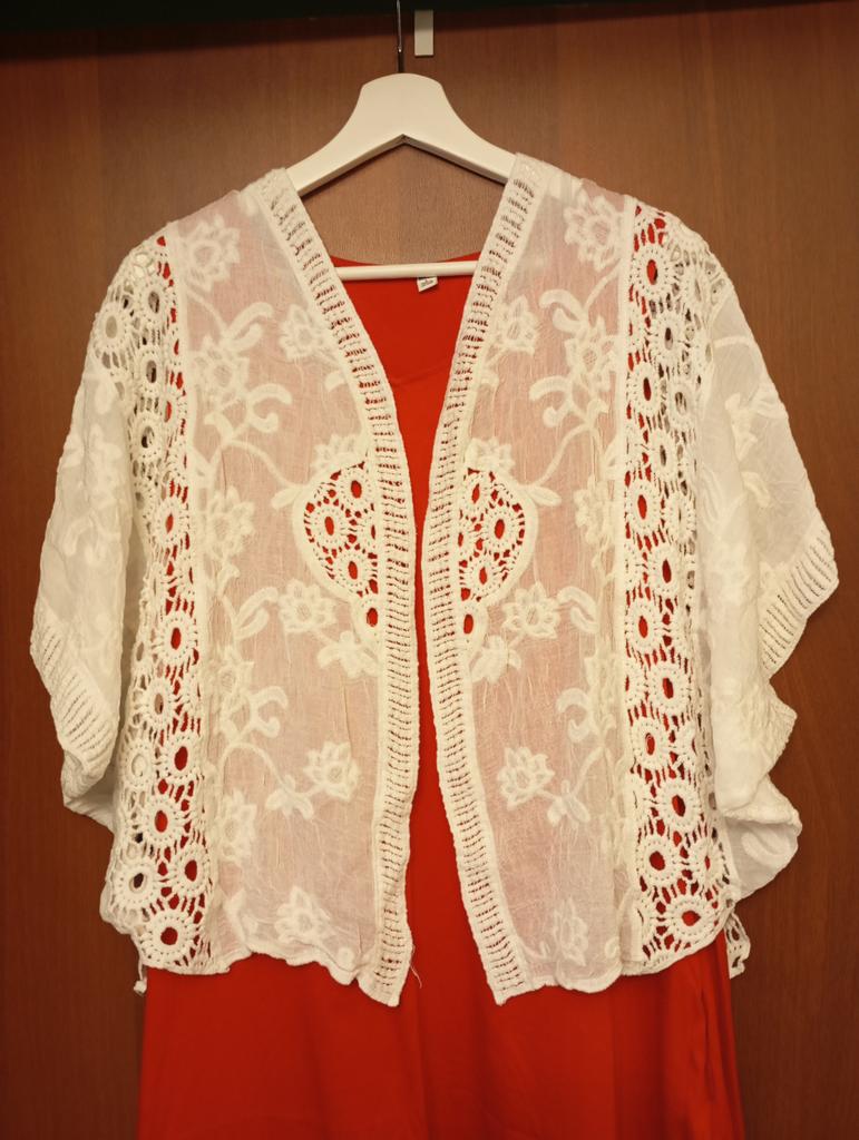 The bolero is lovely, natural cotton. It fits my size 50. I recommend it.