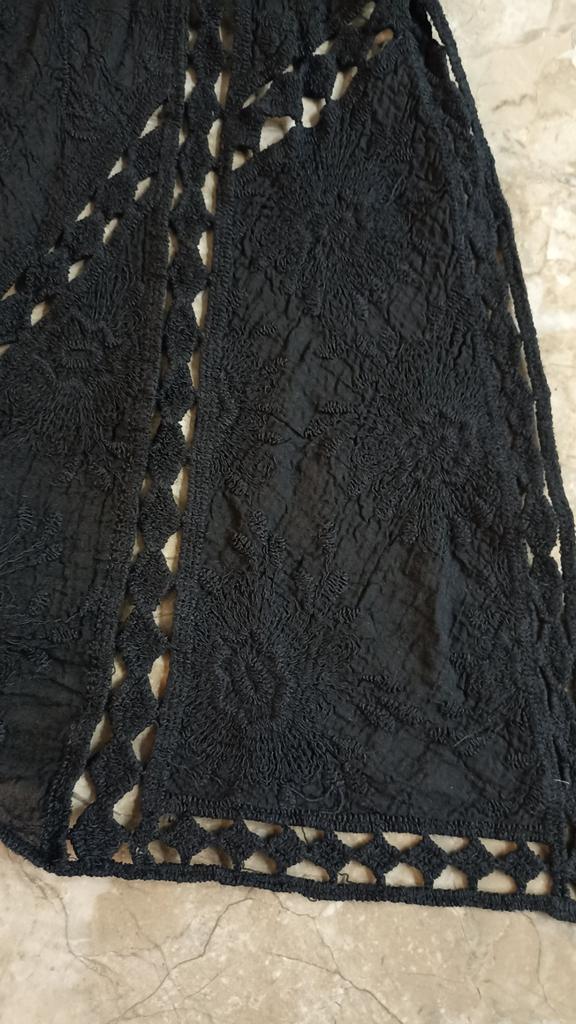 Very delicate. Beautiful pattern, fits 50 without problems. The fabric is thin. Nice, just right for summer.