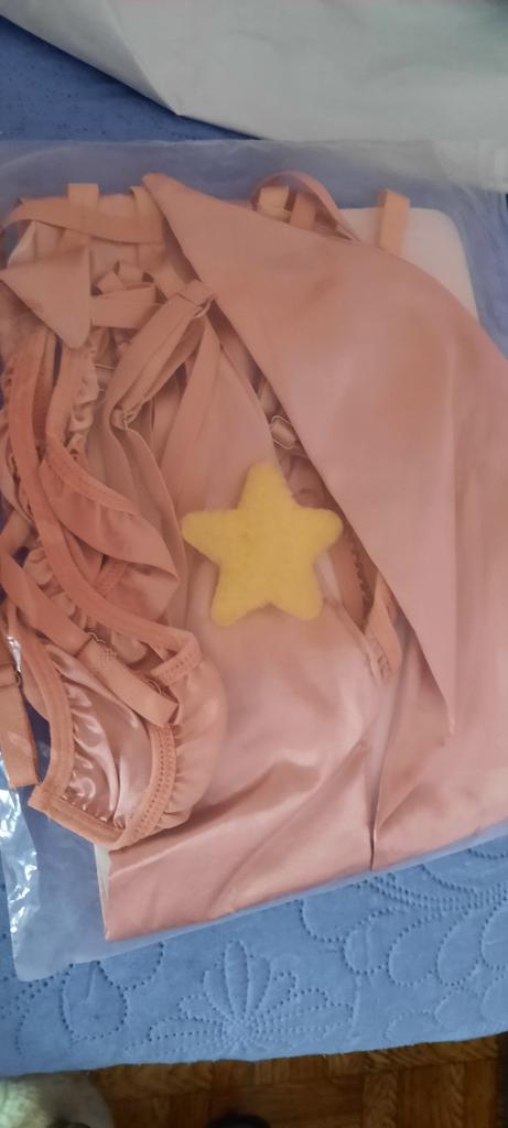 A superb set. It looks very good. I got it a size or two bigger, but thanks to the flexible straps it fits just right. The order was properly packed and plus a small gift a star clip, very nice from the seller. I recommend!