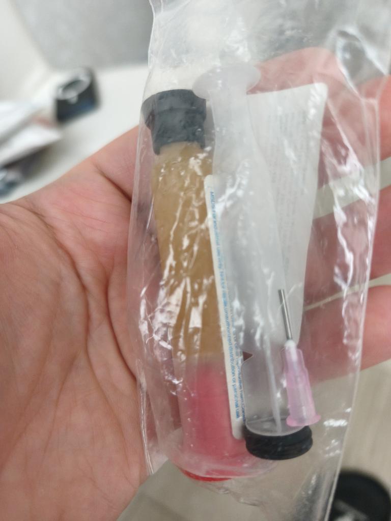 There is no needle for the syringe in the kit; instead of a piston, they put an empty 10 cc syringe in